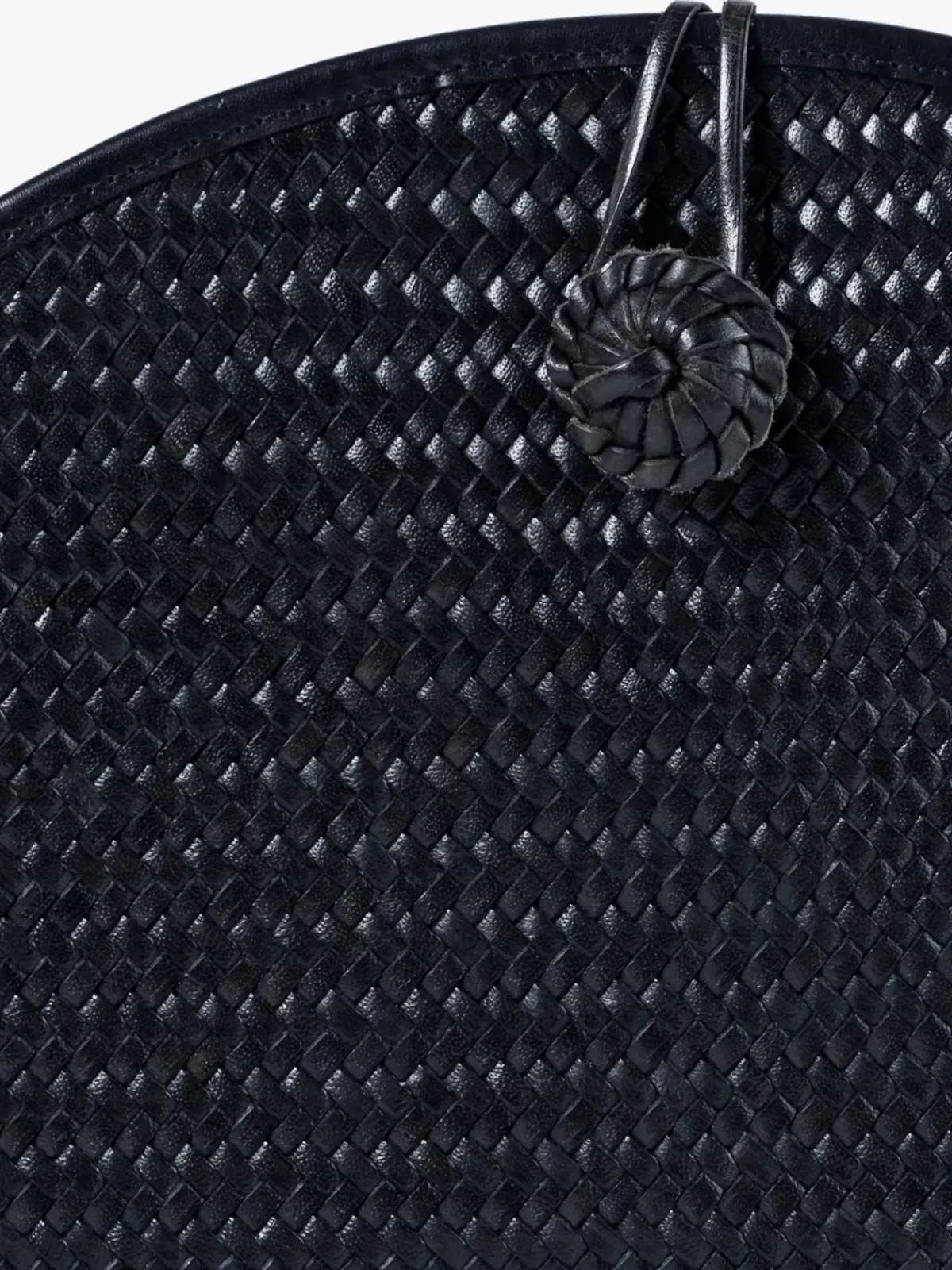 Our Adriana Castro La Barca in Black features a structured half-moon silhouette with a curved top and a straight bottom. This clutch bag is detailed with a canvas lining, a loop and leather button closure, and an interior slip pocket. Handcrafted by artisans in Colombia.