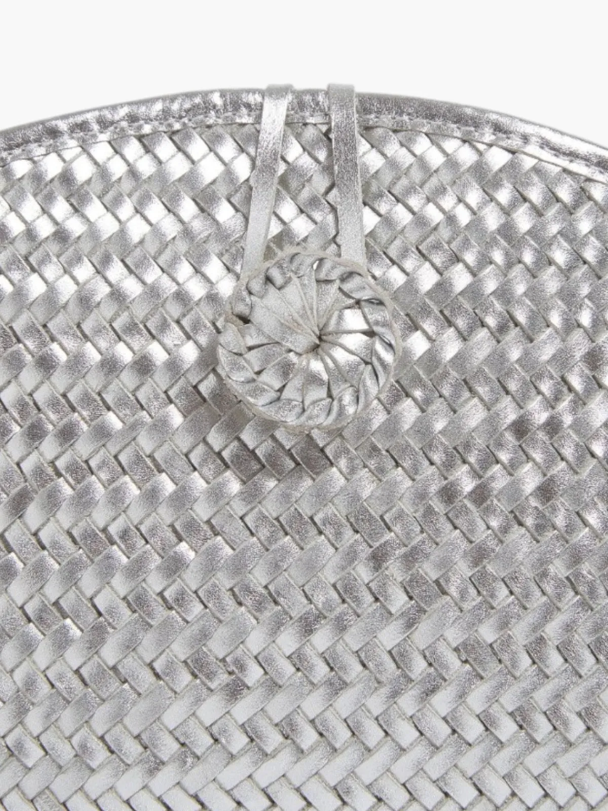 Our Adriana Castro La Barca Mini in Silver features a structured half-moon silhouette with a curved top and a straight bottom. This clutch bag is detailed with a canvas lining, a loop and leather button closure, and a mini interior pocket. Handcrafted by artisans in Colombia.