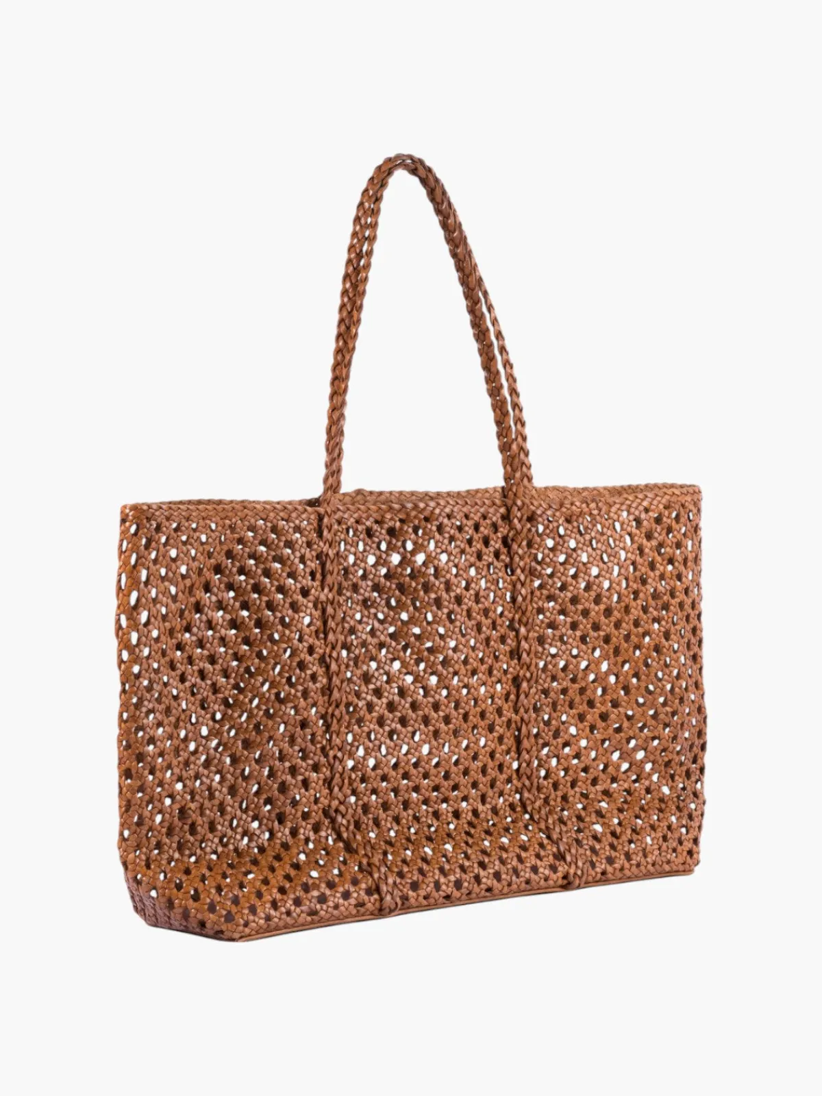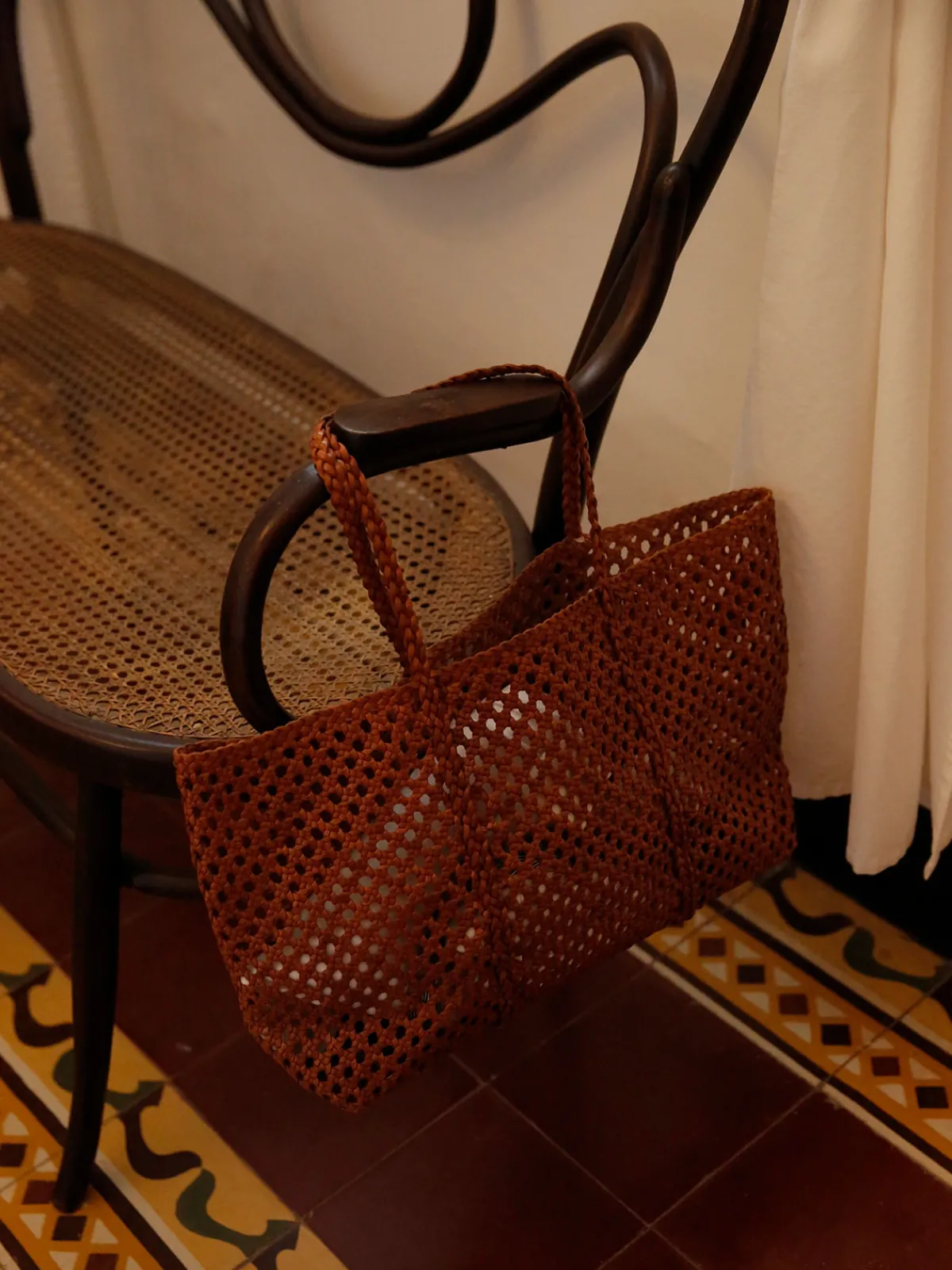 Our Adriana Castro La Cesta in Cognac is a large tote with open mesh pattern with braided handles. The bag is inspired by the weave of the rocking chairs found in the towns along the Magdalena River. Handcrafted by artisans in Colombia.