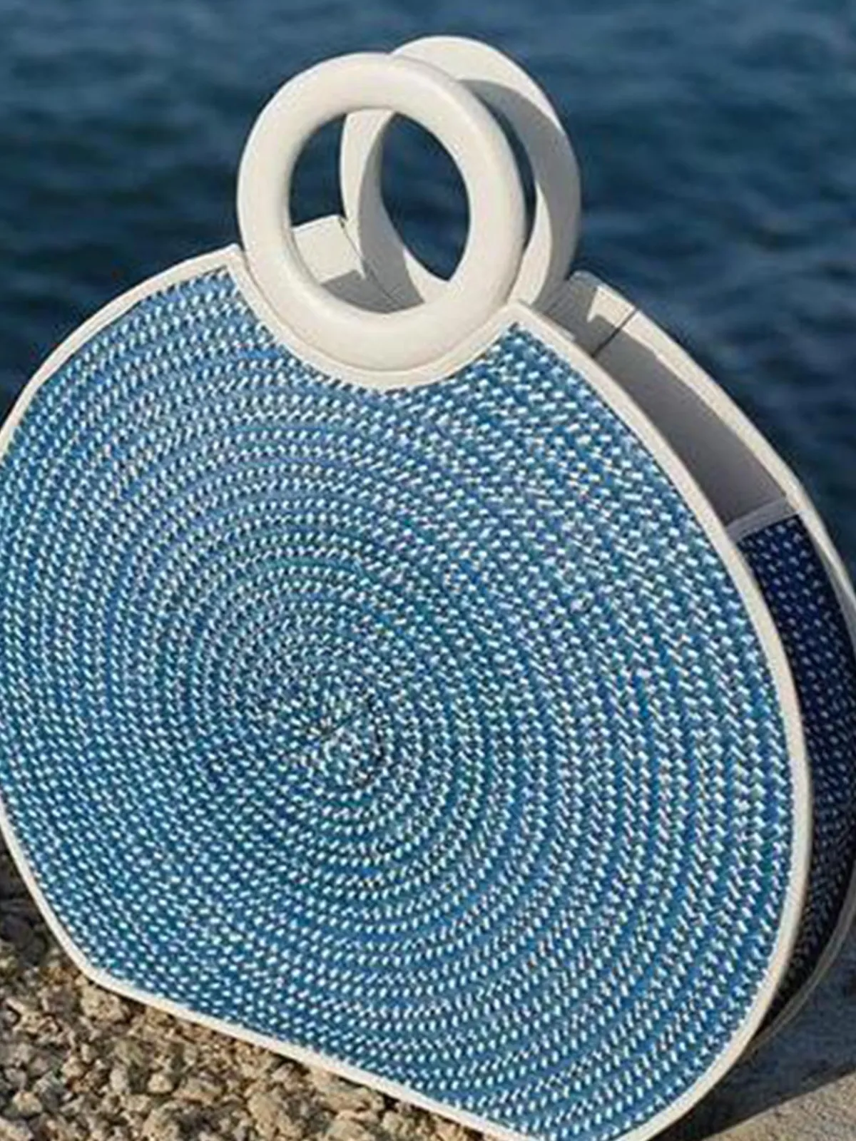 Our Adriana Castro Zenu Large Handbag in Leather and Cana Flecha in Blue is oversized in a round silhouette with a flat bottom and round top handles. This distinctive satchel is detailed with a canvas fabric lining and an interior pocket to hold small items. Handcrafted by artisans in Colombia.