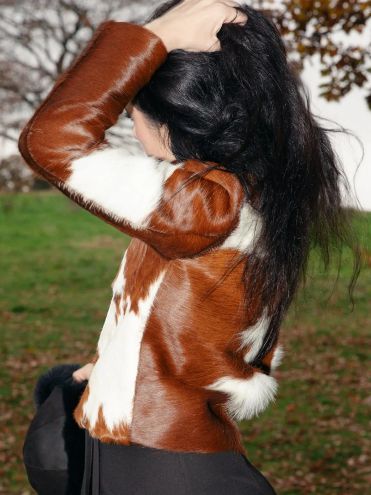 Our BABA Kobbie Jacket in Cowhide embodies a refined minimalist design, elevated by bold, statement-making details. Crafted from heavyweight materials, it offers a structured silhouette that enhances its tailored fit. The classic collar and sleek zip closure lend a timeless appeal, while strong, defined shoulders add a sense of power and poise. Denim jacket-inspired front pockets introduce a subtle nod to casual sophistication, seamlessly blending utility with style. Finishing at the waistline, the semi-cropped length accentuates the fitted body, creating a sharp and modern silhouette. Crafted from naturally dyed reclaimed materials and meticulously sewn by artisans in East London, United Kingdom.