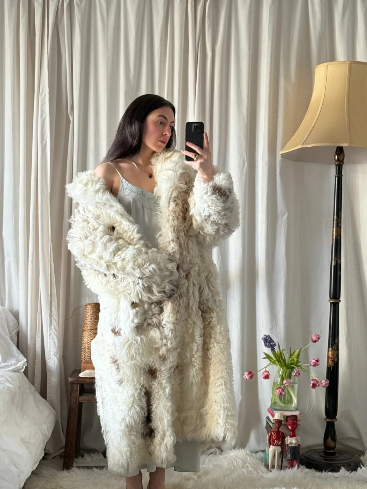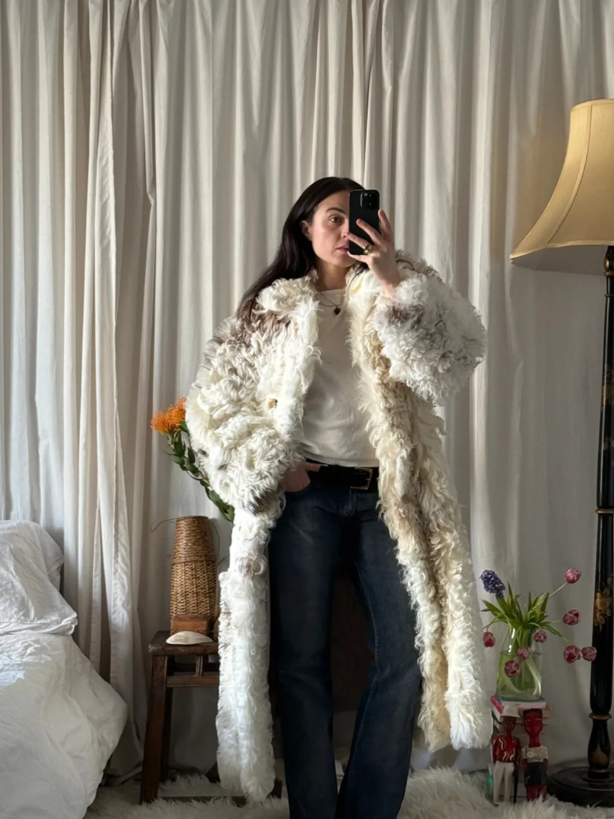 Our BABA Mason Coat is the perfect oversized statement coat with a curly-hair shearling outer and a soft leather inner. Features a double breasted silhouette tailored to be worn opened or buttoned to the collar and finished with invisible pockets at the sides. Crafted from naturally dyed reclaimed materials and meticulously sewn by artisans in East London, United Kingdom.