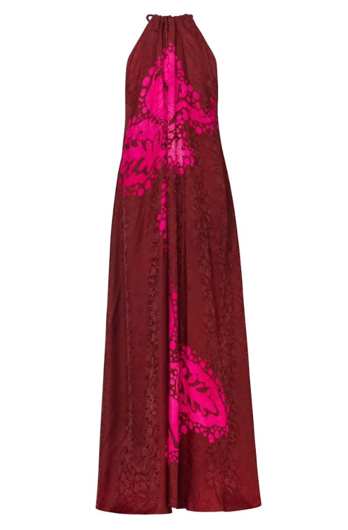Our Beatriz Camacho Bloom Dress is a maxi dress with a halter neckline. The Bloom Dress has a beautiful A-shape that brings comfort and elegance. It has the perfect combination of deep red with magenta details. Handcrafted by artisans in Colombia.