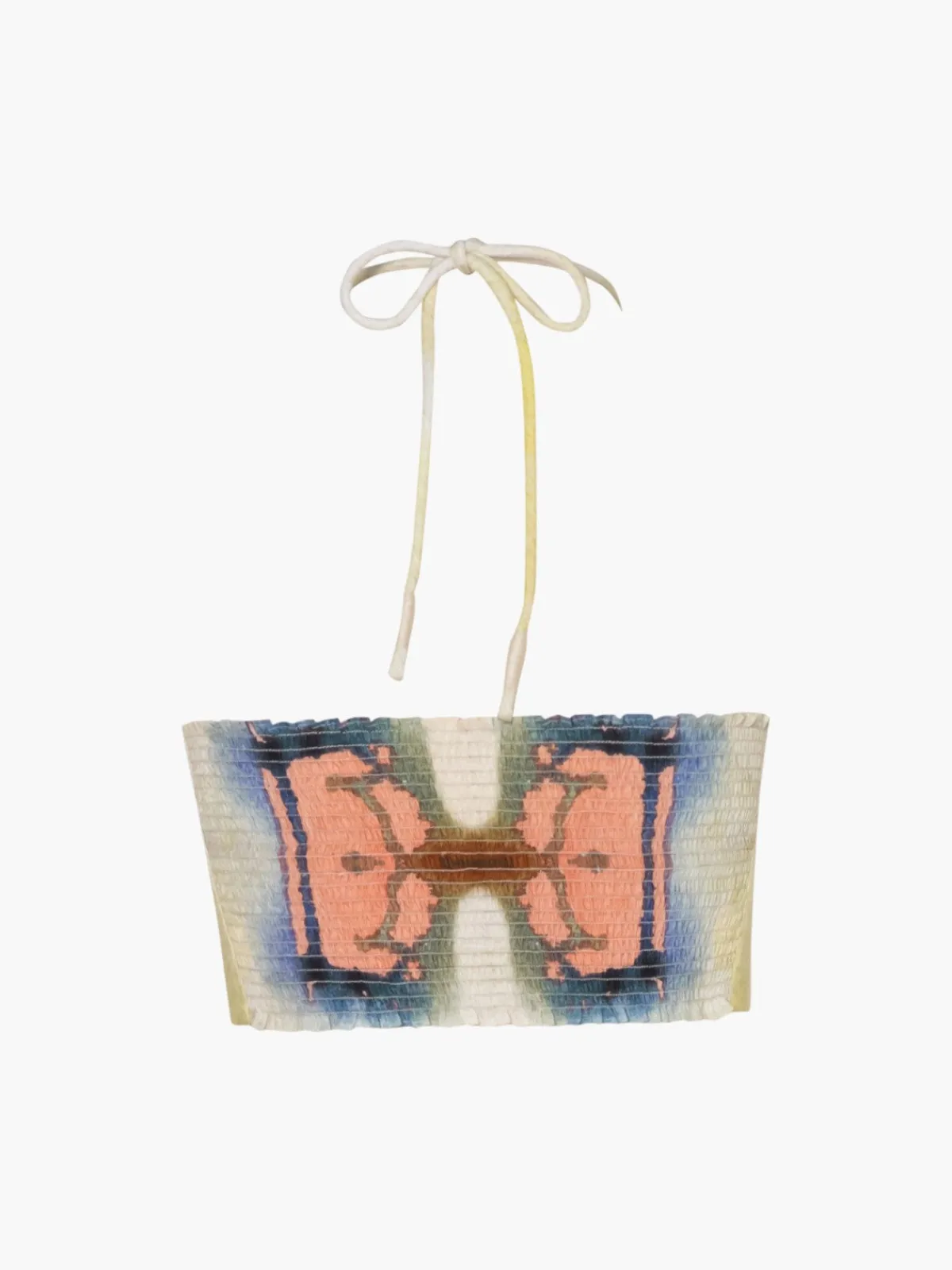 Our Beatriz Camacho Ona Top is a halter style top that can be adjusted at the back of the neck. The front of the top has a slight draping detail and a scrunched back. Handcrafted by artisans in Colombia.