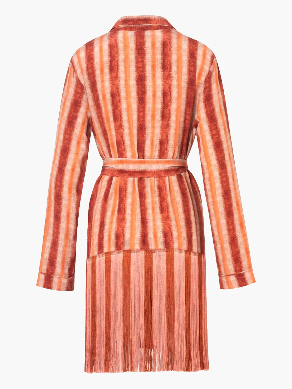 Our Beatriz CamachoTeu Shirt is a delicate silk shirt with a fringe detail and belt made of the same silk material. Handcrafted by artisans in Colombia.