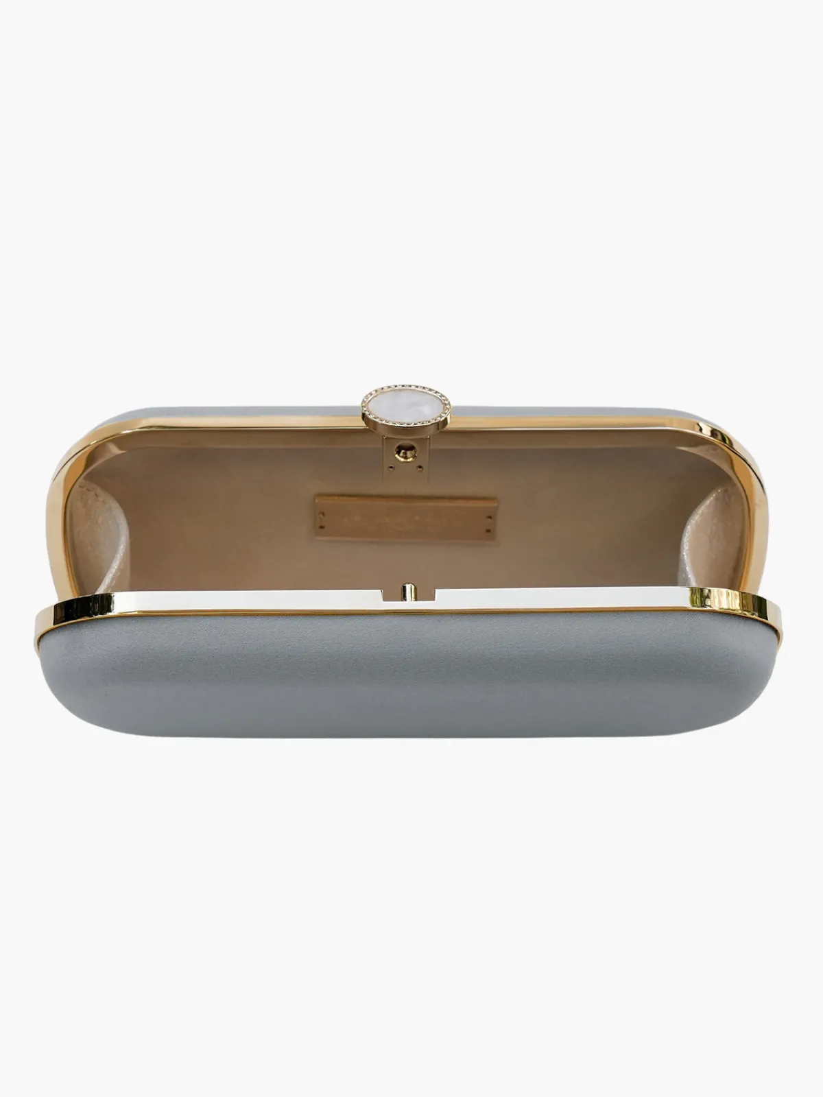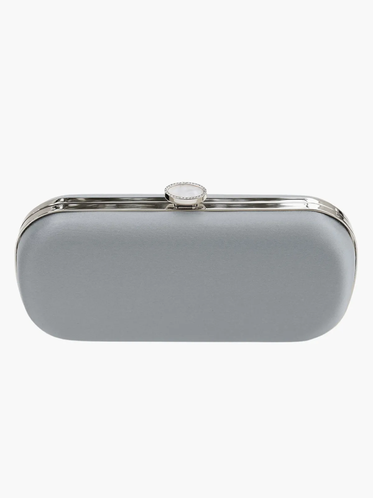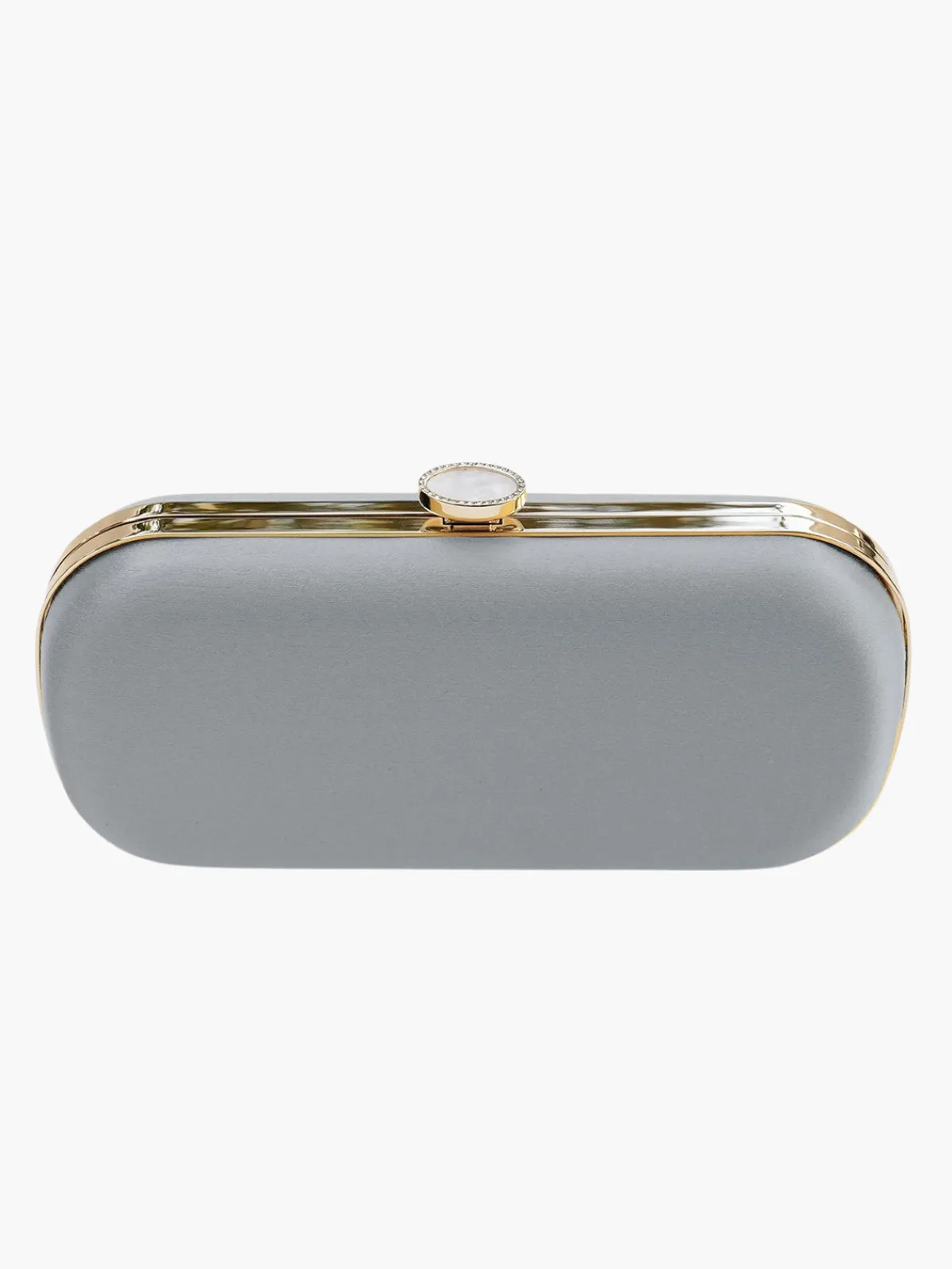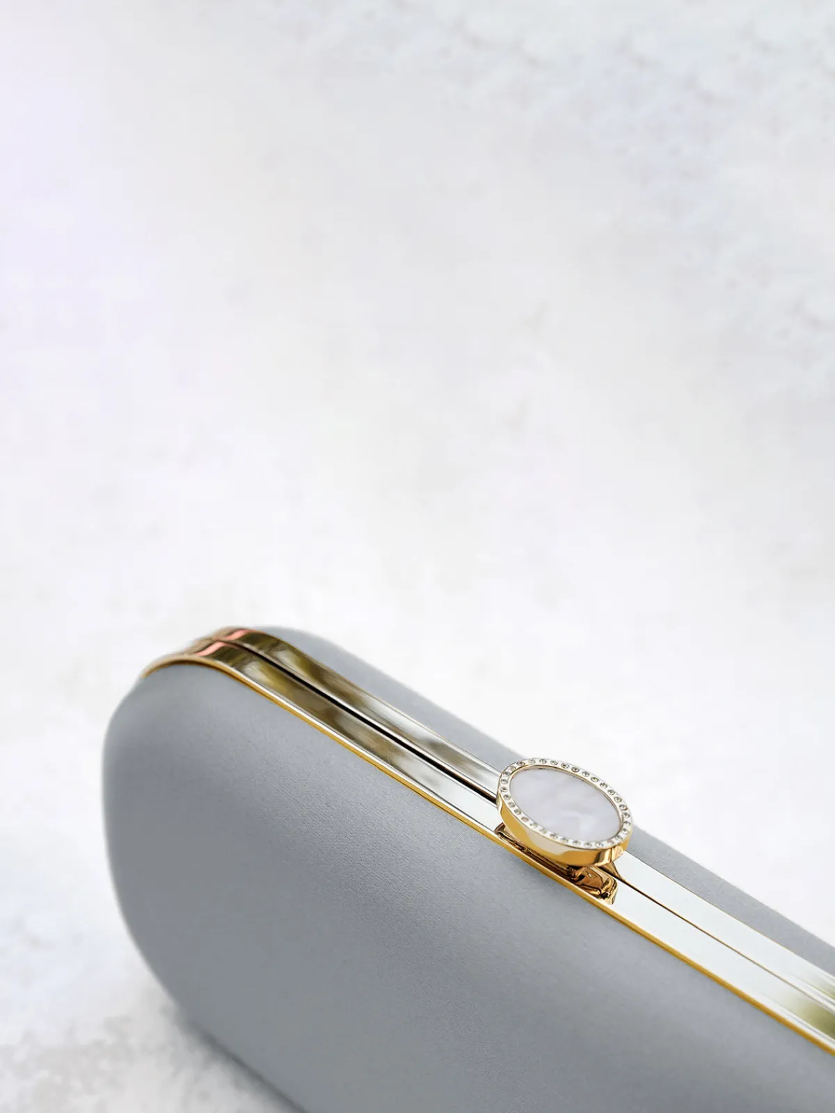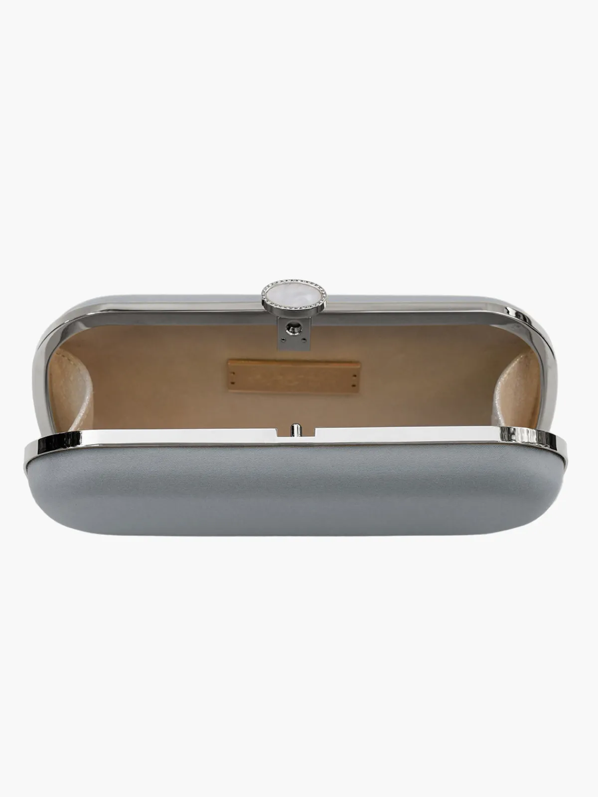 Our Bella Rosa Satin Bella Clutch in Silver Smoke is timeless in a vintage-inspired oval silhouette with a structured metal frame and a metal handbag clasp closure on top. Handcrafted by artisans in Florence, Italy.