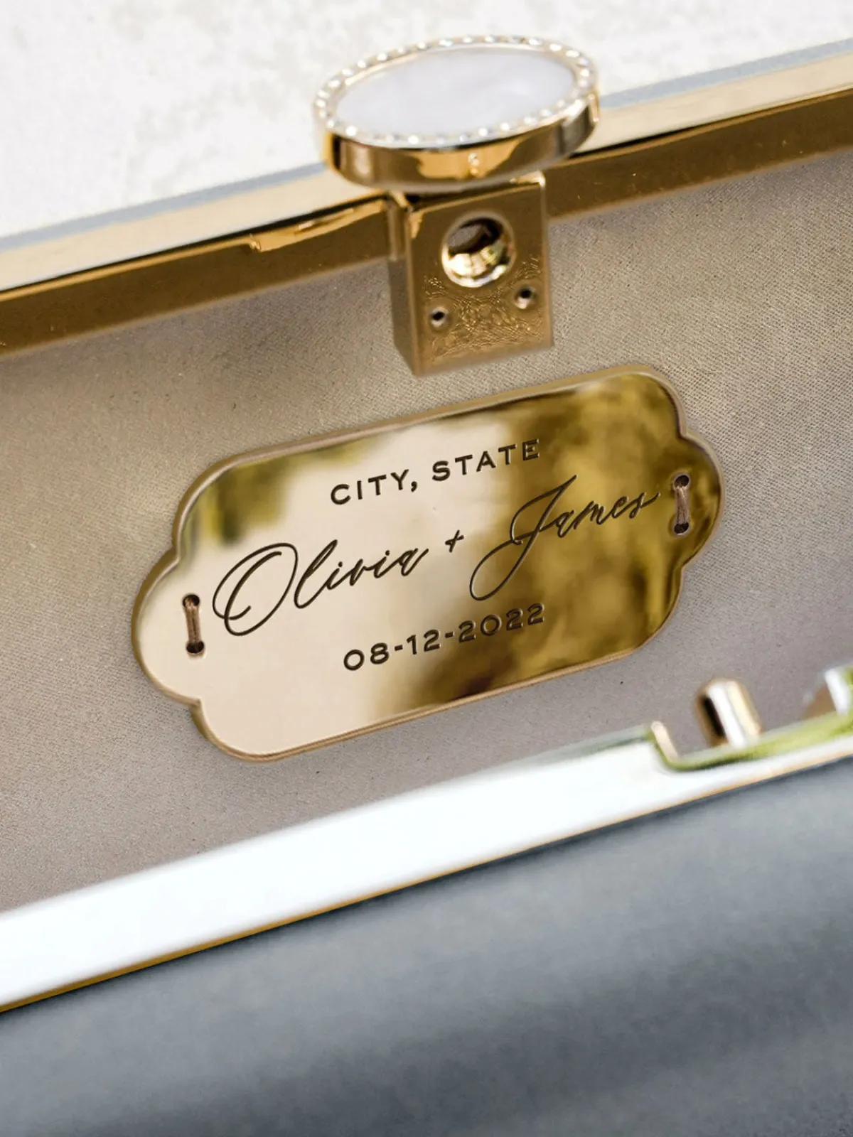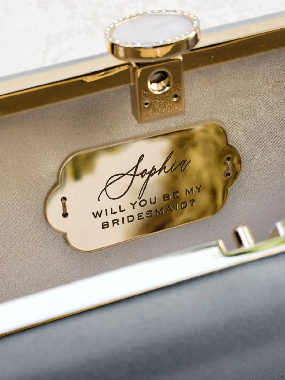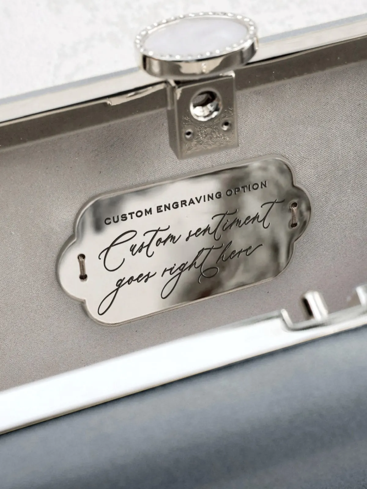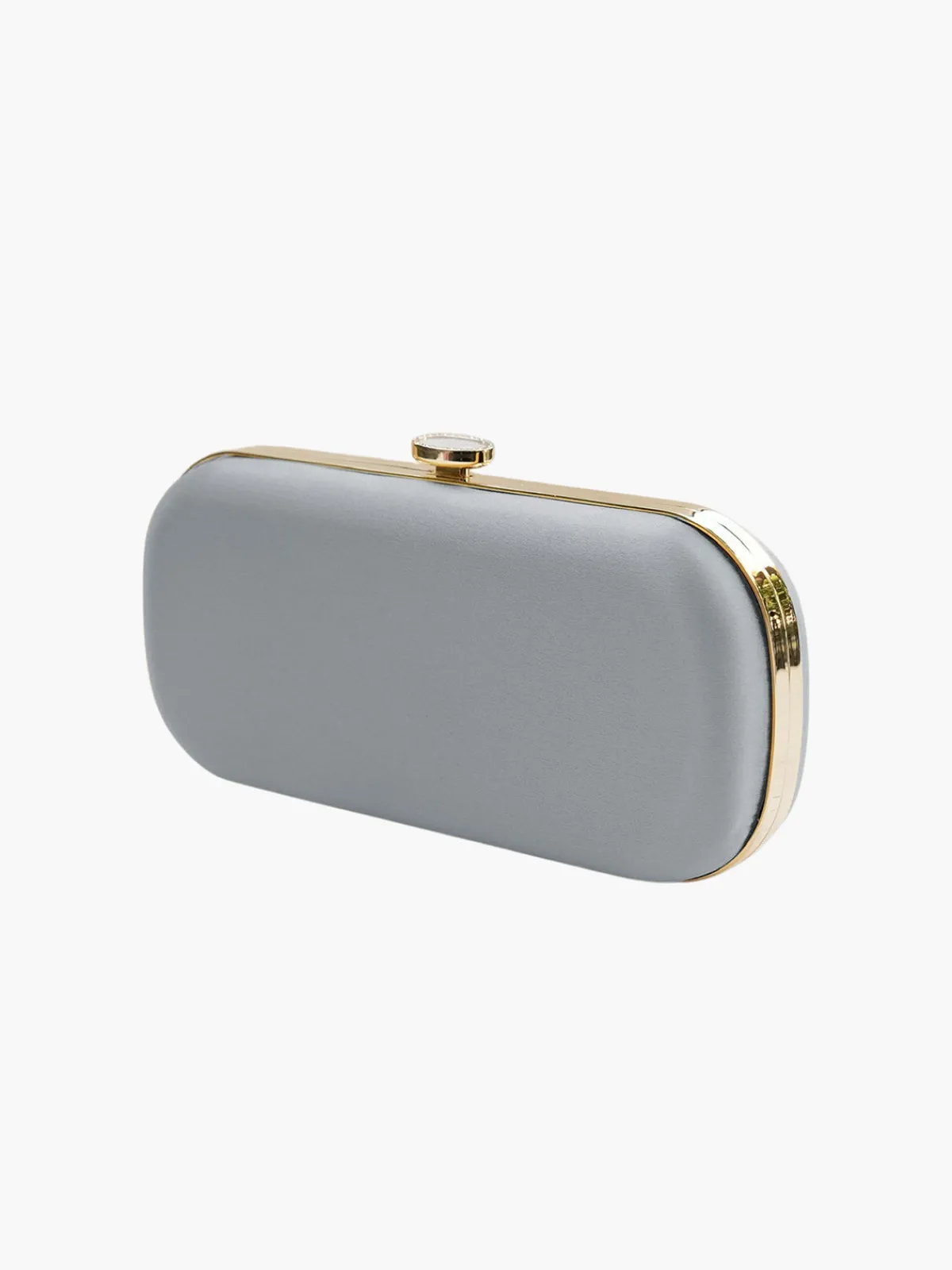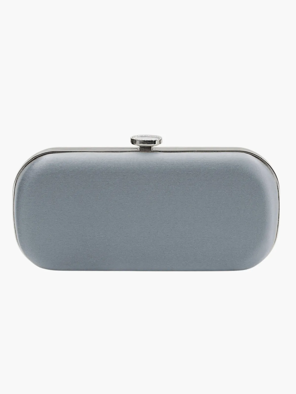 Our Bella Rosa Satin Bella Clutch in Silver Smoke is timeless in a vintage-inspired oval silhouette with a structured metal frame and a metal handbag clasp closure on top. Handcrafted by artisans in Florence, Italy.