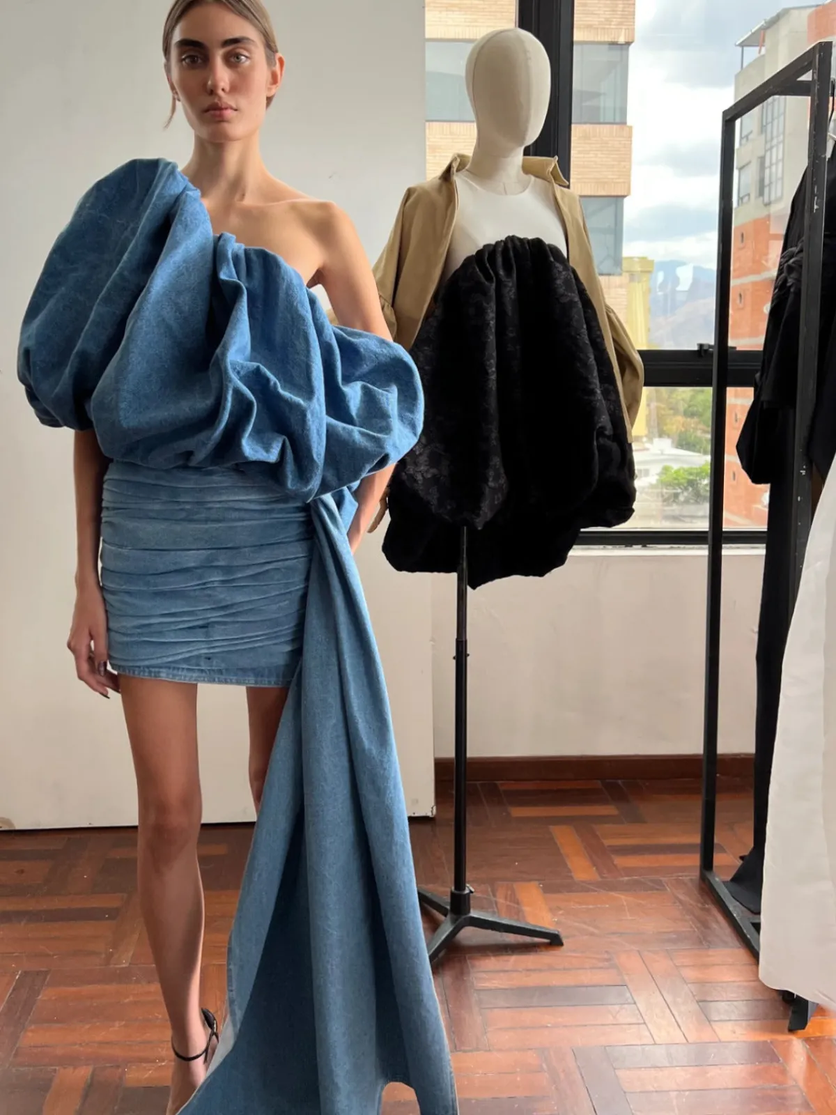 Our By Efrain Mogollon AnitaJean Skirt features ruching details through out and a long, dramatic strip that drapes down the side.Handcrafted by female artisans in Venezuela.