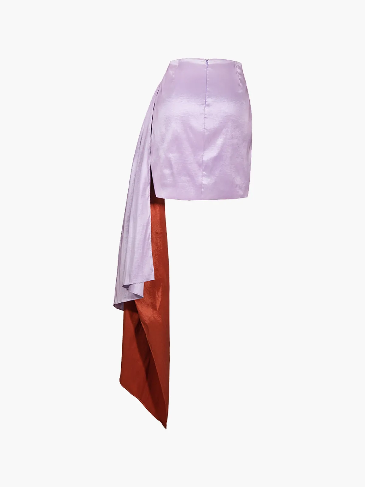 Our By Efrain Mogollon Anita Skirt in Lilac/Terracotta features a slim mini silhouette with allover pleated details, a high waist, and a long sash on one side. Handcrafted by artisans in Venezuela.