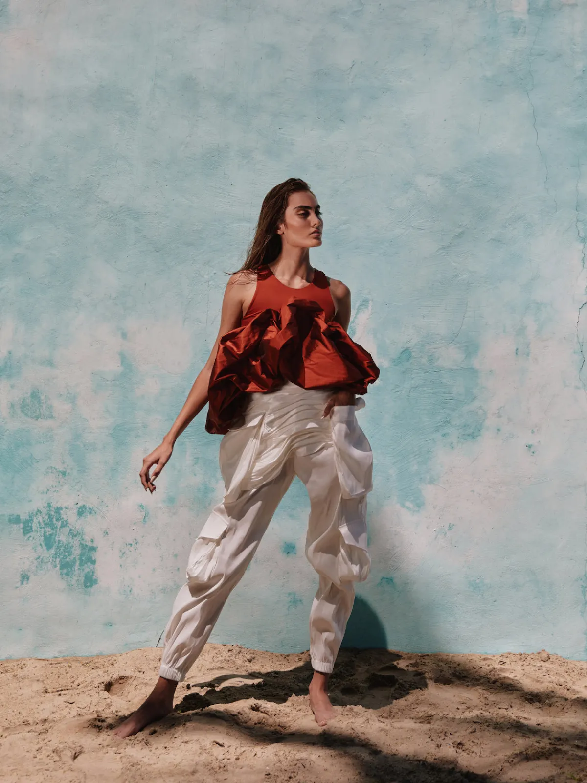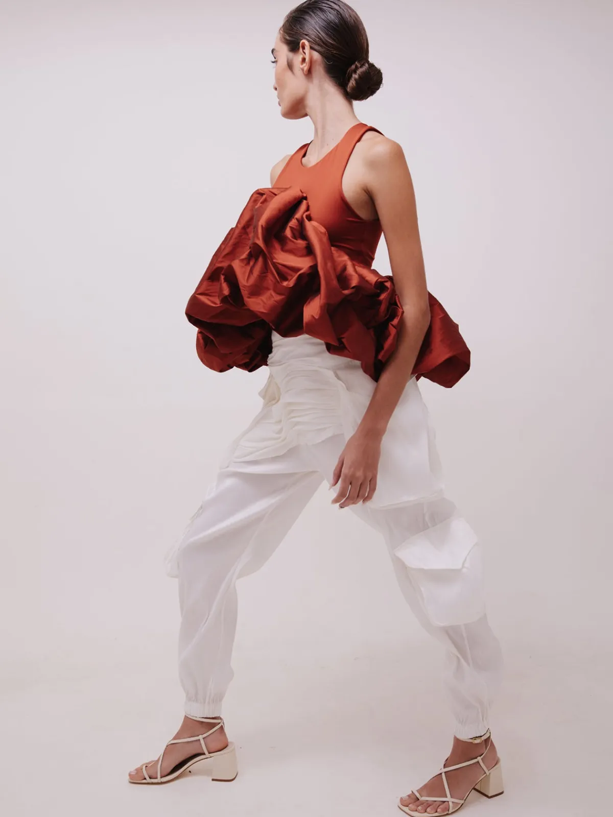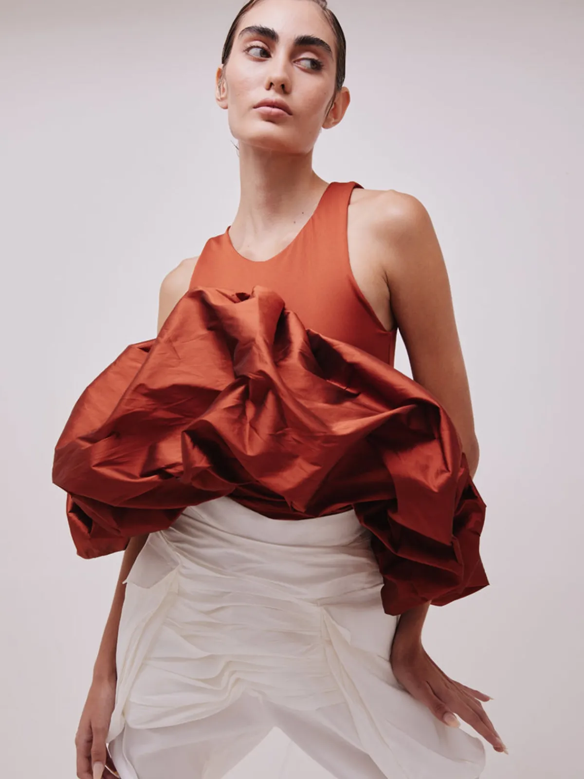 Our By Efrain Mogollon Aragua Tank inTerracotta features asleeveless racerback silhouette finished with voluminous puffed details around the front, sides and back. Handcrafted by artisans in Venezuela.