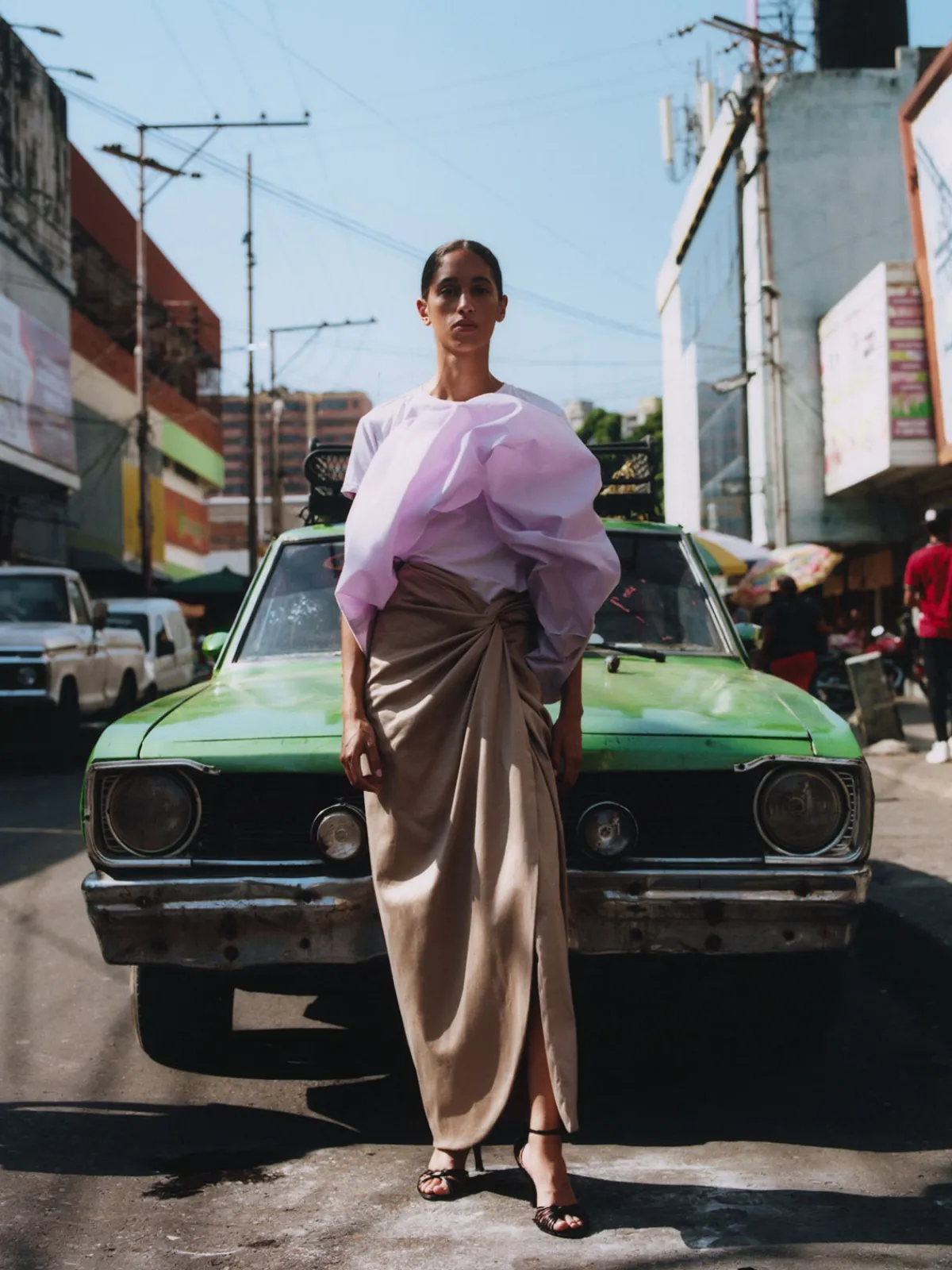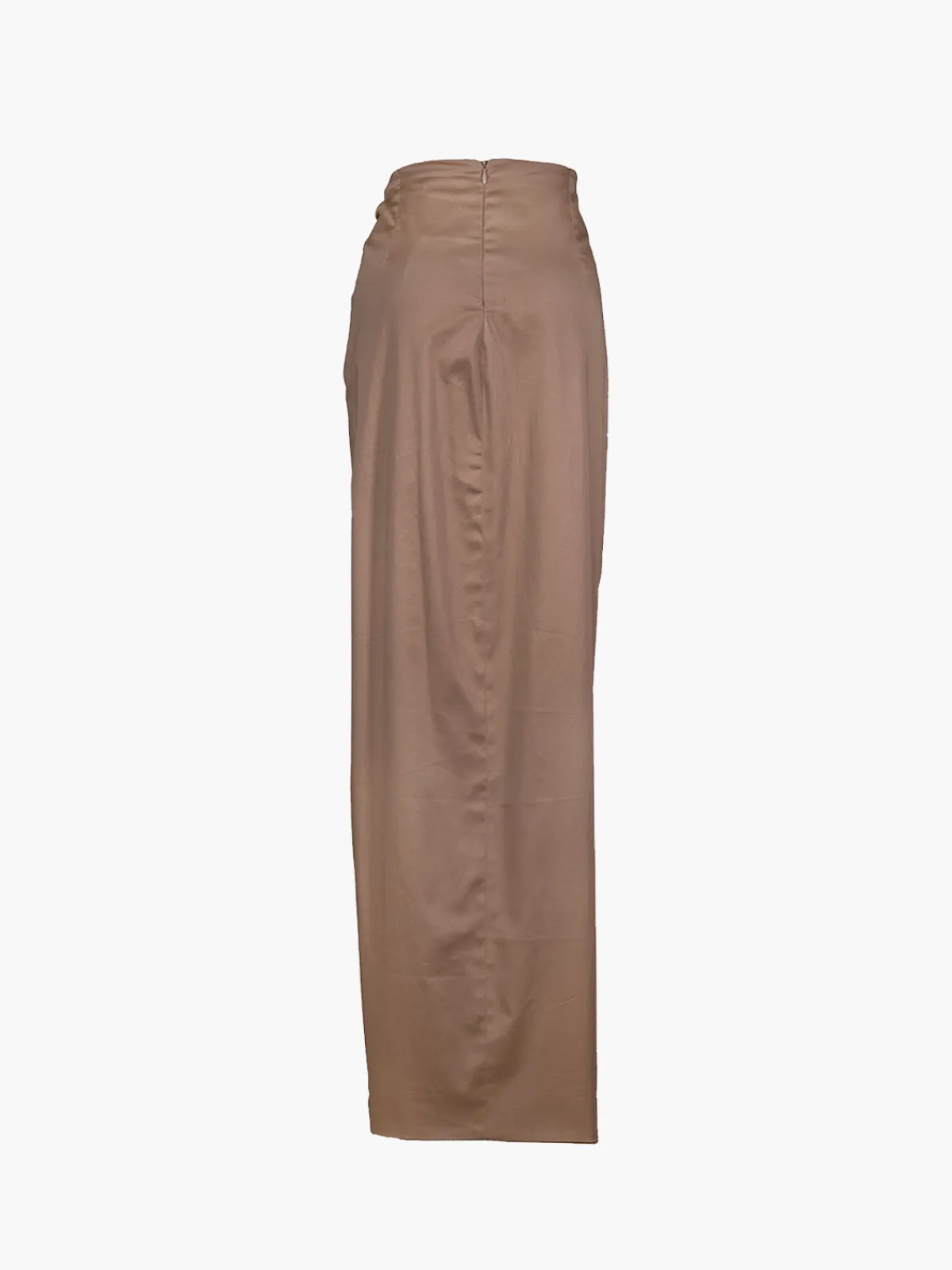 Our By Efrain Mogollon Drill Cuba Skirt features a high waist silhouette with a twist wrap detail and a split side. Handcrafted by artisans in Venezuela.