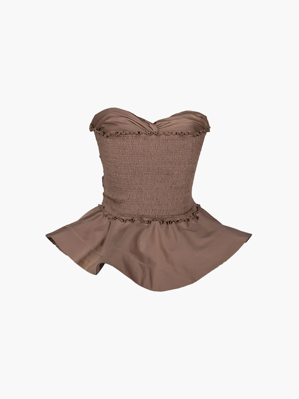 Our By Efrain Mogollon Maestranza Top boasts a strapless silhouette with a pleated texture, a ruffled peplum at the hem, and a twist knot detail at the bust. Handcrafted by artisans in Venezuela.