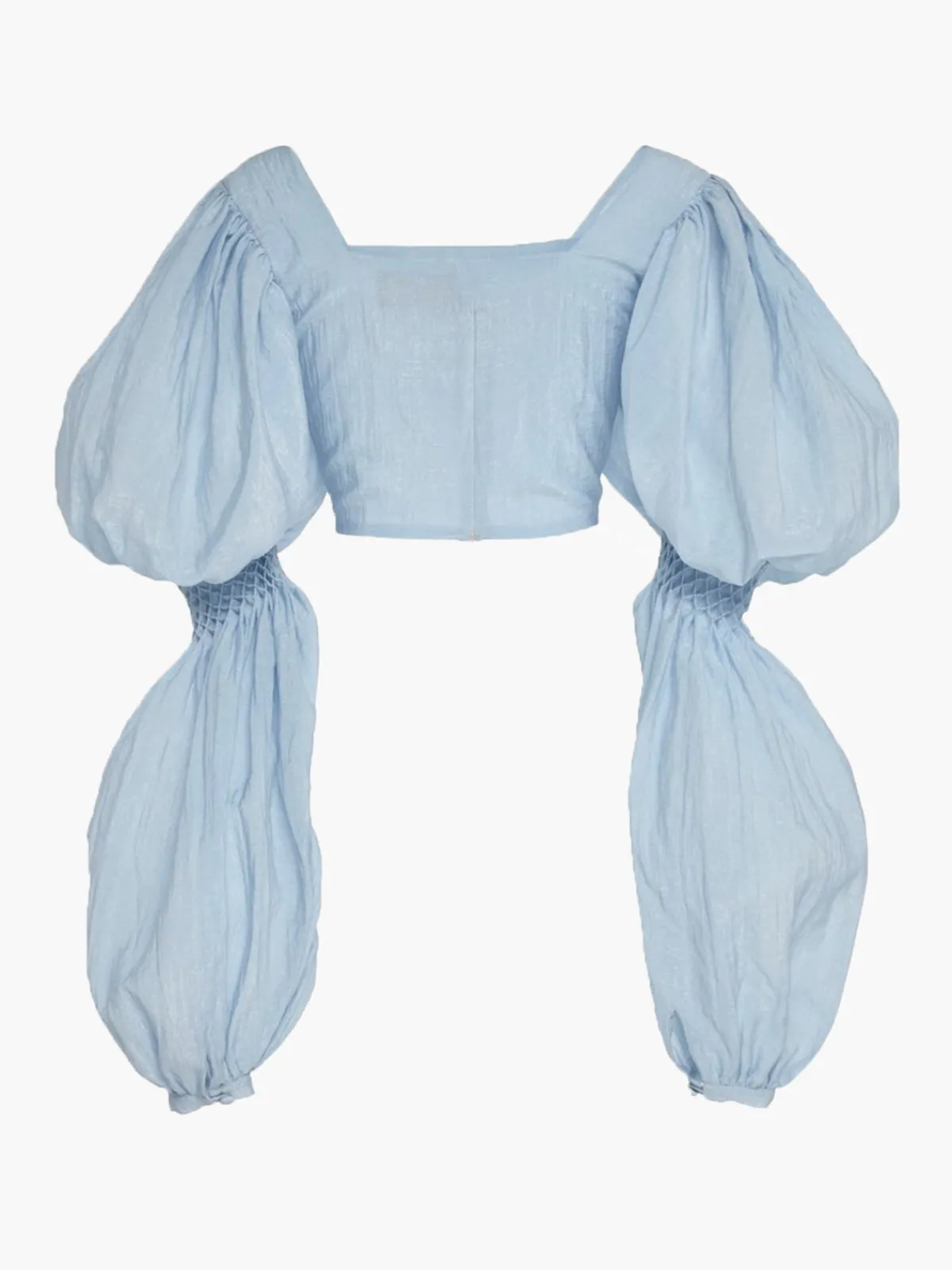 Our By Efrain Mogollon Marturet Top inBaby Blue features a cropped silhouette with asquare neck andvoluminouslong sleeves.Handcrafted by female artisans in Venezuela.
