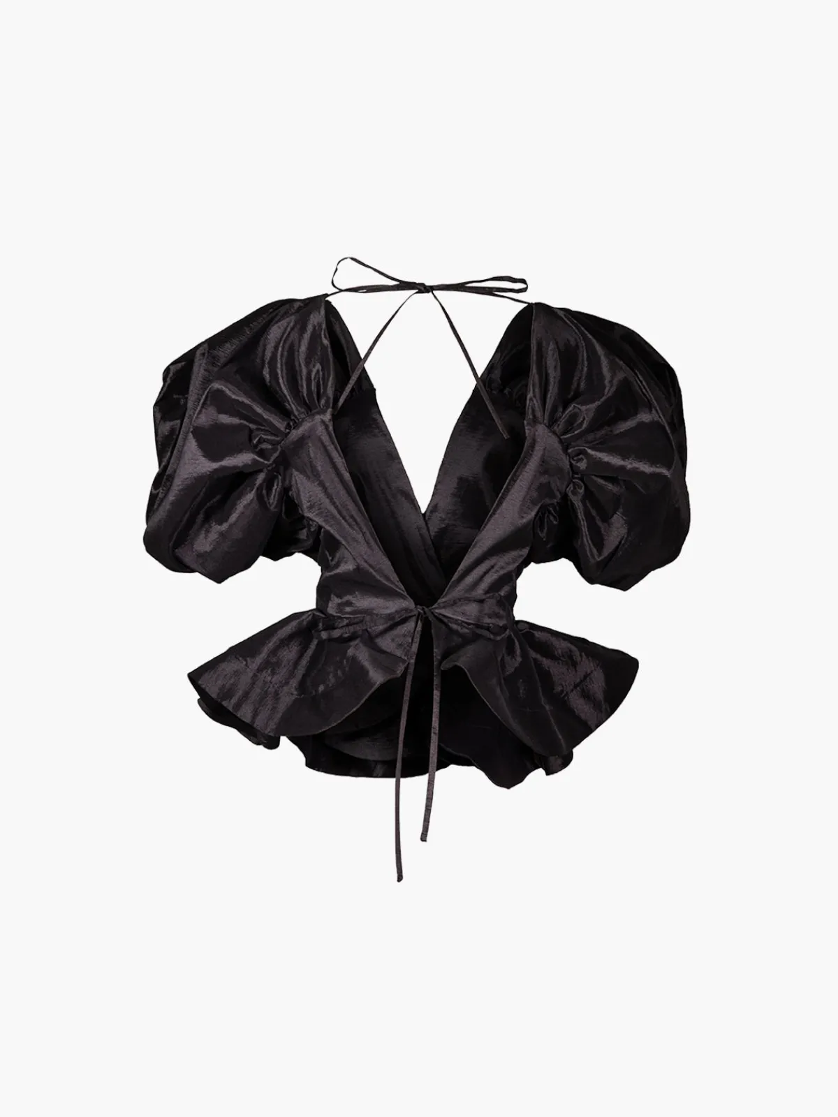 Our By Efrain Mogollon Rosa Top in Black features a voluminous silhouette with exaggerated puffed short sleeves, a deep V-neckline with a crossover detail, and a ruffled peplum at the waist. Handcrafted by artisans in Venezuela.