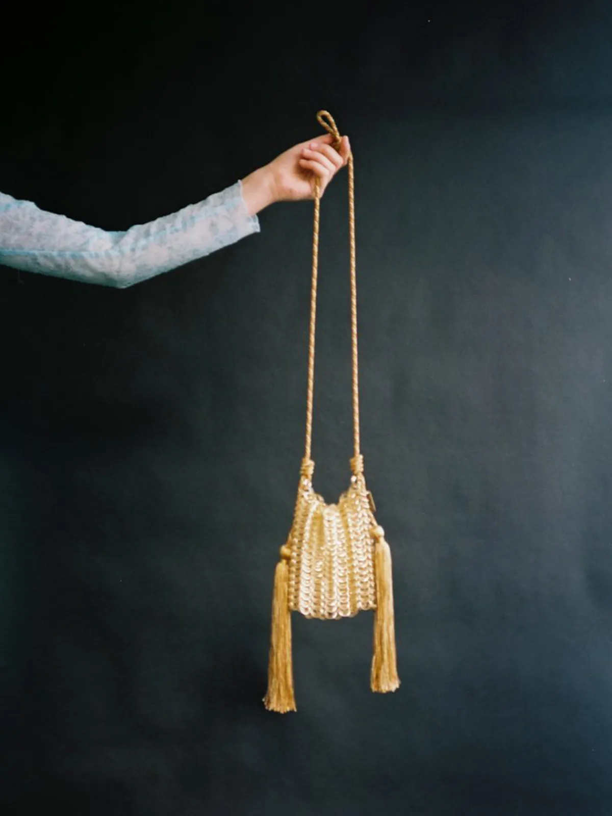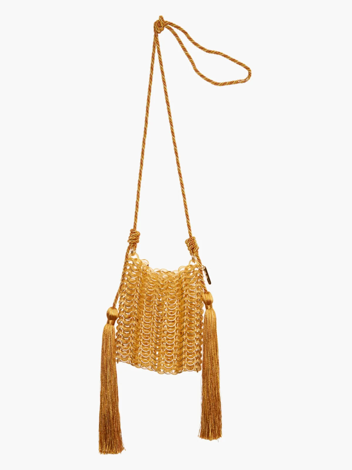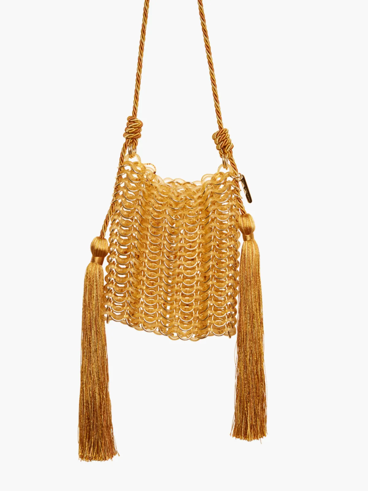 Our Carolina Santo Domingo Luisella Shell Bag in Light Amber features an open resin ring design in a petite shape with a hand-threaded rope strap and tassels. Handcrafted by artisans in Italy.