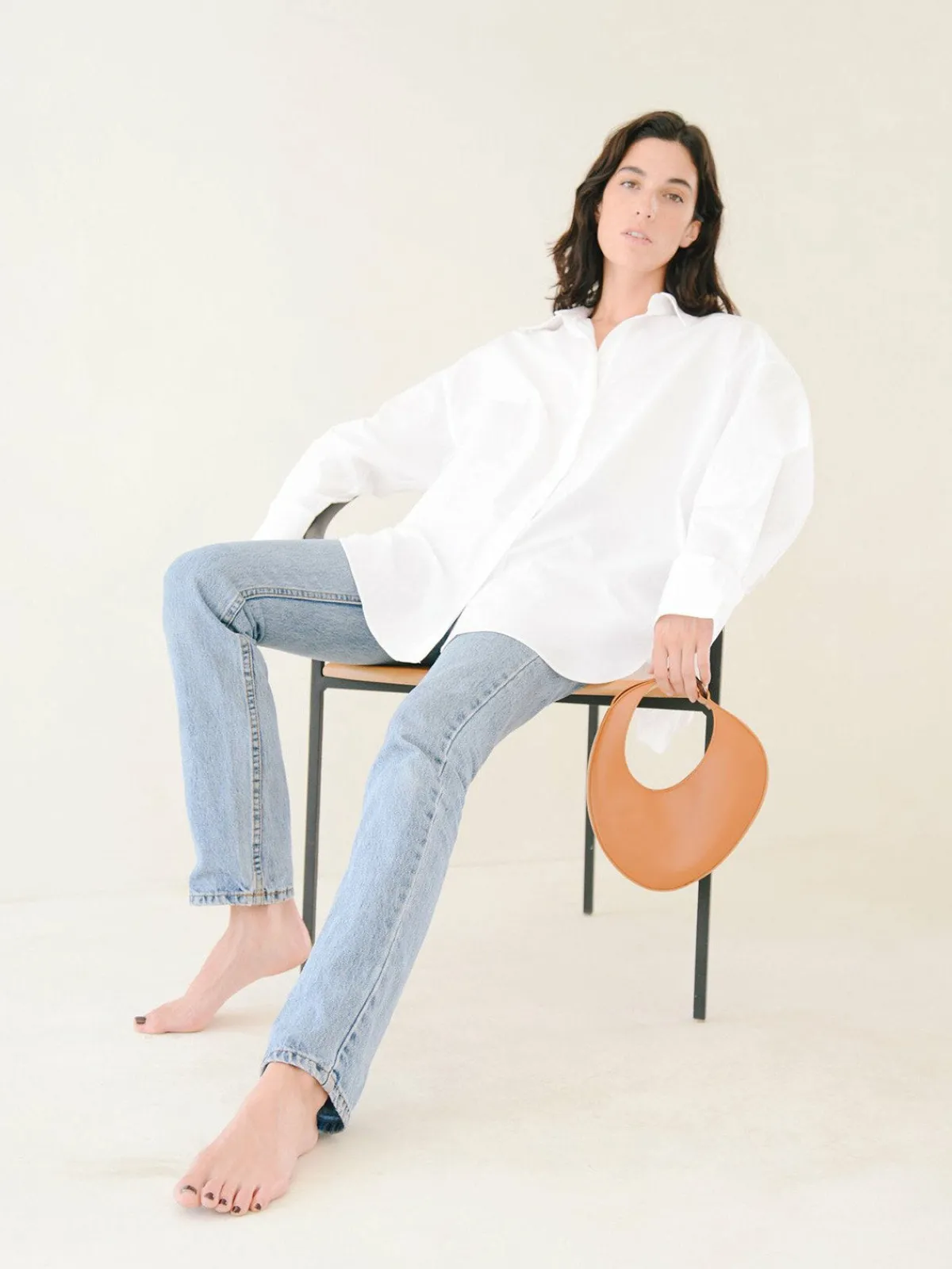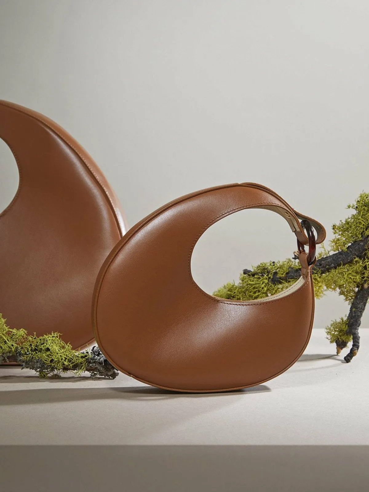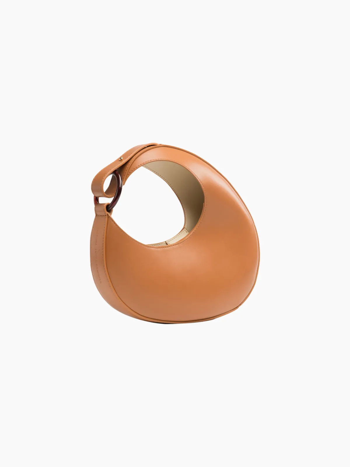 Our Carolina Santo Domingo Ostra Micro Handbag in Tan boasts a chic arc shape with an adjustable shoulder strap with a gold ring, a magnetic closure, and an interior slip pocket. Handcrafted by artisans in Italy.