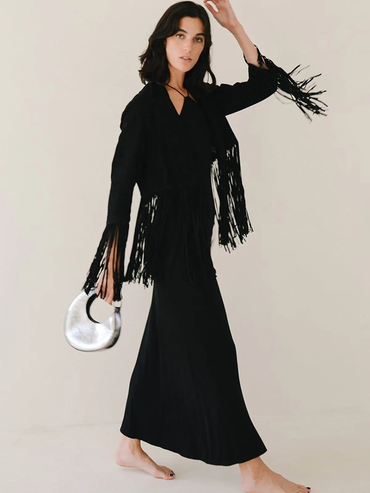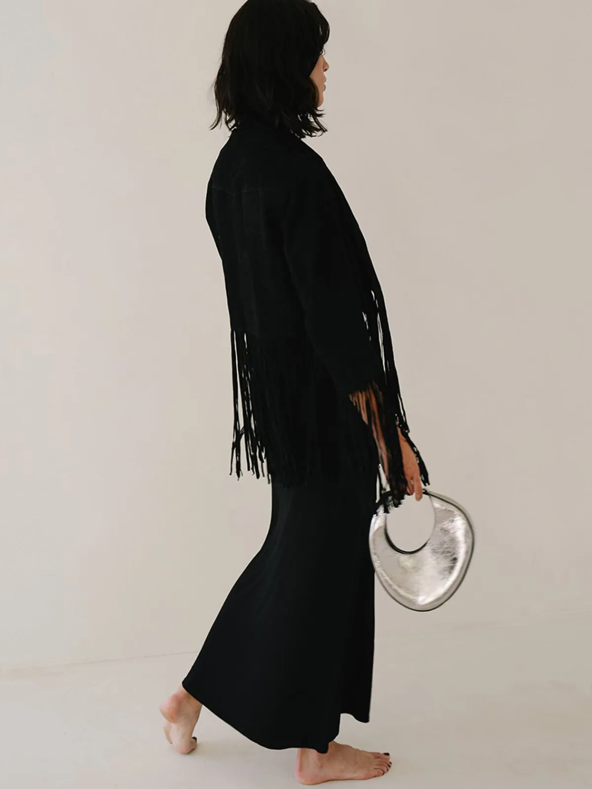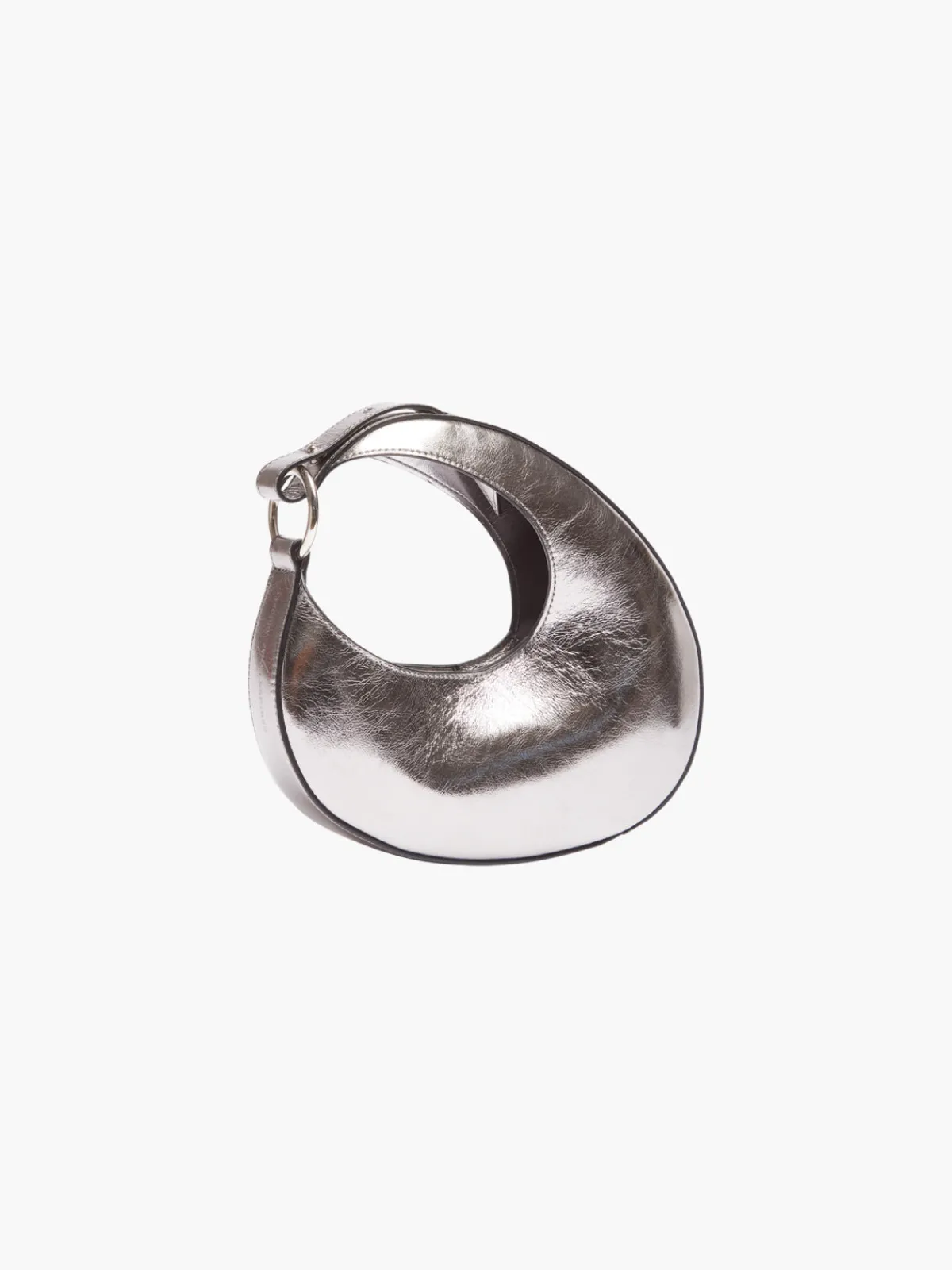 Our Carolina Santo Domingo Ostra Micro Handbag in Titanium boasts a chic arc shape with an acrylic ring closure on the shoulder strap and an interior slip pocket. Handcrafted by artisans in Italy.