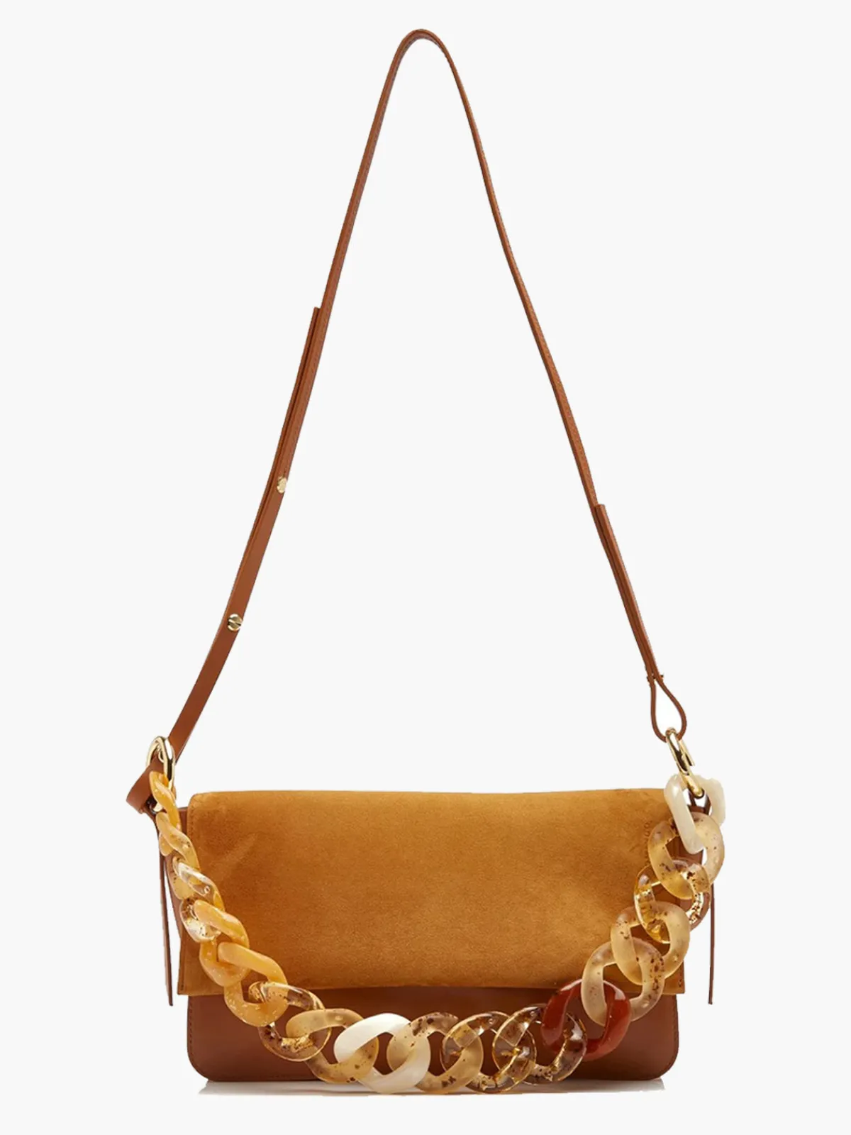 Our Carolina Santo Domingo Sofia Crossbody Tan in Tan features a rectangular silhouette with a foldover top, a magnetic closure, and an acrylic ring handle. A slender shoulder strap offers the option to carry it in a variety of different ways. Handcrafted by artisans in Italy.
