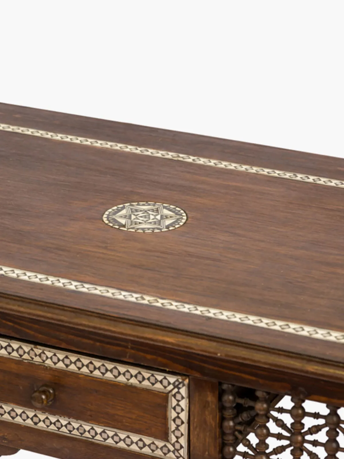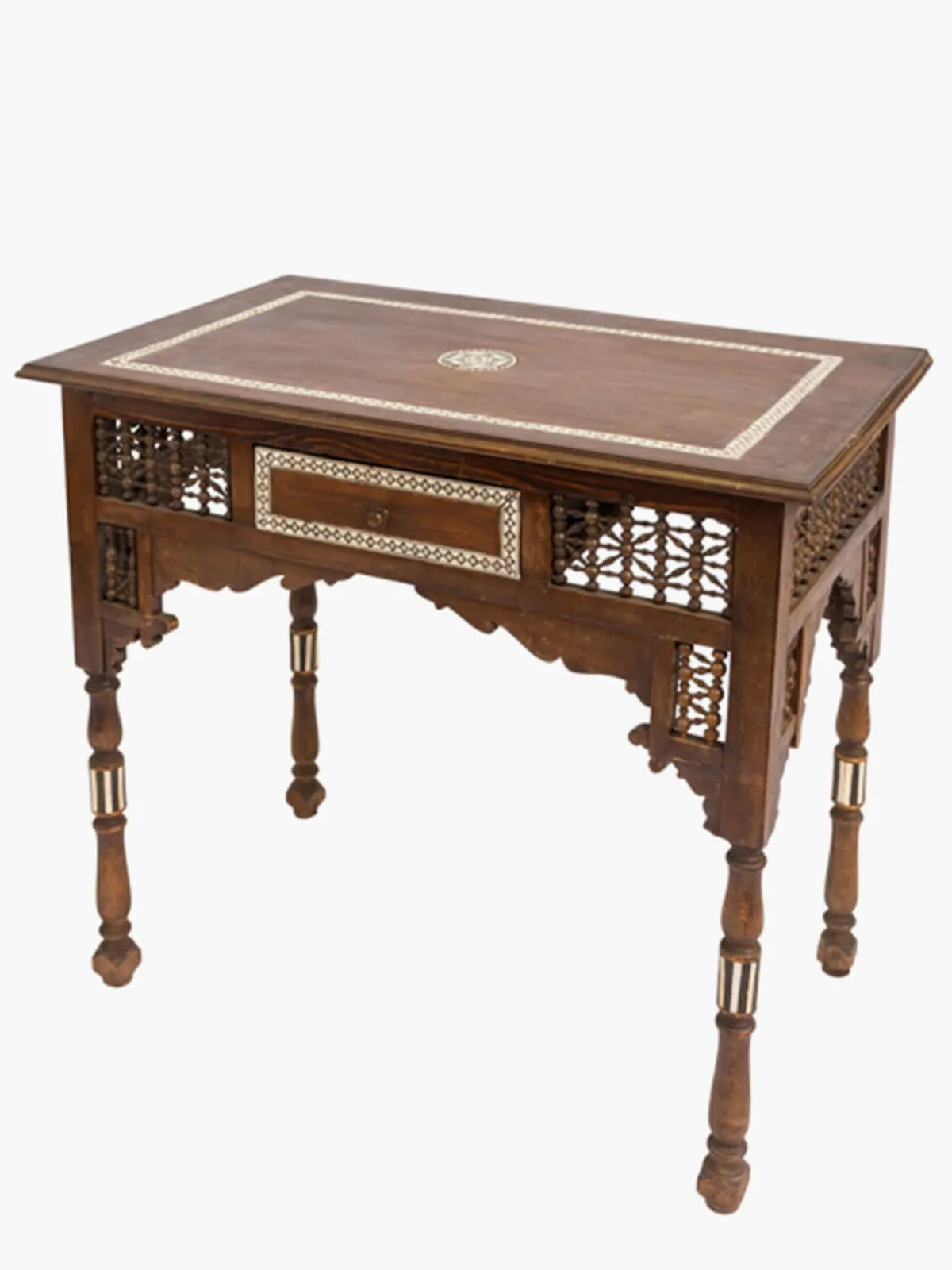 Our Casa Chiqui Moroccan Desk features a hand-carved design with mother of pearl inlays and geometric figures that represent the Arabic culture. Discovered in Morocco.