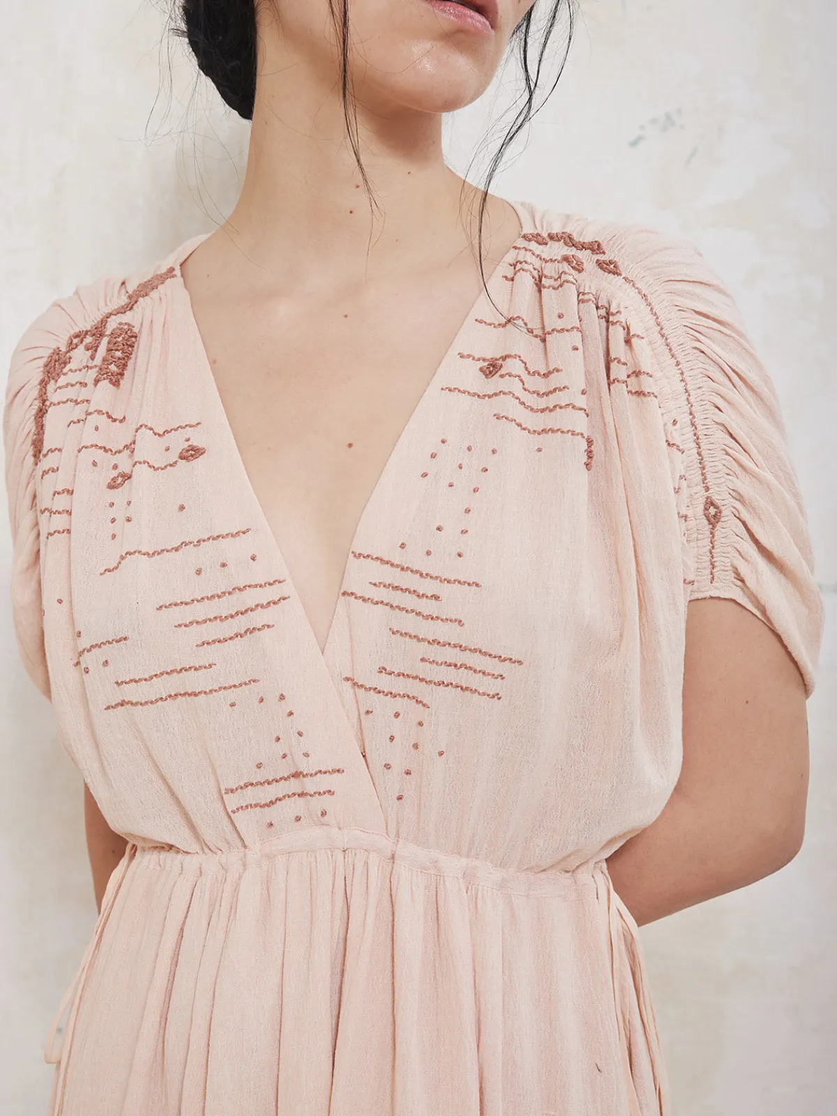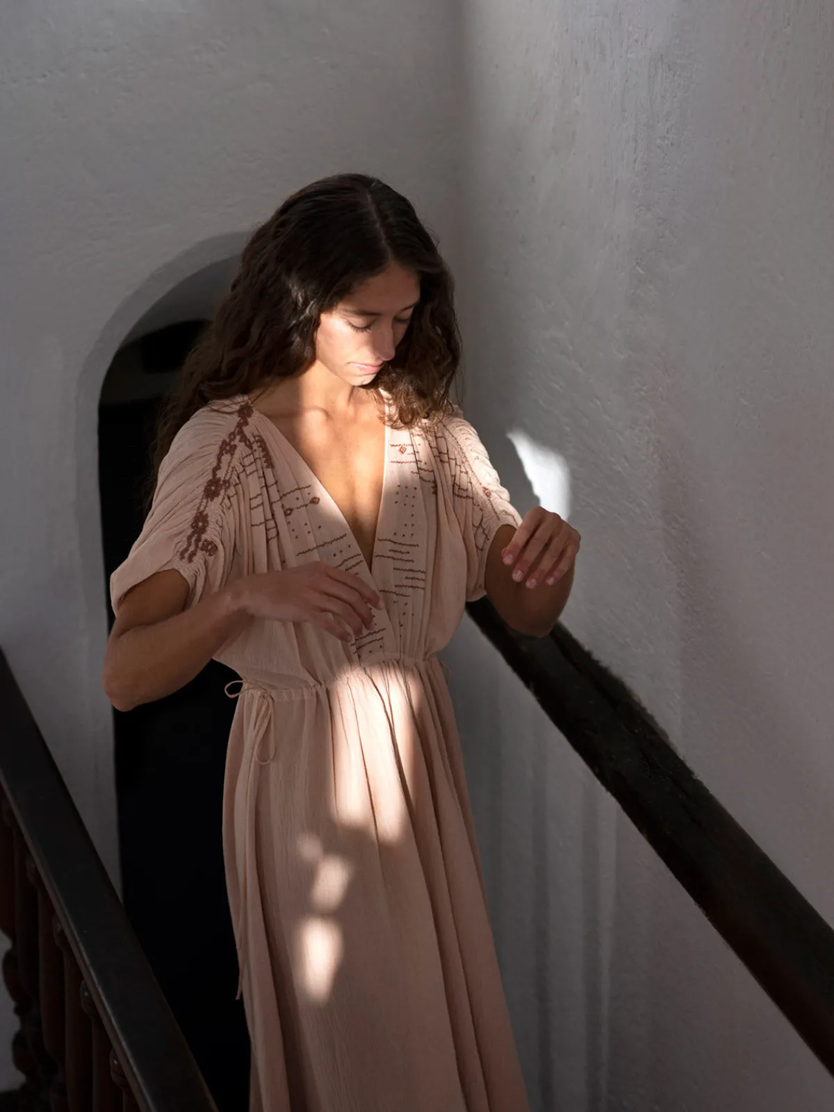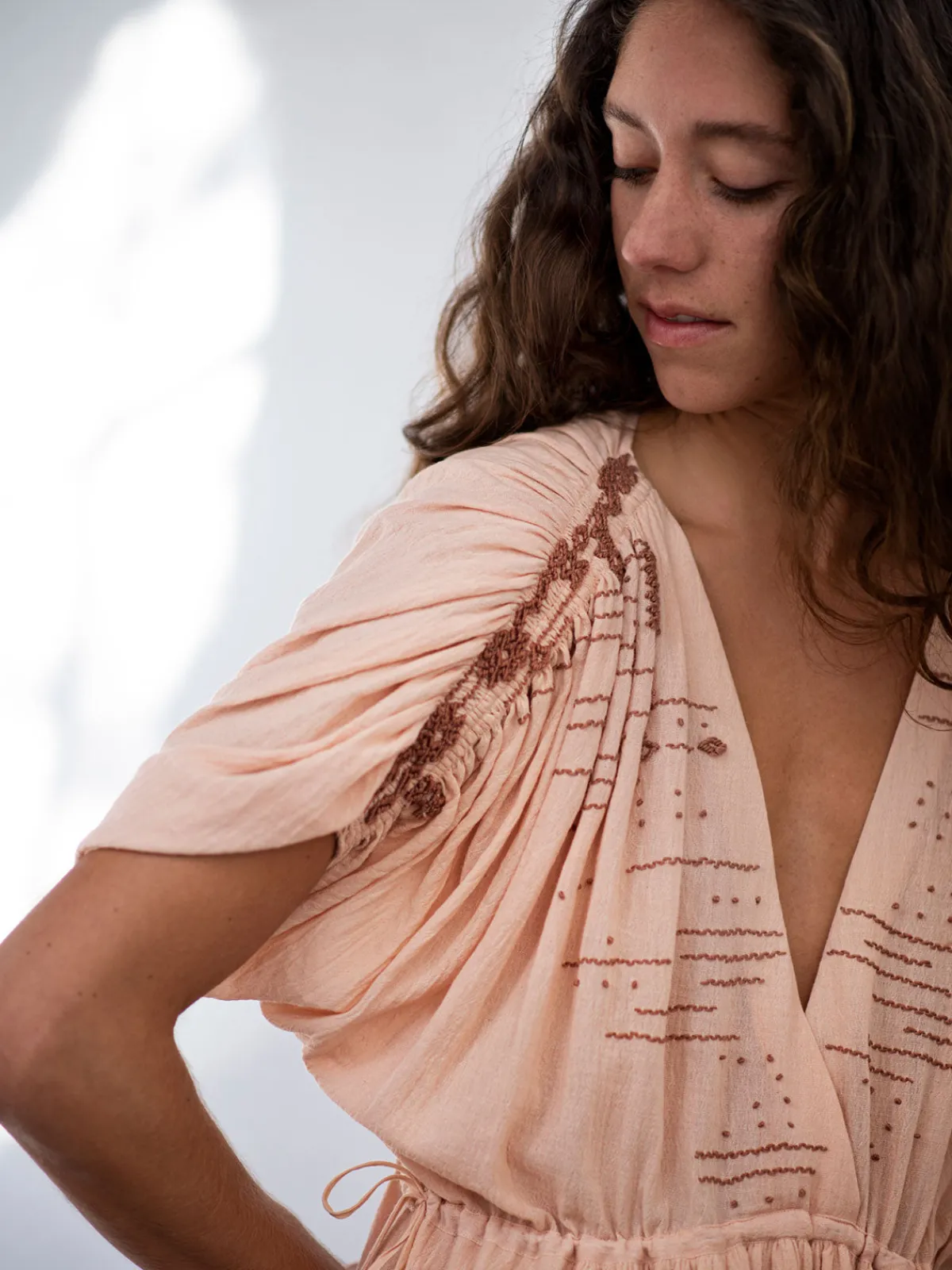 Our Collectiva Concepcion Ana Midi Dress features a flowing silhouette with short kimono-inspired sleeves, a V-neckline, and drawstrings that adjust and cinch the waist.The intricategathering and embroidered detail is specificto the Chenalhó community in Chiapas. Handcrafted by artisans in Mexico.