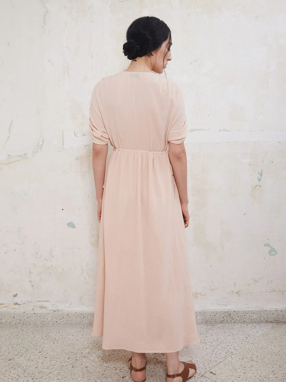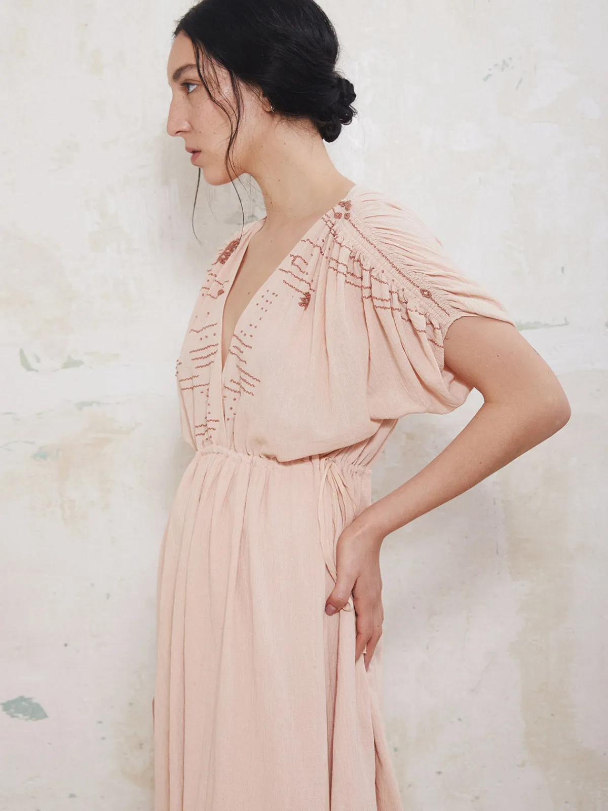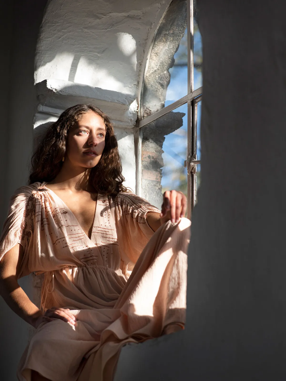 Our Collectiva Concepcion Ana Midi Dress features a flowing silhouette with short kimono-inspired sleeves, a V-neckline, and drawstrings that adjust and cinch the waist.The intricategathering and embroidered detail is specificto the Chenalhó community in Chiapas. Handcrafted by artisans in Mexico.