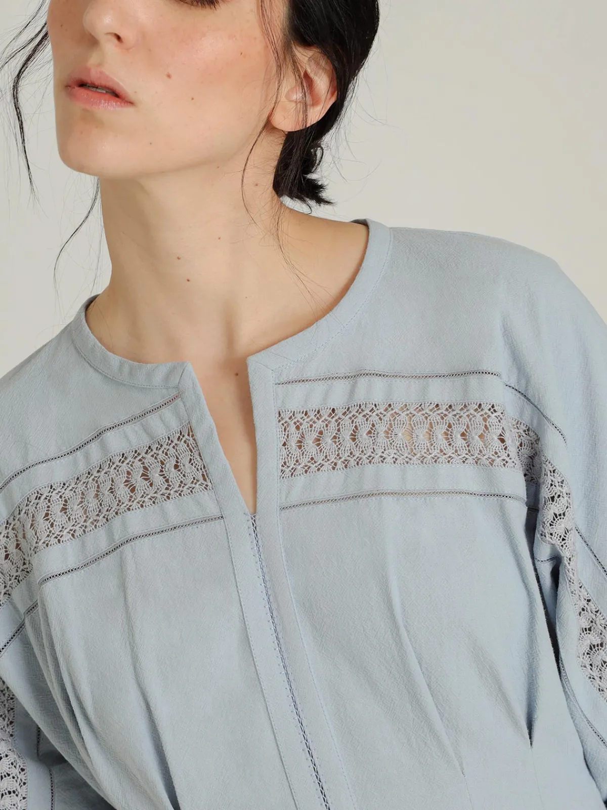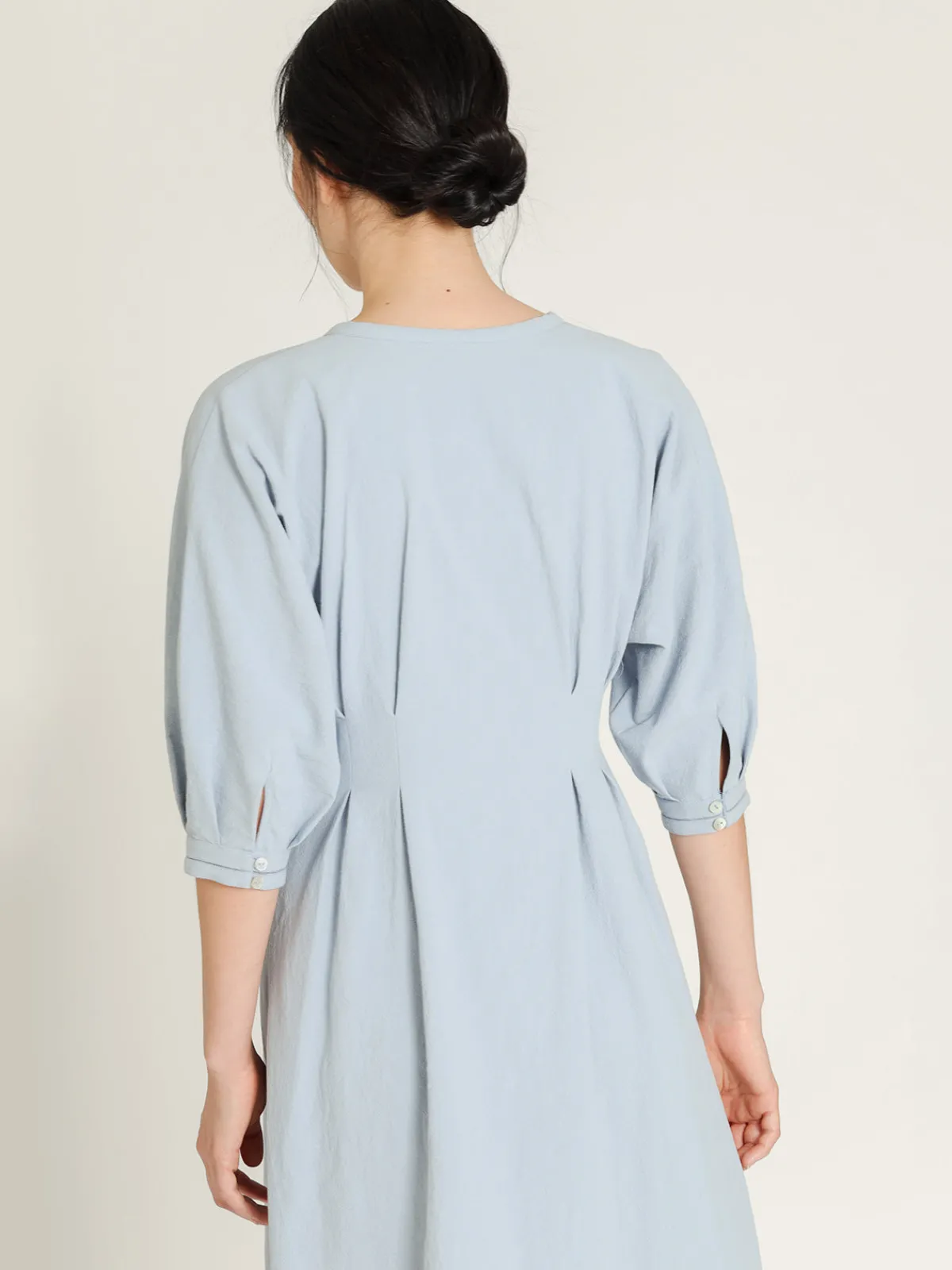 Our Collectiva Concepcion Concha Dress features an A-line silhouette with a darted bodice and waist, side zipper closure, puffed 3/4 length sleeves, and a round neckline with a center front slit.This piece is beautifully embellished with a two local techniques: Gaviado, a decorative herringbone hand-stitch and Deshilado,a process of removing weft threads to create a base for intricate lace-like embroidery.