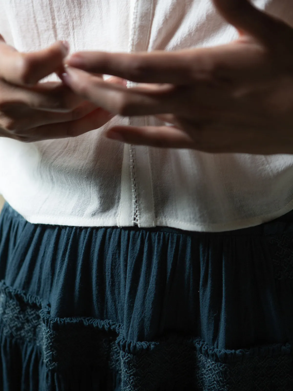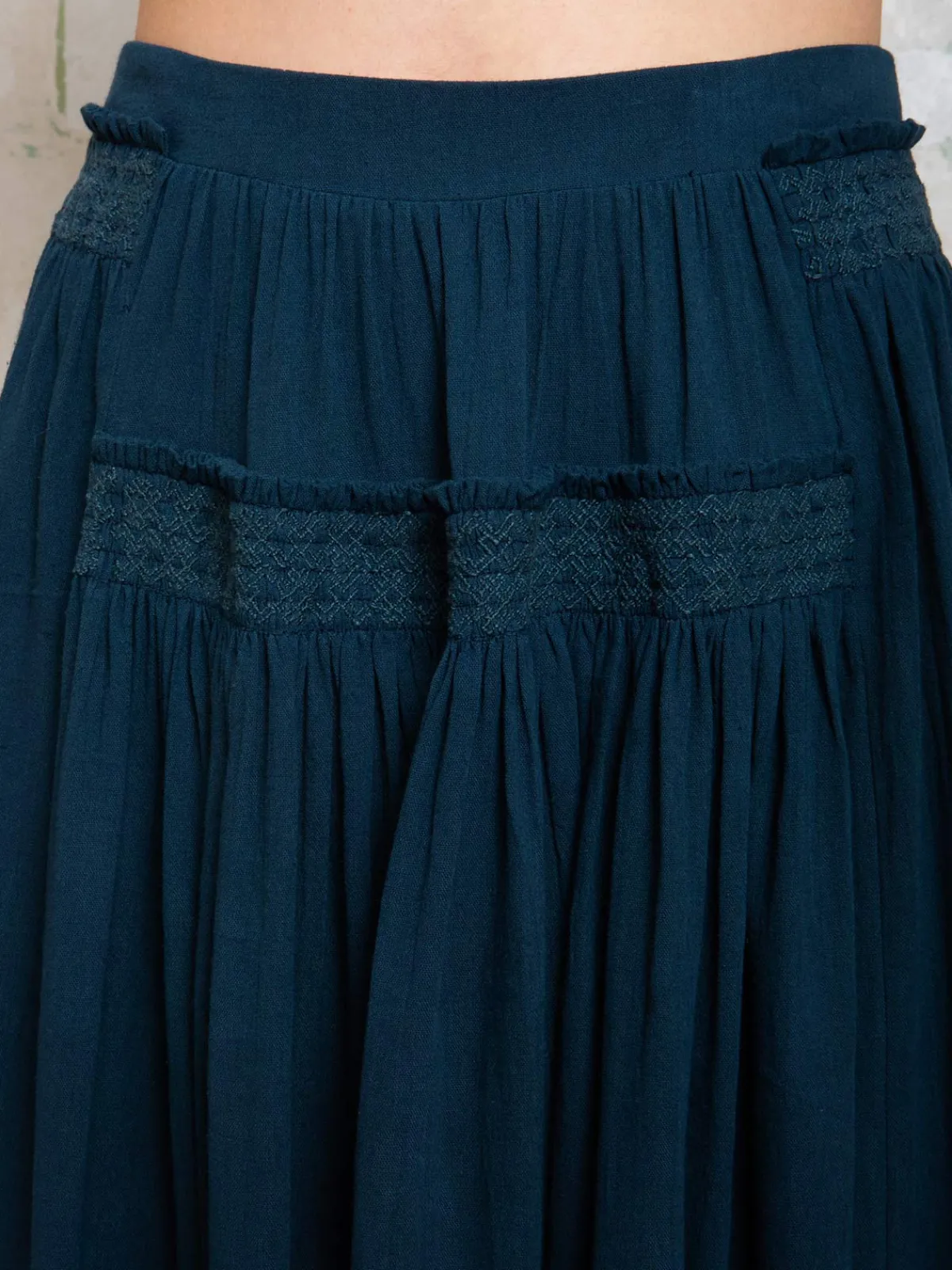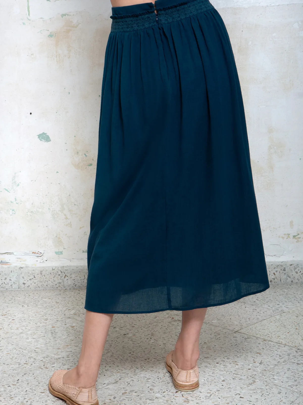Our Collectiva Concepcion Isabel Skirt in Indigo features an A-line silhouette in a midi length with a back zipper and button closure.The intricategathering and embroidered detail is specificto the Chenalhó community in Chiapas. Handcrafted by artisans in Mexico