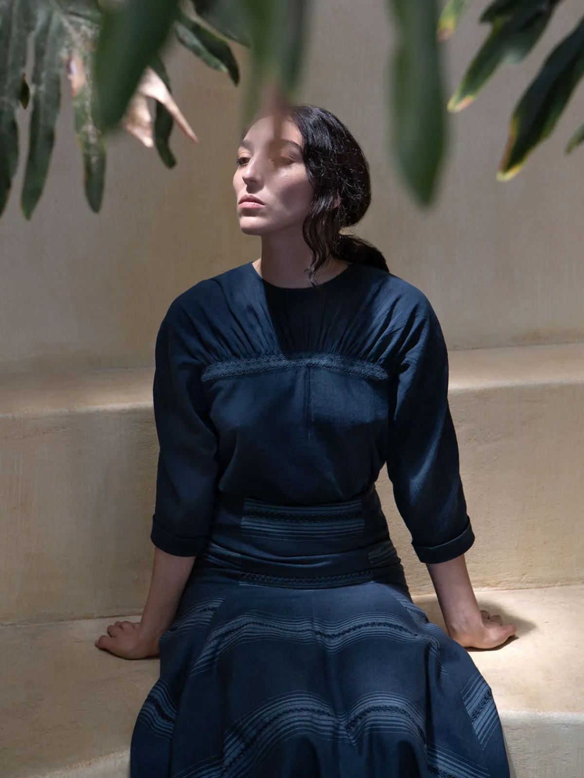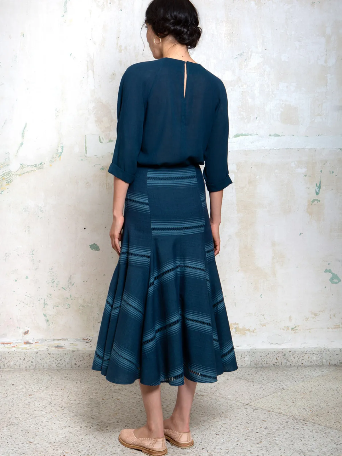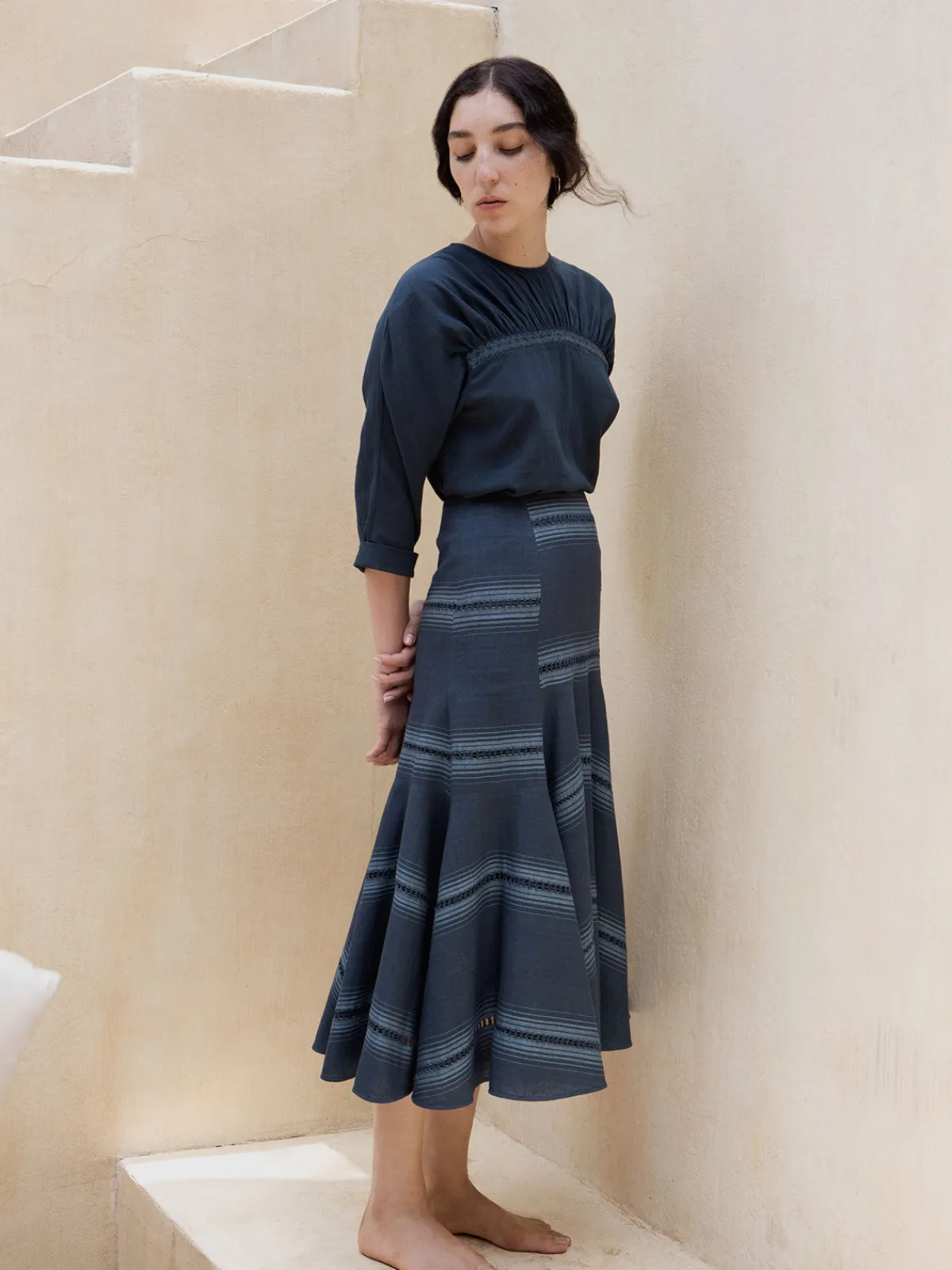 Our Collectiva Concepcion Lucero Skirt features a fit and flare silhouette in a midi length with a side zipper closure and embellished with Deshilado,a process of removing weft threads to create a base for intricate lace-like embroidery.