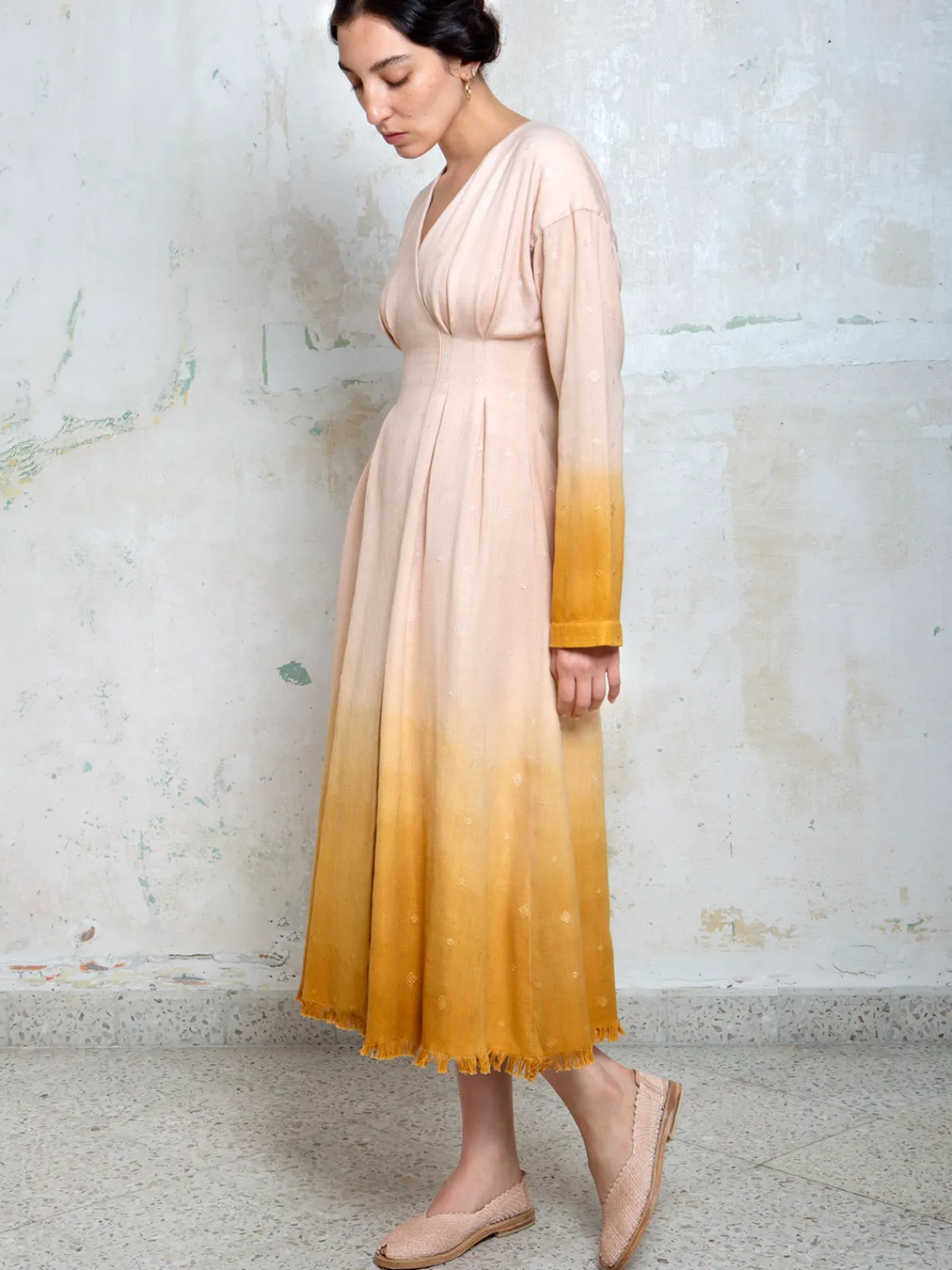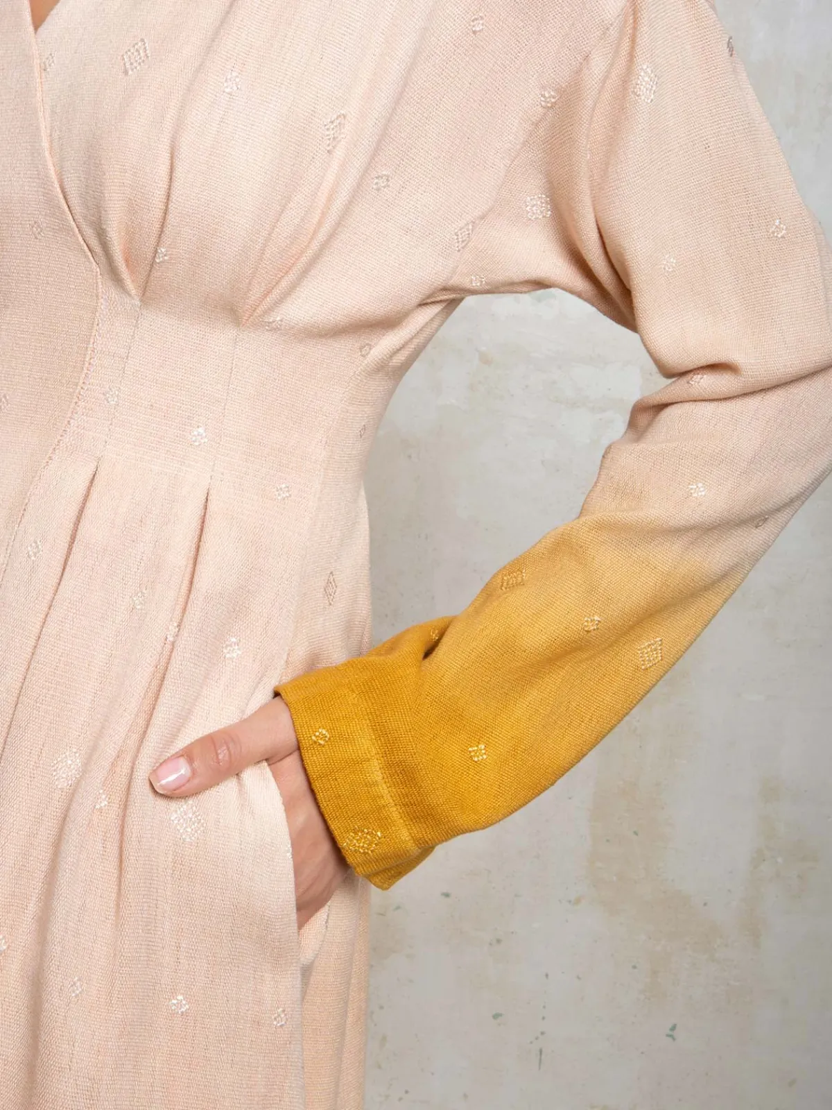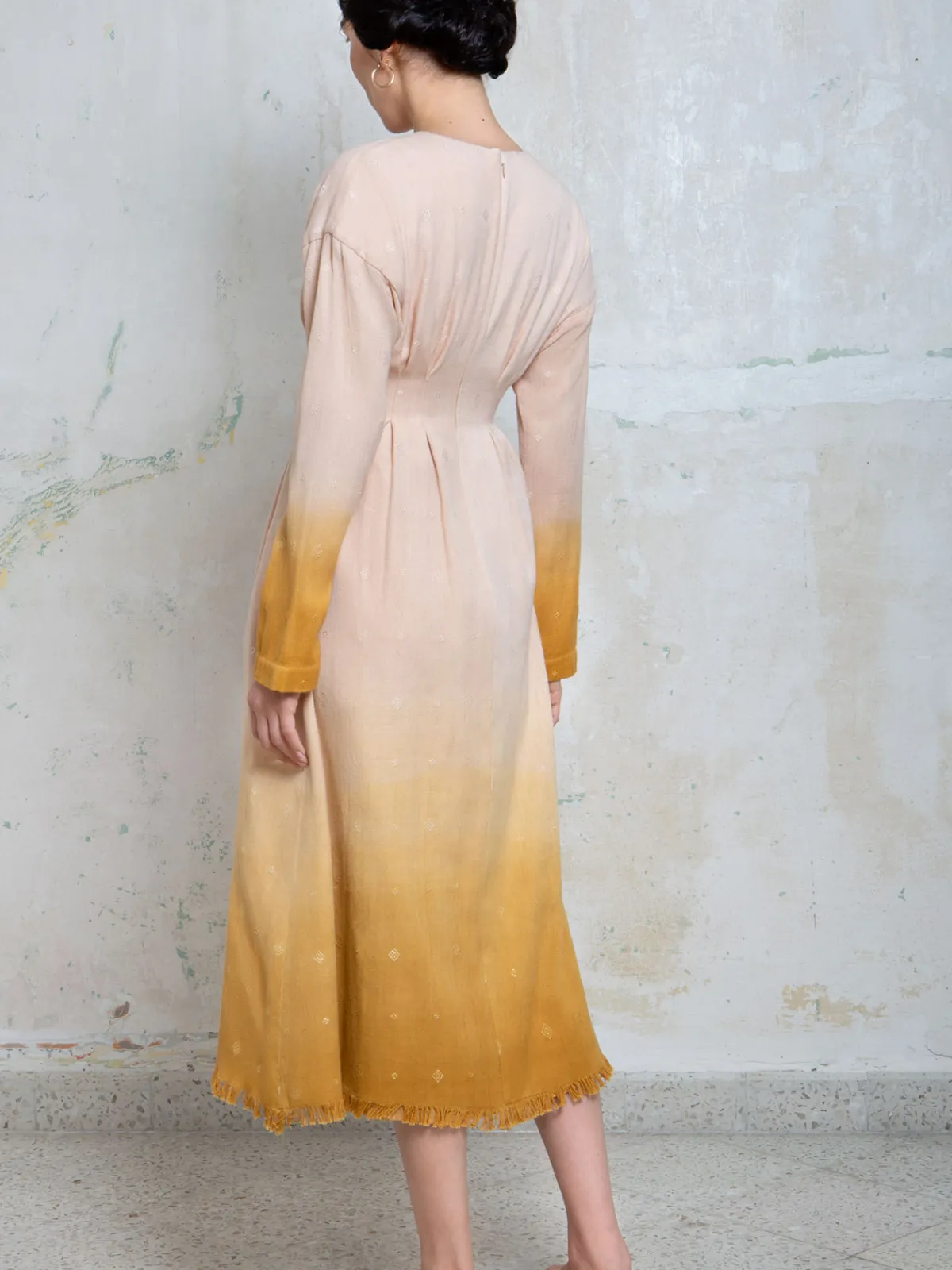 Our Collectiva Concepcion Maria Midi Dress boasts a fit and flare silhouette with long sleeves, a V-neckline, and a fitted waist. It is accented with slant pockets, a raw edged hem, and a zipper and button closure in back. Gradient detail is woven into the fabric on waist looms in Aldama, a community in Chiapas.