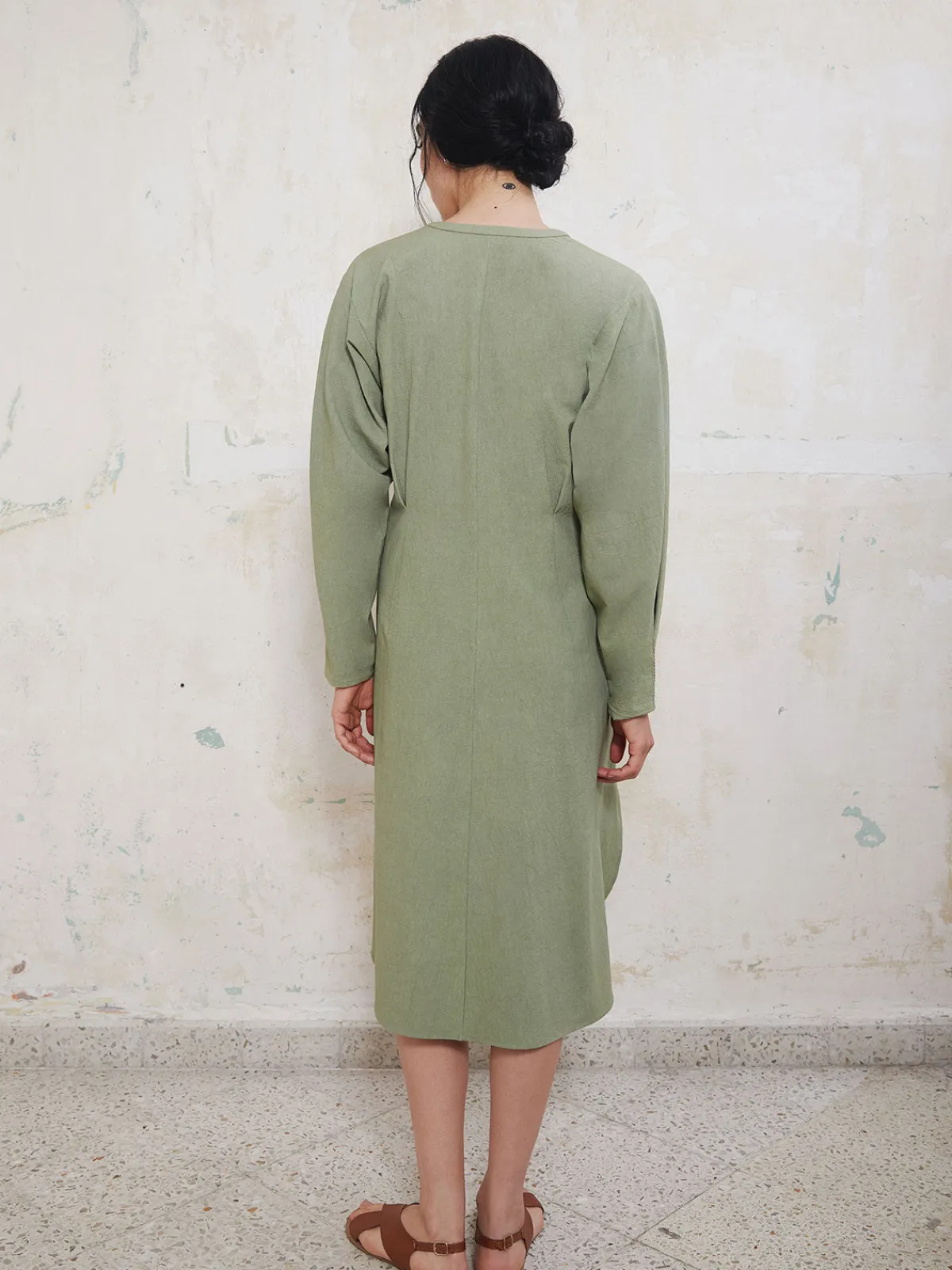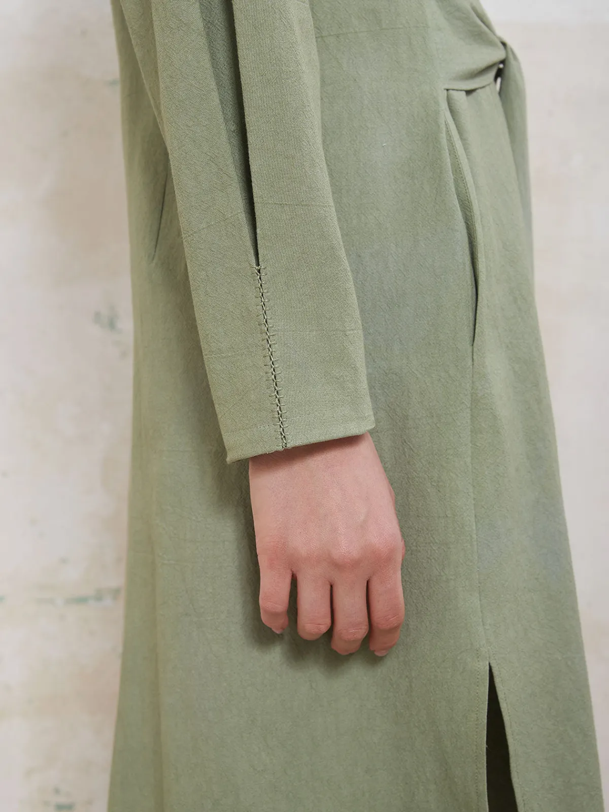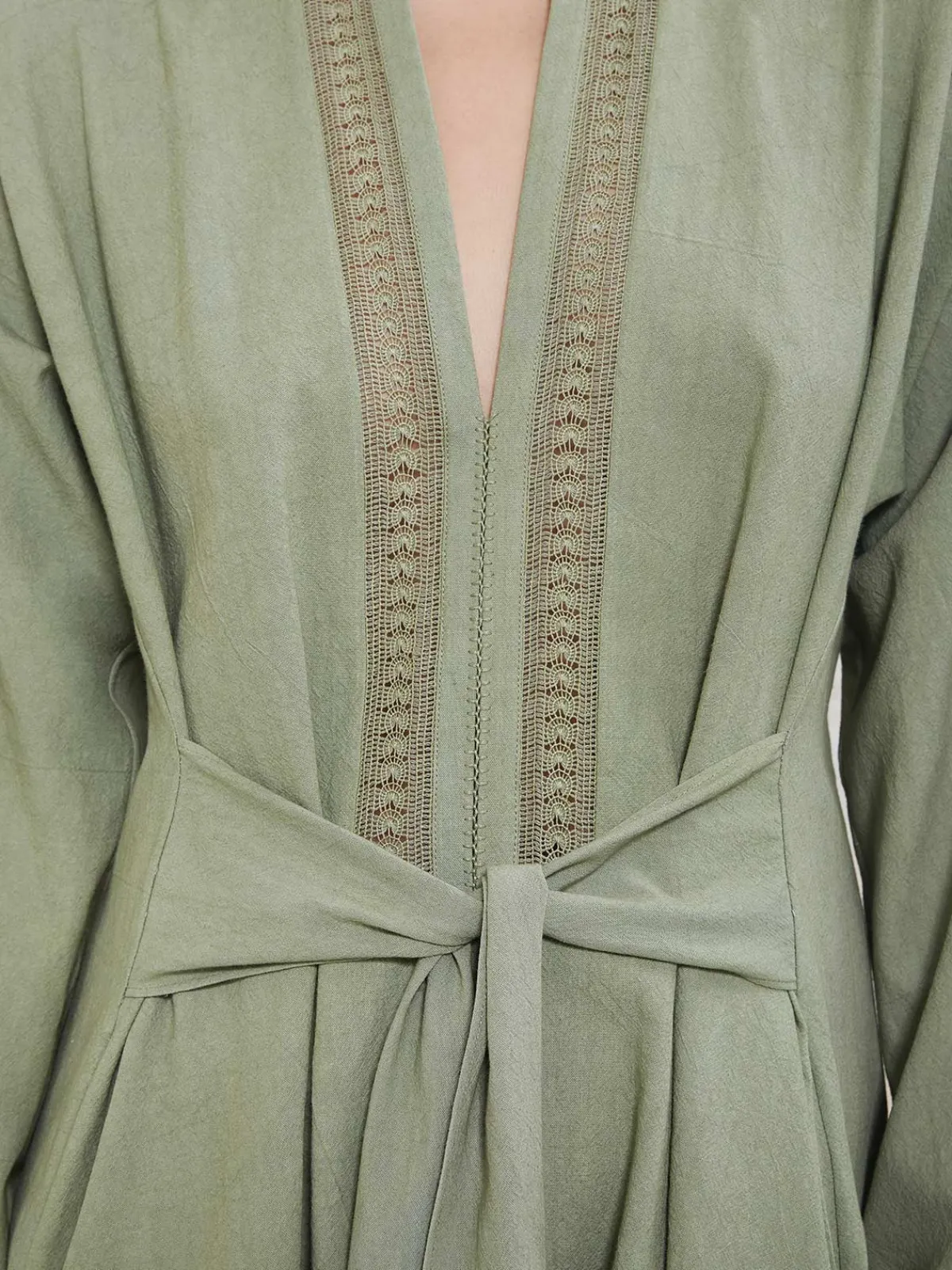 Our Collectiva Concepcion Octavia Midi Dress is relaxed.loose silhouette with long sleeves, V-neckline, side slits, and an adjustable tie at the waist. It’s finished with a slightly rounded hem and slant pockets.The piece is beautifully embellished with a two local techniques: Gaviado, a decorative herringbone hand-stitch and Deshilado,a process of removing weft threads to create a base for intricate lace-like embroidery.