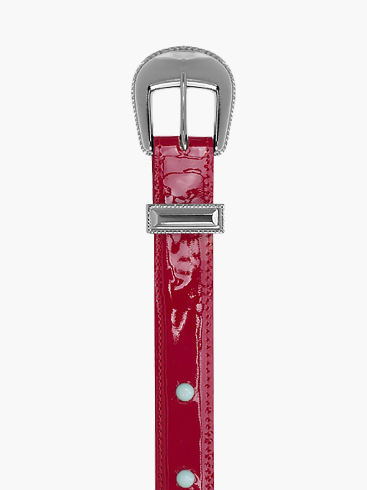 Our DanCassab Clint Belt in Red Blue features a slim silhouette with an adjustable buckle closure and blue stud details. Handcrafted by artisans in Mexico.