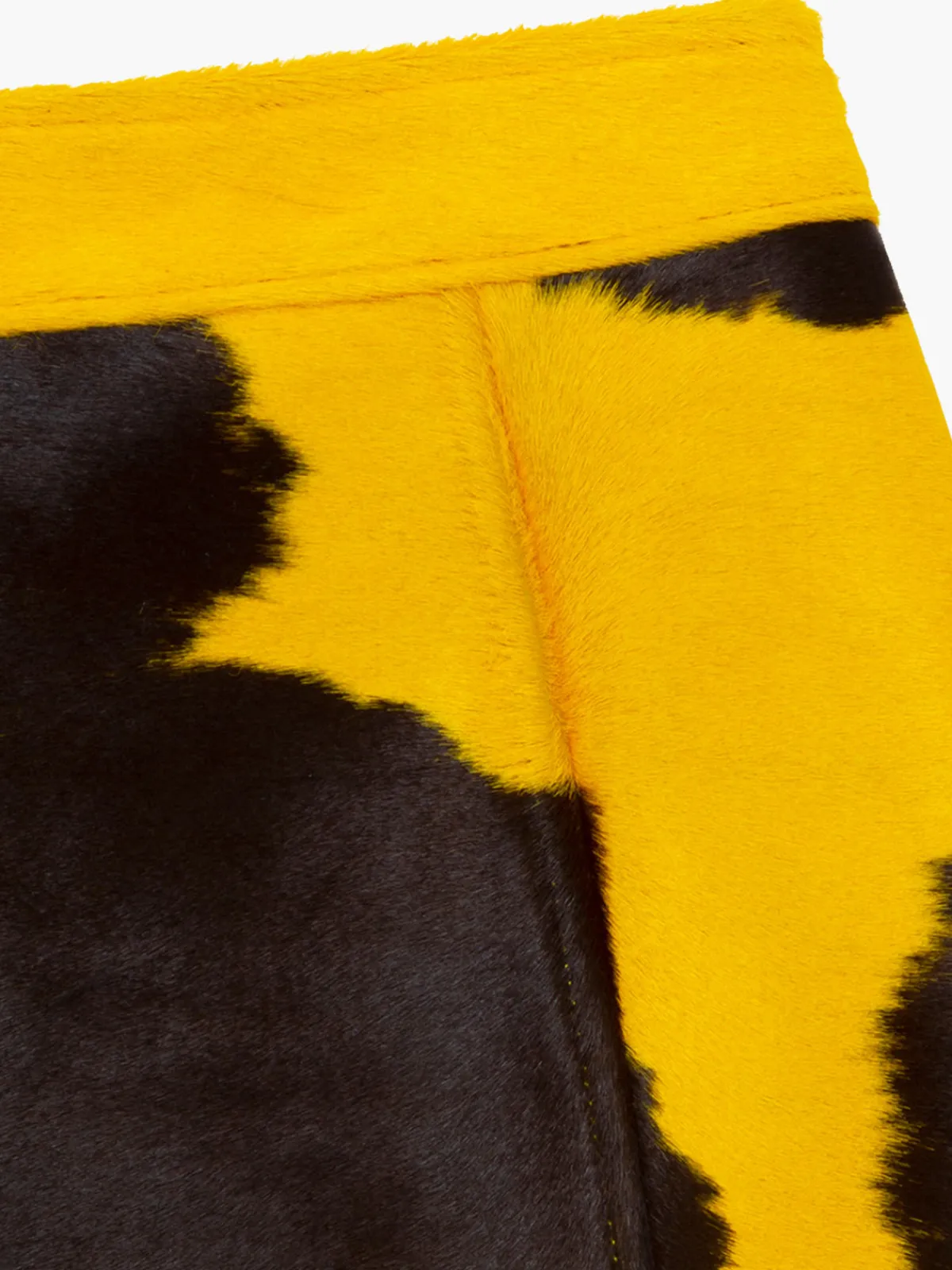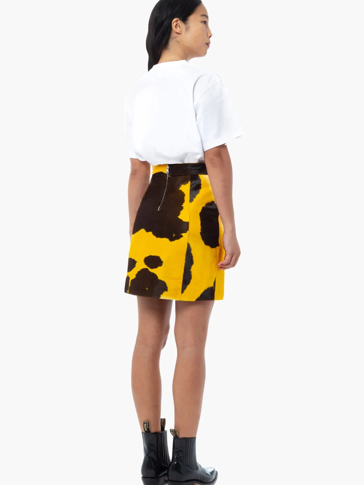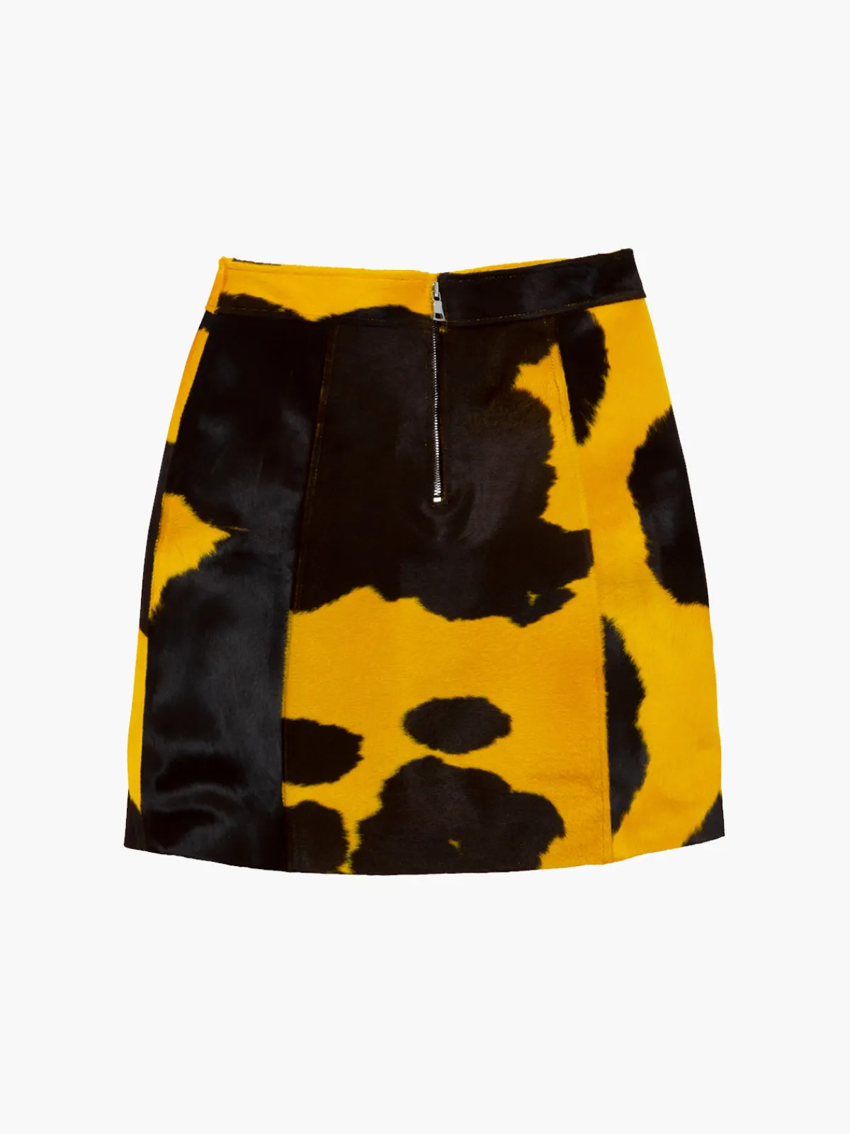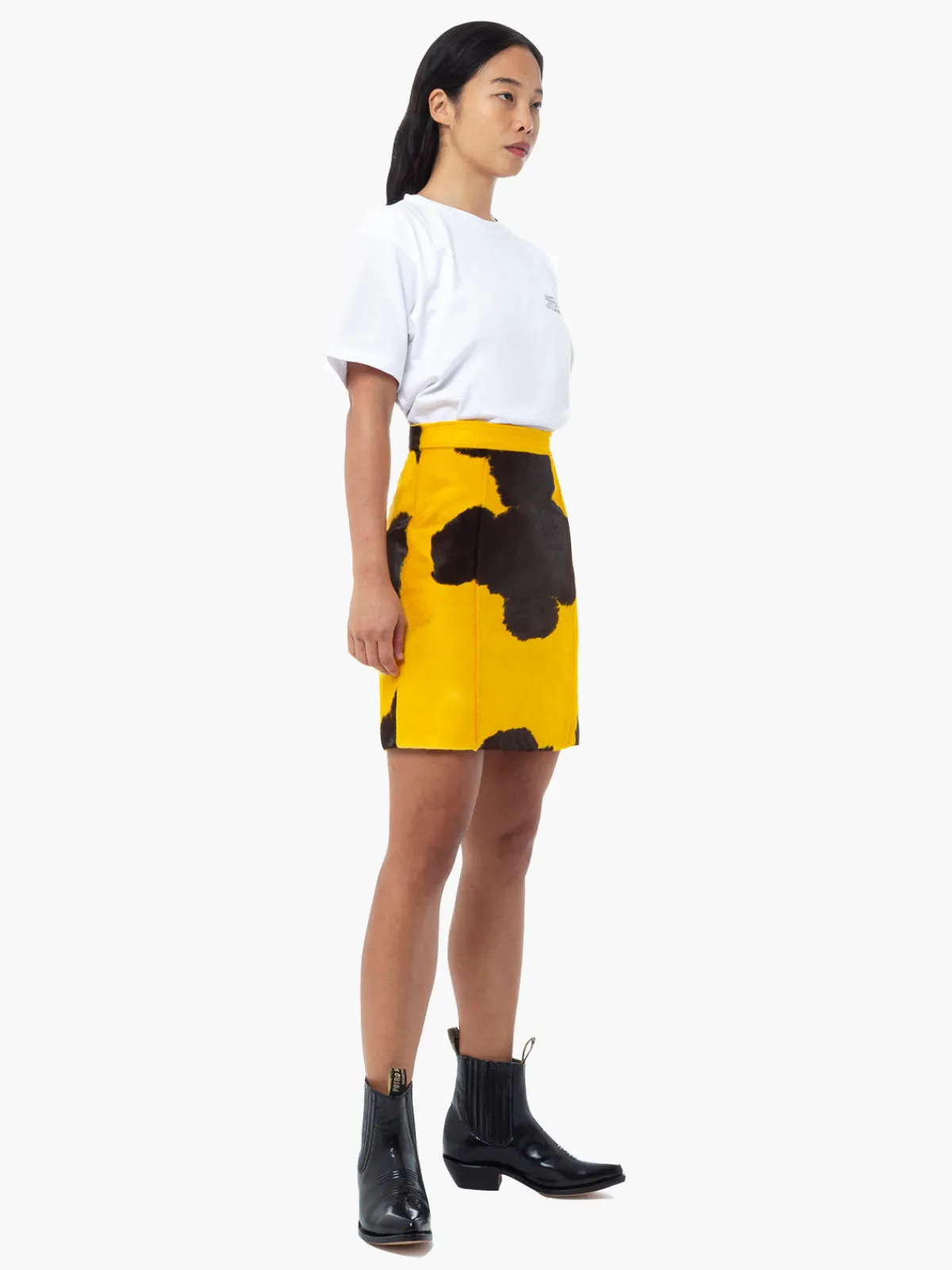 Our DanCassab Eartha Skirt in Neon Yellow Black features a slim mini silhouette with a two-tone cow print and a center back zipper. Handcrafted by artisans in Mexico.