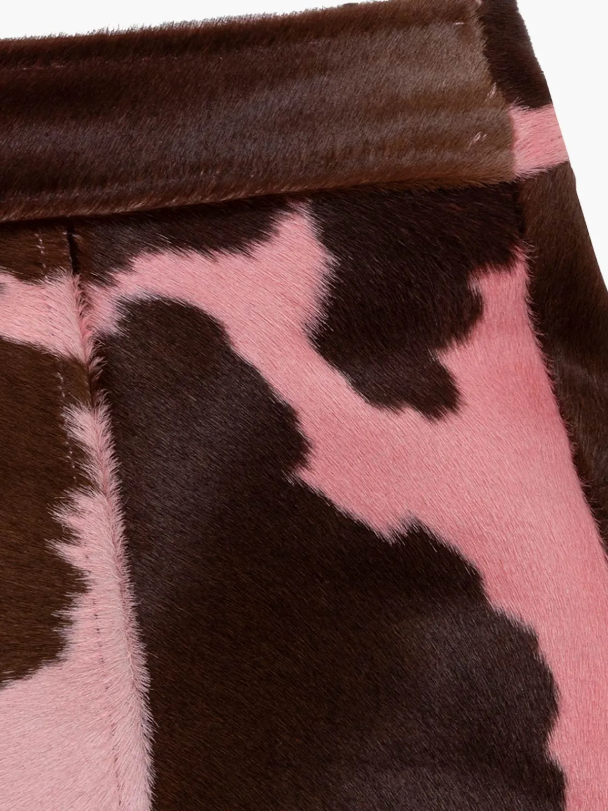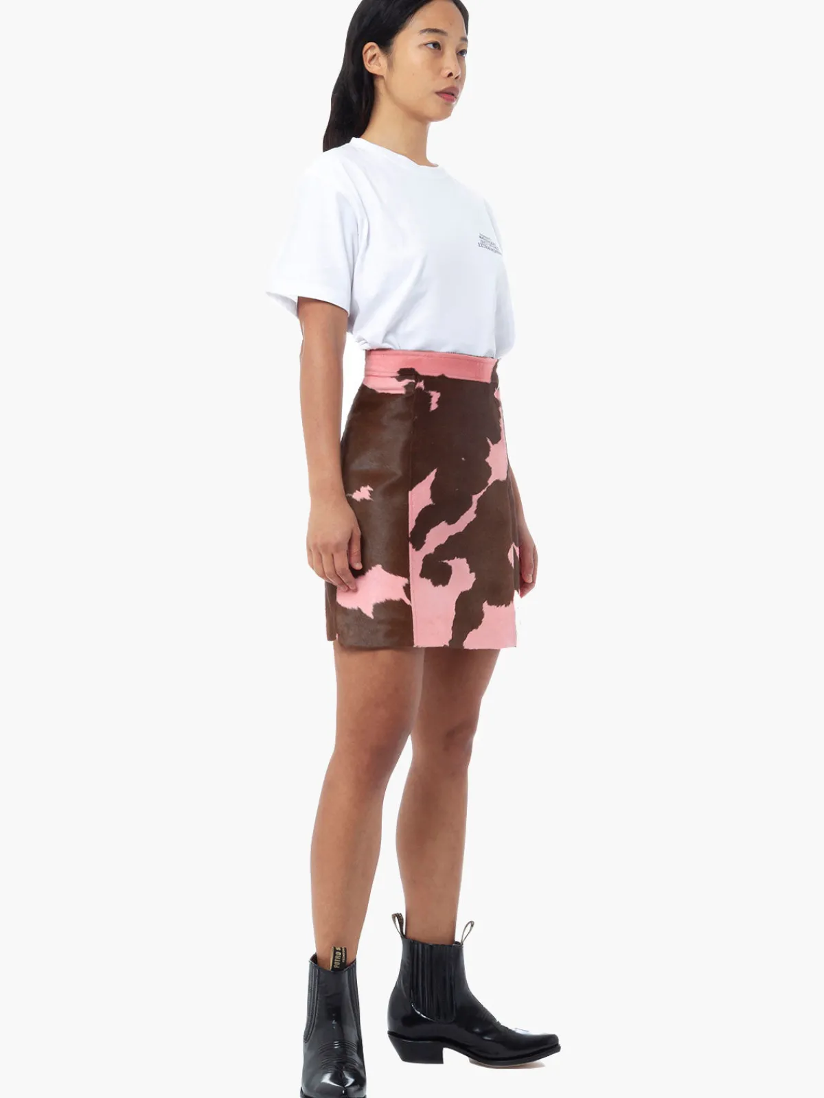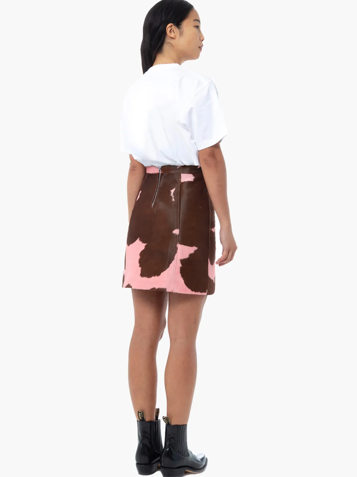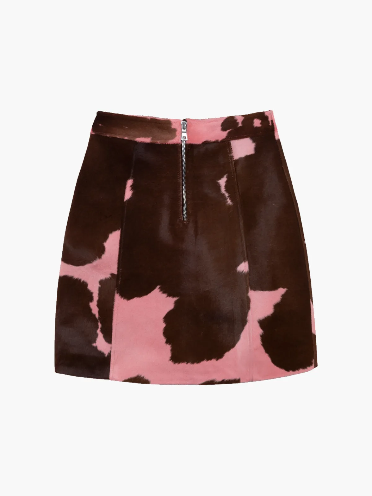 Our DanCassab Eartha Skirt in Pink Brown features a slim mini silhouette with a two-tone cow print and a center back zipper. Handcrafted by artisans in Mexico.