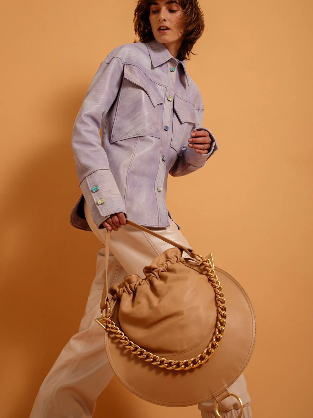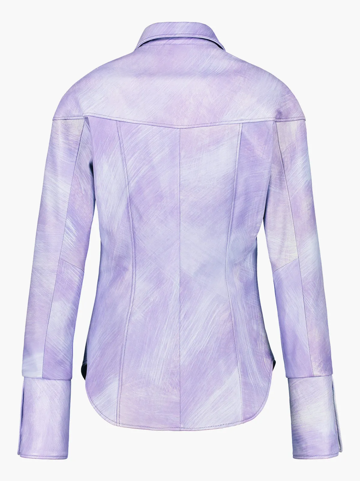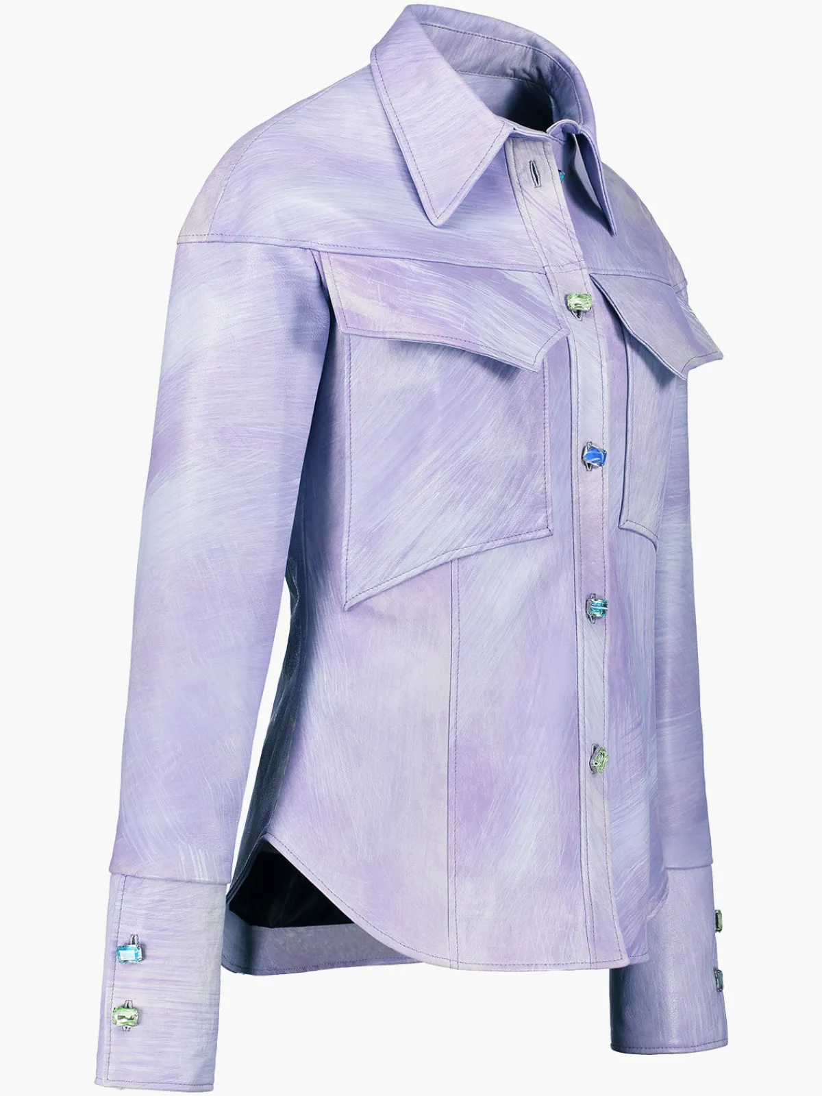 Our DanCassab Felix Shirt in Lilac features a relaxed silhouette with long sleeves with zippered cuffs, crystal bead buttons down the front, a collar, and flap front pockets. Handcrafted by artisans in Mexico.