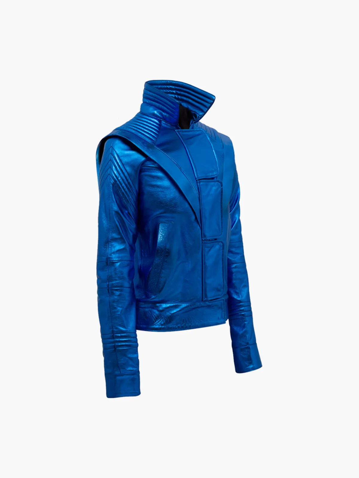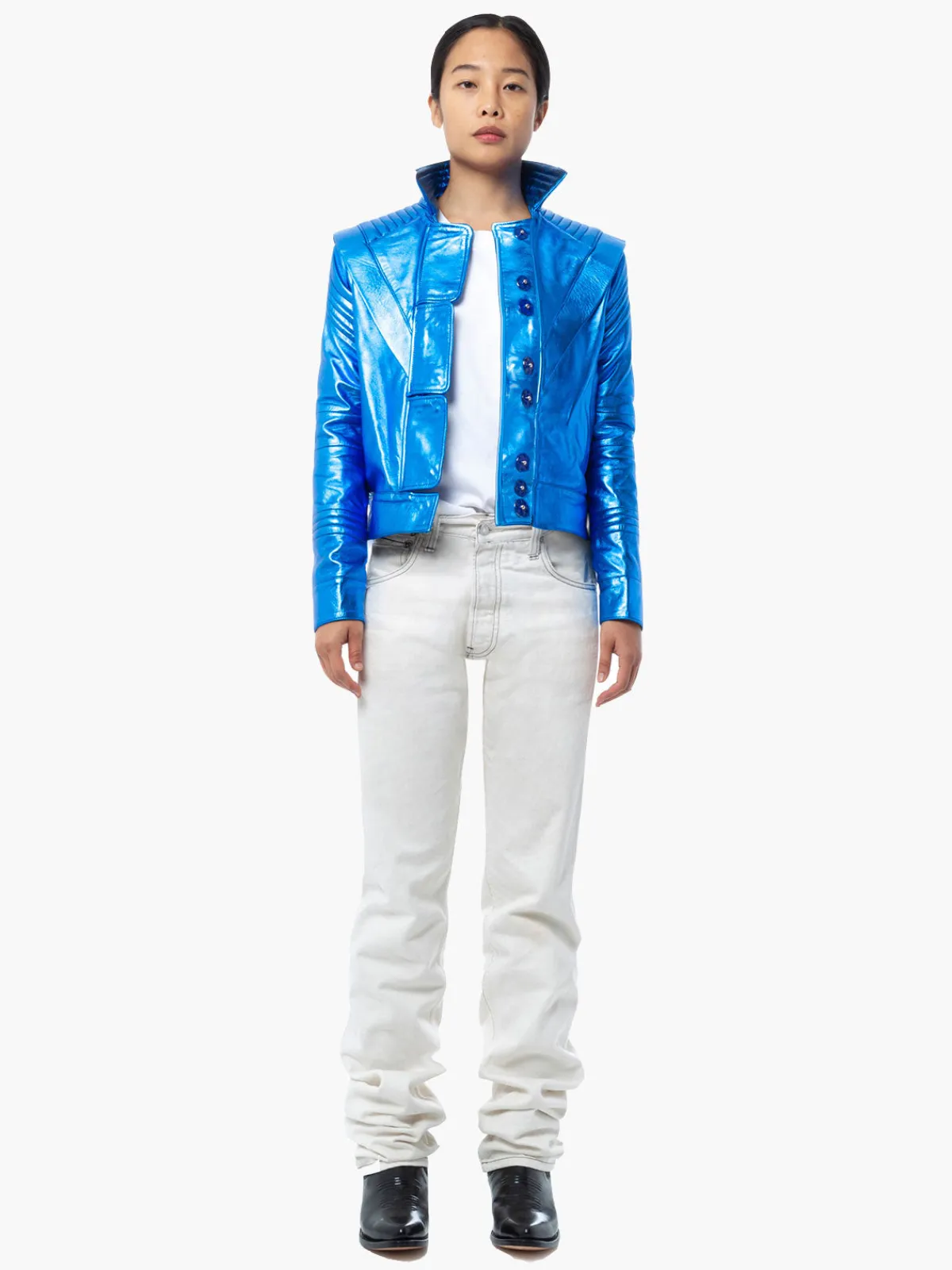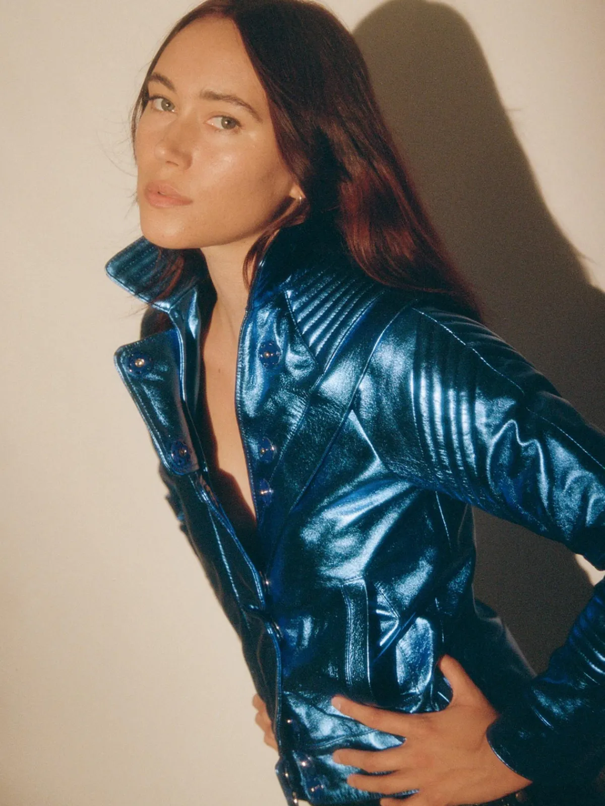 Our DanCassab Frida Jacket is bold with its metallic finish, stitched details, and fitted silhouette. This jacket is detailed with two side pockets and a stand up collar. Handcrafted by artisans in Mexico.