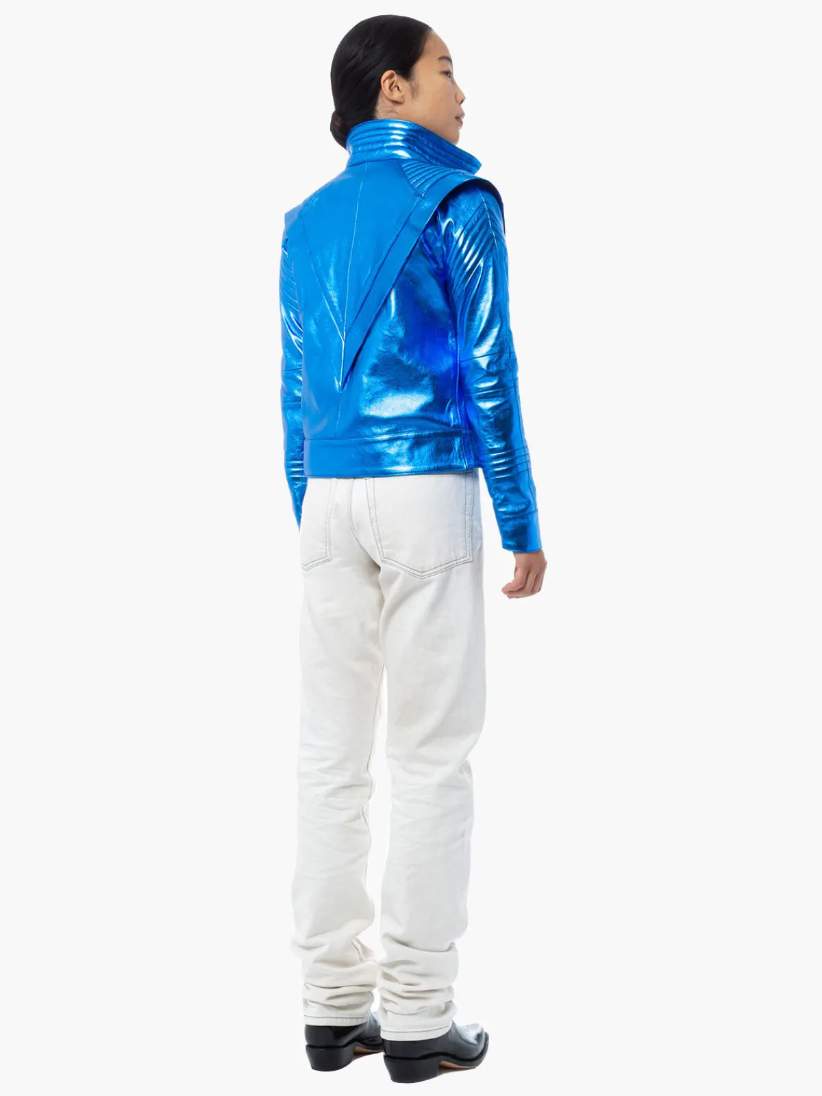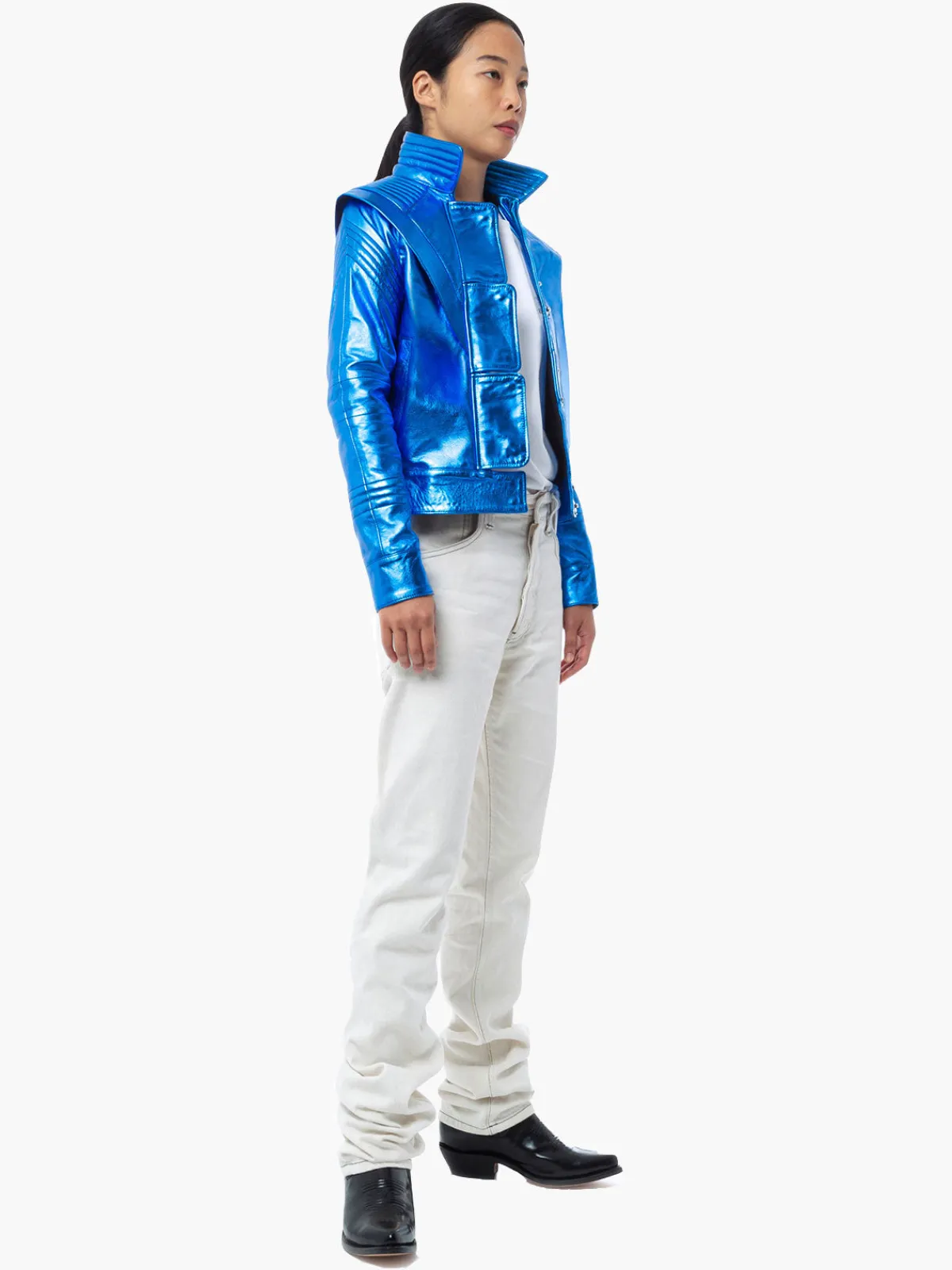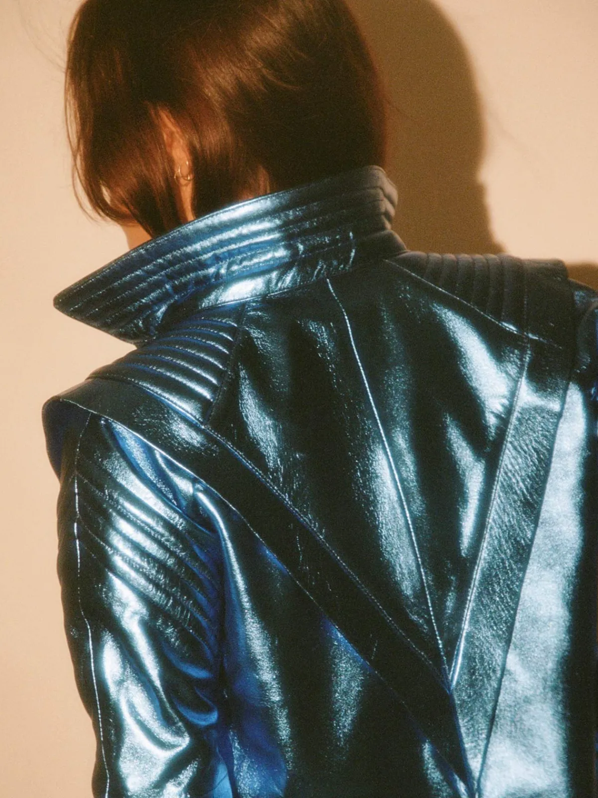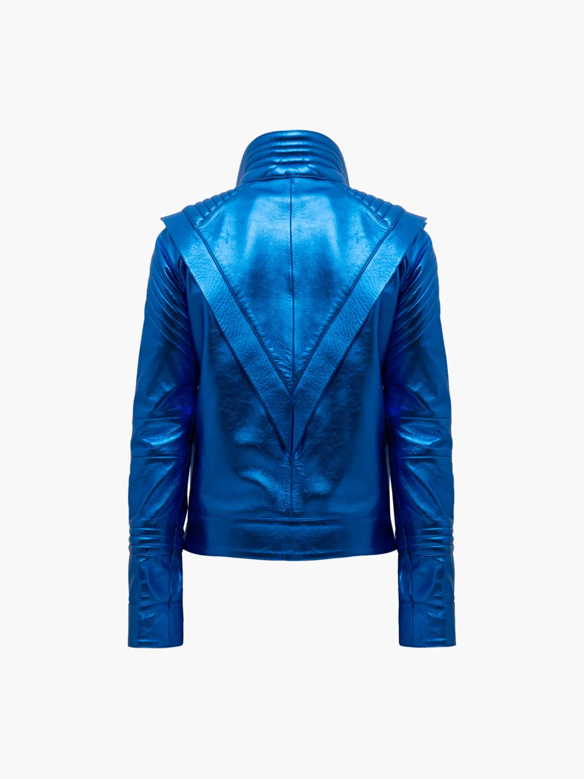 Our DanCassab Frida Jacket is bold with its metallic finish, stitched details, and fitted silhouette. This jacket is detailed with two side pockets and a stand up collar. Handcrafted by artisans in Mexico.