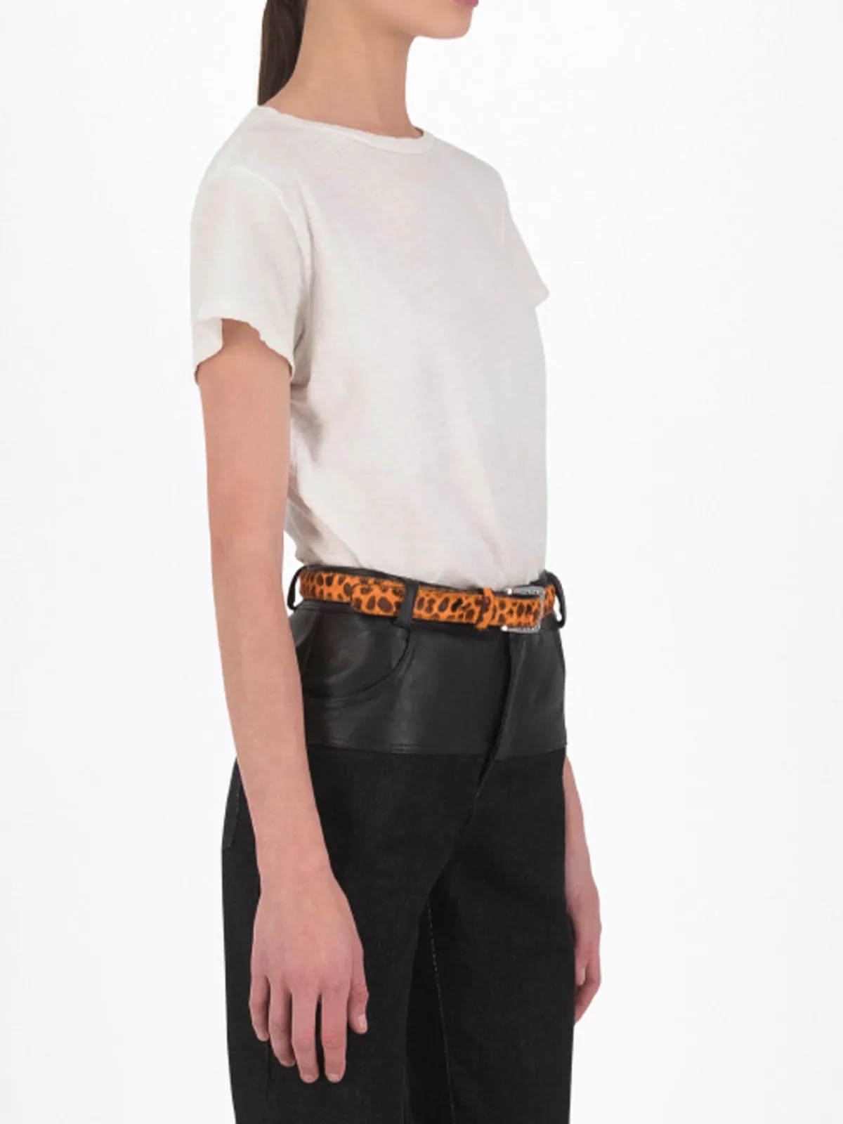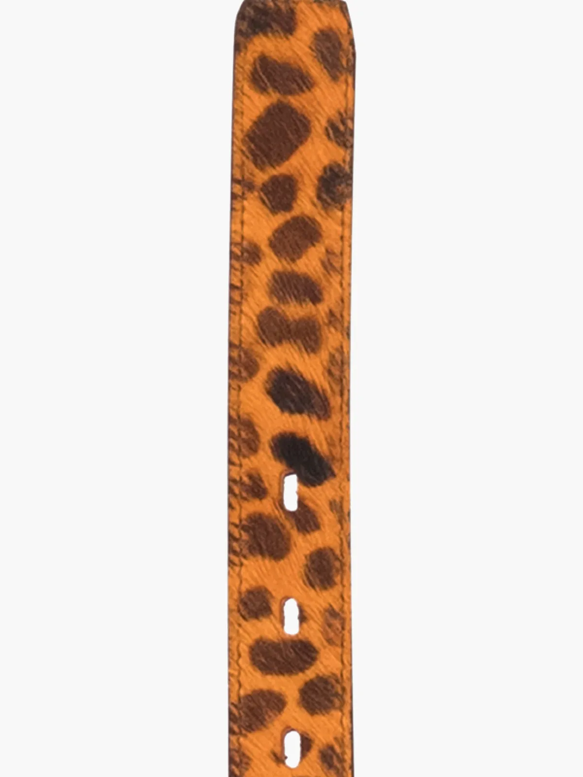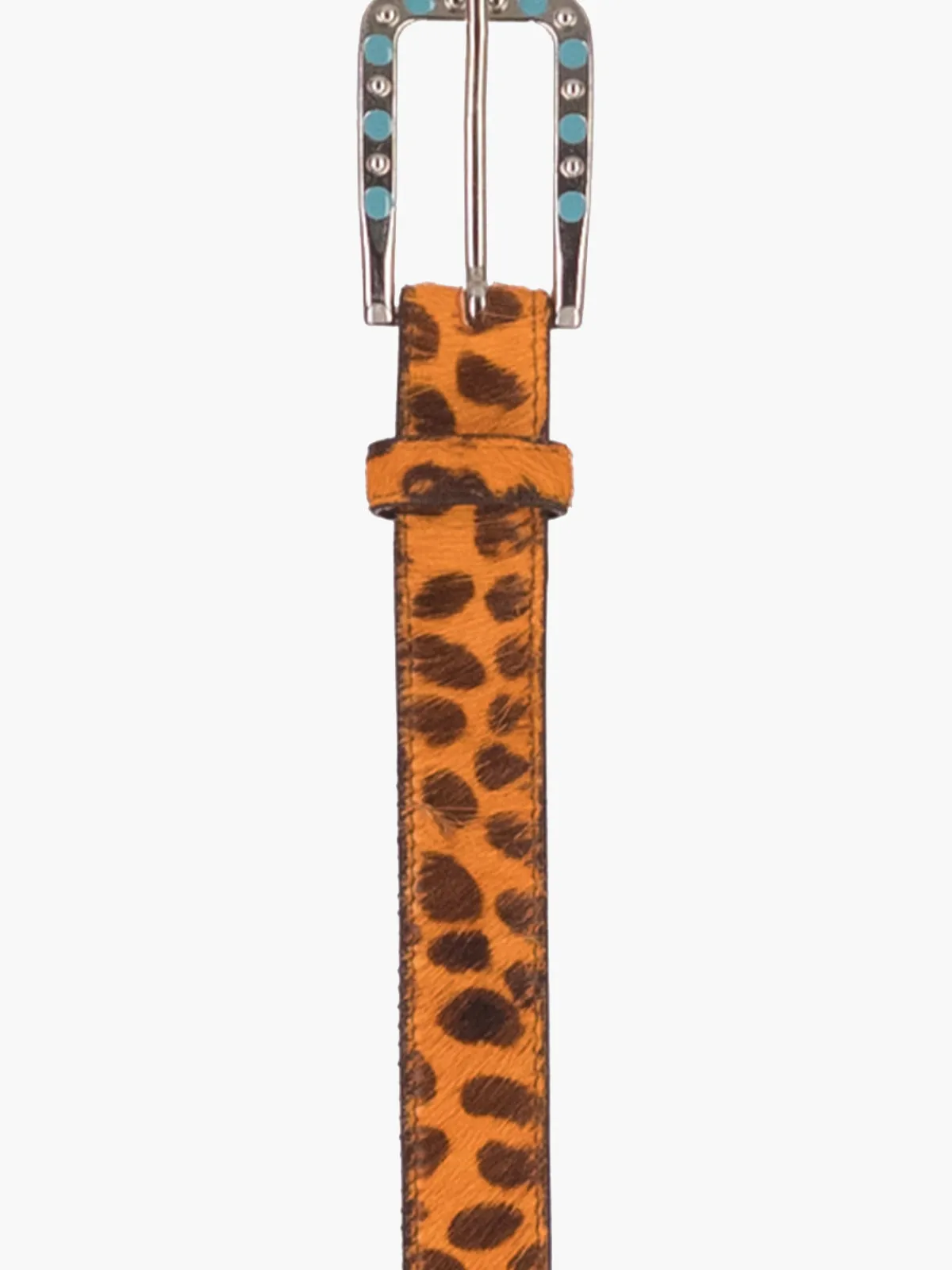 Our DanCassab Gaia Belt in Orange Brown features a fun animal print with silver and turquoise embellished buckle. Handcrafted by artisans in Mexico.