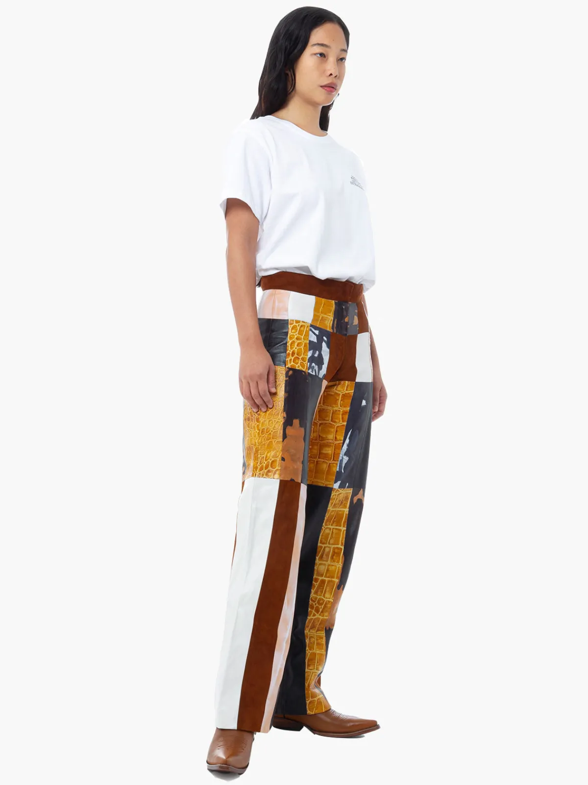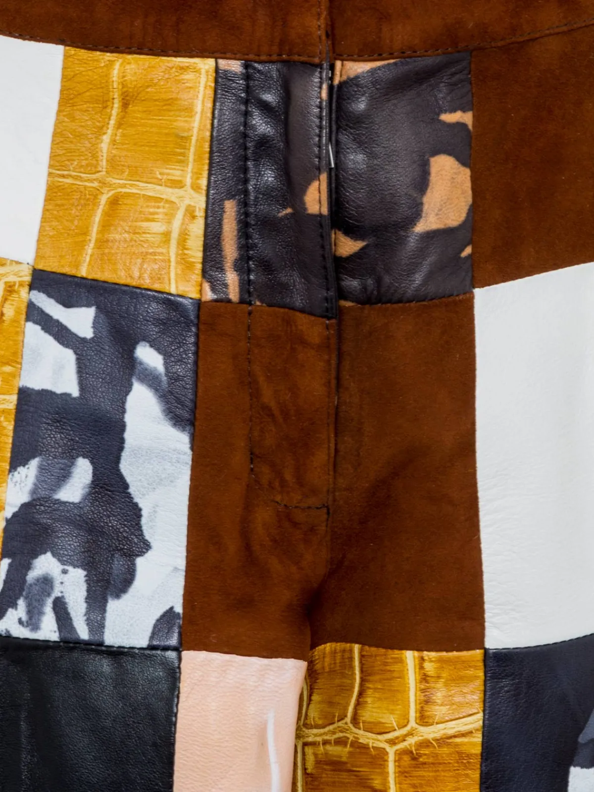 Our DanCassab Gloria Pants in Multicolored feature a patchwork pattern in a blend of neutral colors, textures, and skins. These pants boast a high waist silhouette with a zipper closure and straight leg fit. Handcrafted by artisans in Mexico.