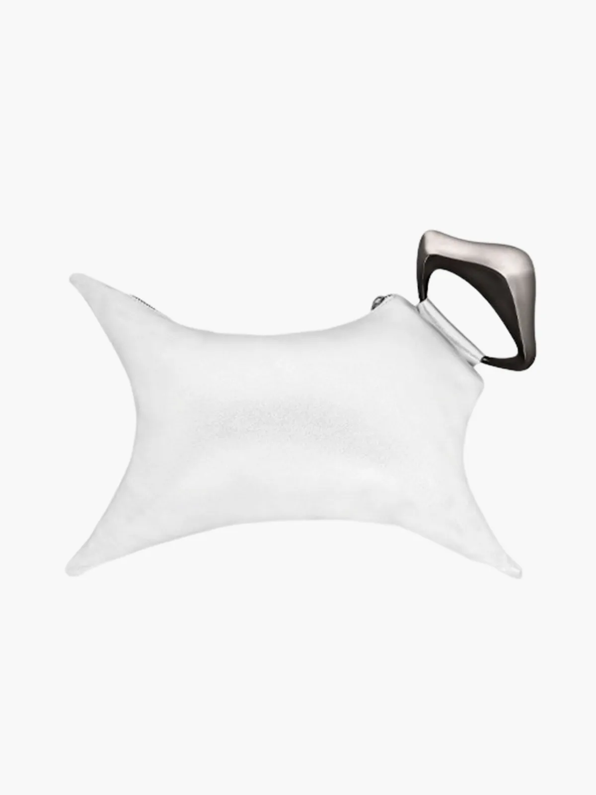 Our DanCassab Harper Bag in Silver boasts a sleek geometric shape with star-shaped points on each edge, a metal handle, and a zipper closure. Handcrafted by artisans in Mexico.