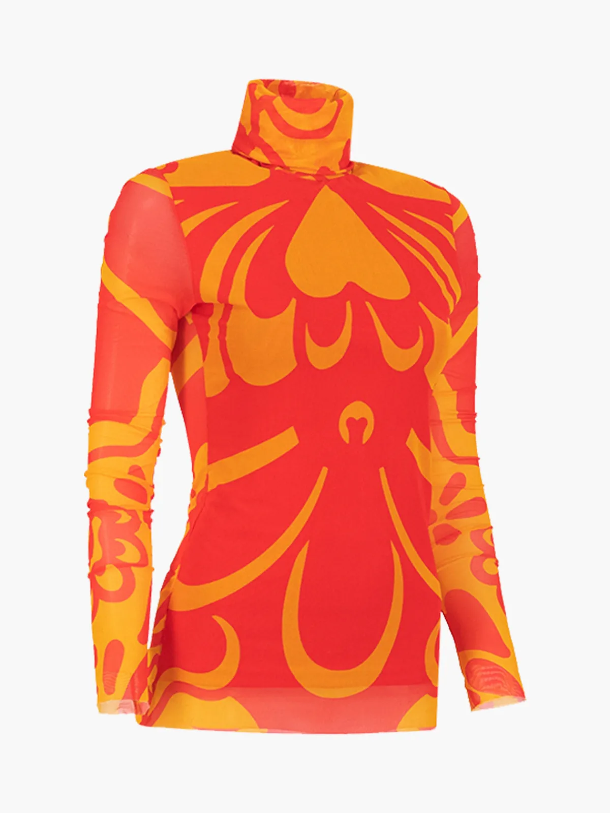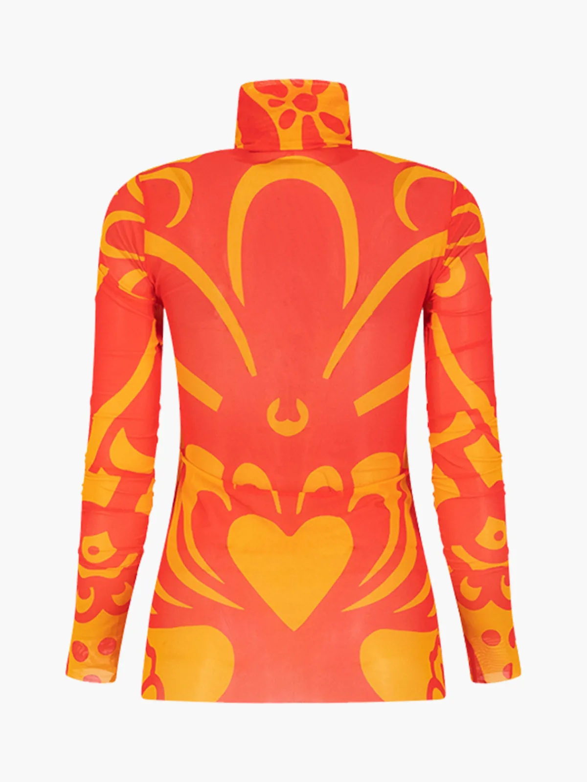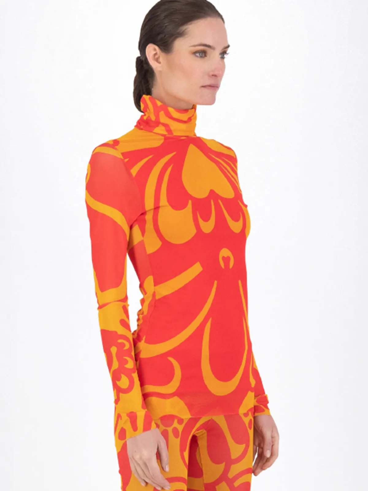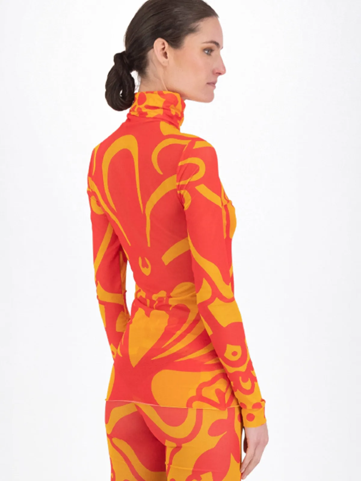 Our DanCassab Kelsey Top in Yellow Orange boasts a fitted silhouette with long sleeves, a turtleneck, and a bold allover print. Team with our Antonella Leggings for a coordinated look. Handcrafted by artisans in Mexico.