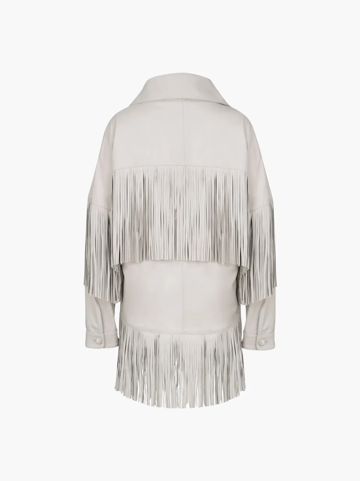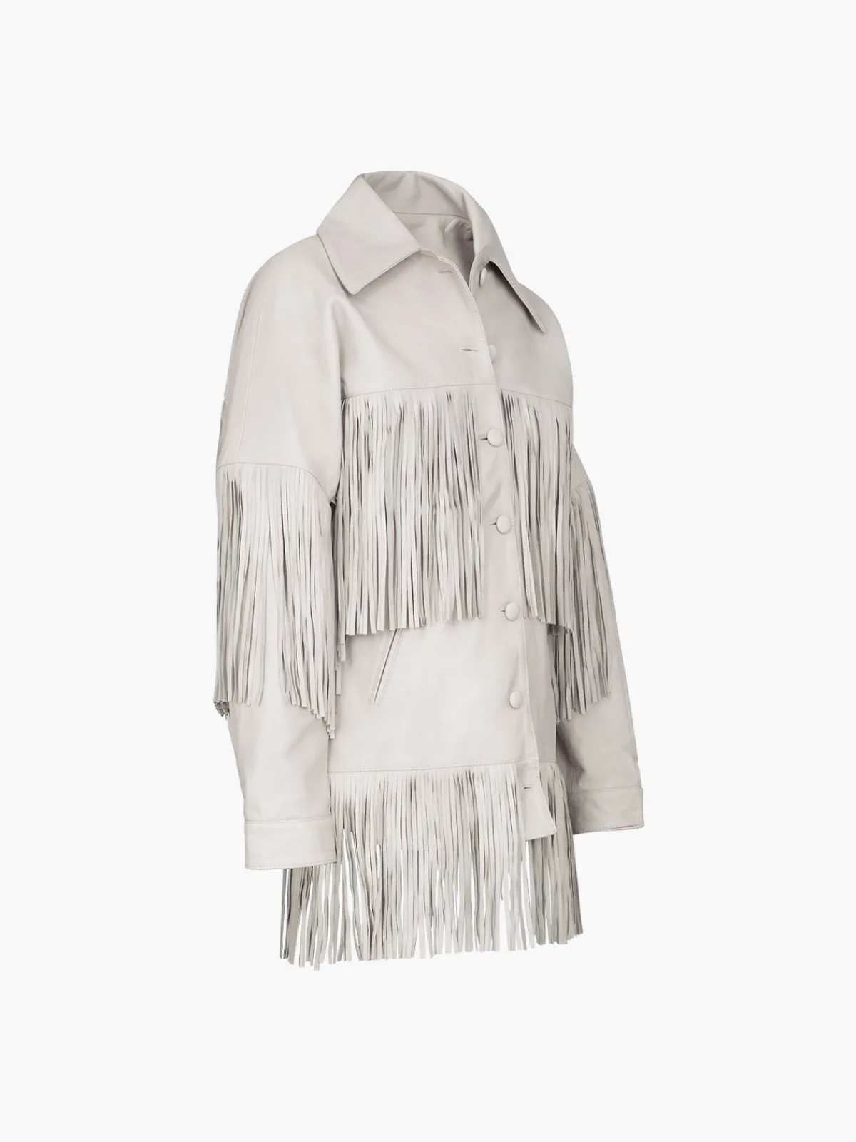 Our DanCassab Loretta Jacket in Moon Grey features long sleeves, front button closures, and layers of fringe across the chest, back, and sleeves. This design is accented with two hand pockets and an extra layer of fringe at the hem. Handcrafted by artisans in Mexico using materials that are byproducts of the local food industry and are vegetable-dyed. Each piece takes up to a week to create by hand.
