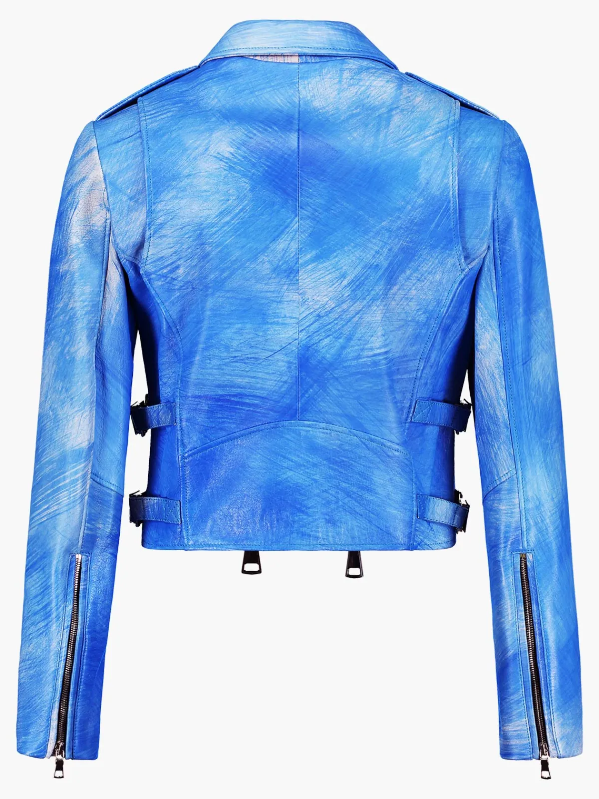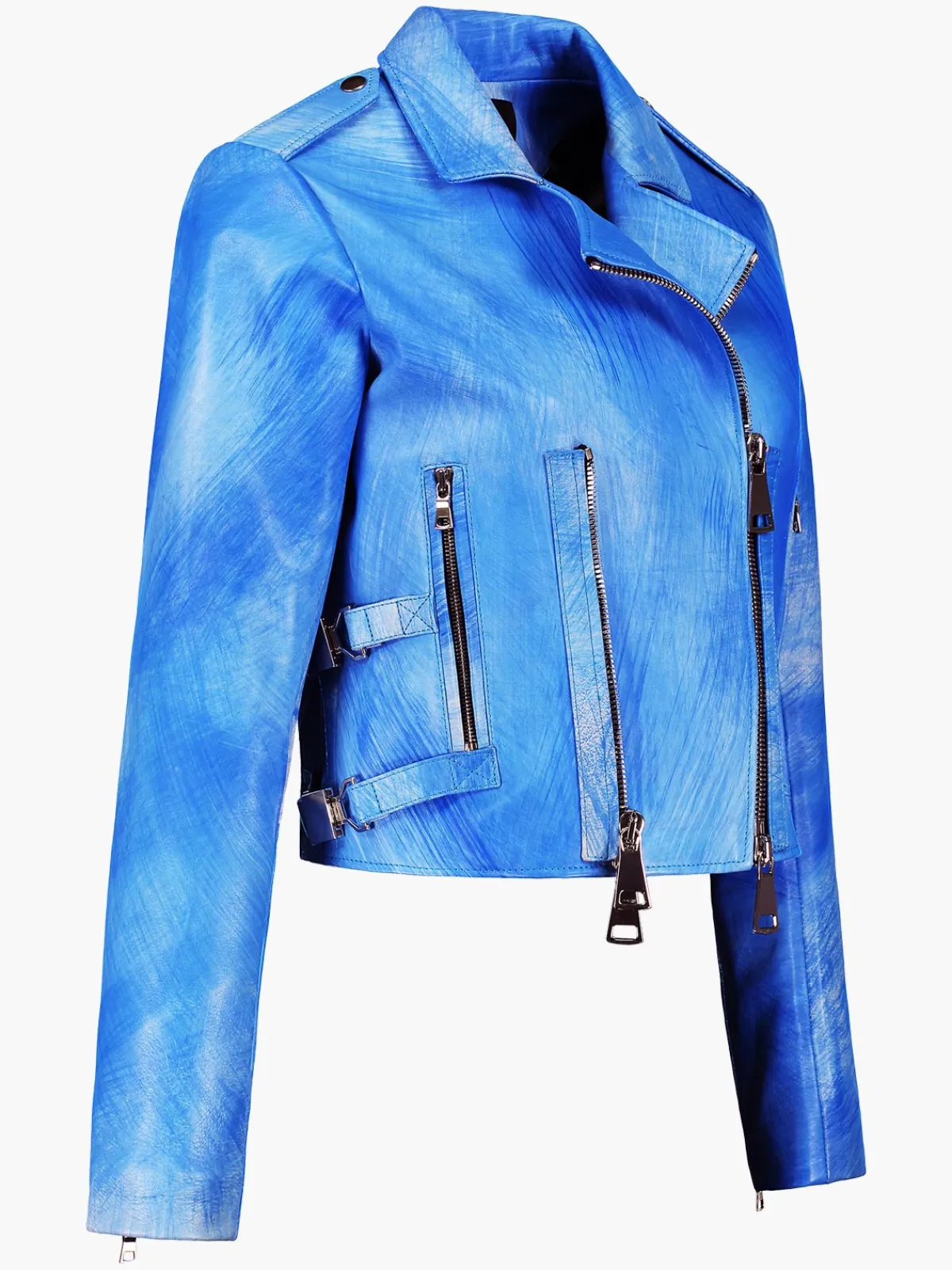 Our DanCassab Lucia Jacket in Blue features a moto silhouette in a cropped length with double front zippers, two front zipper pockets, zippered cuffs, and two accent straps on each side. Handcrafted by artisans in Mexico.