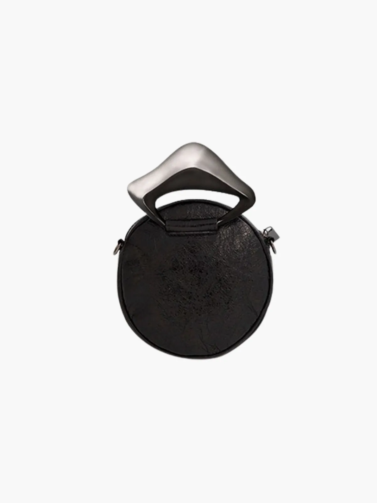 Our DanCassab Luna Bag in Black features a chic round shape with a secure zipper closure and a sculpted metal handle. Handcrafted by artisans in Mexico.