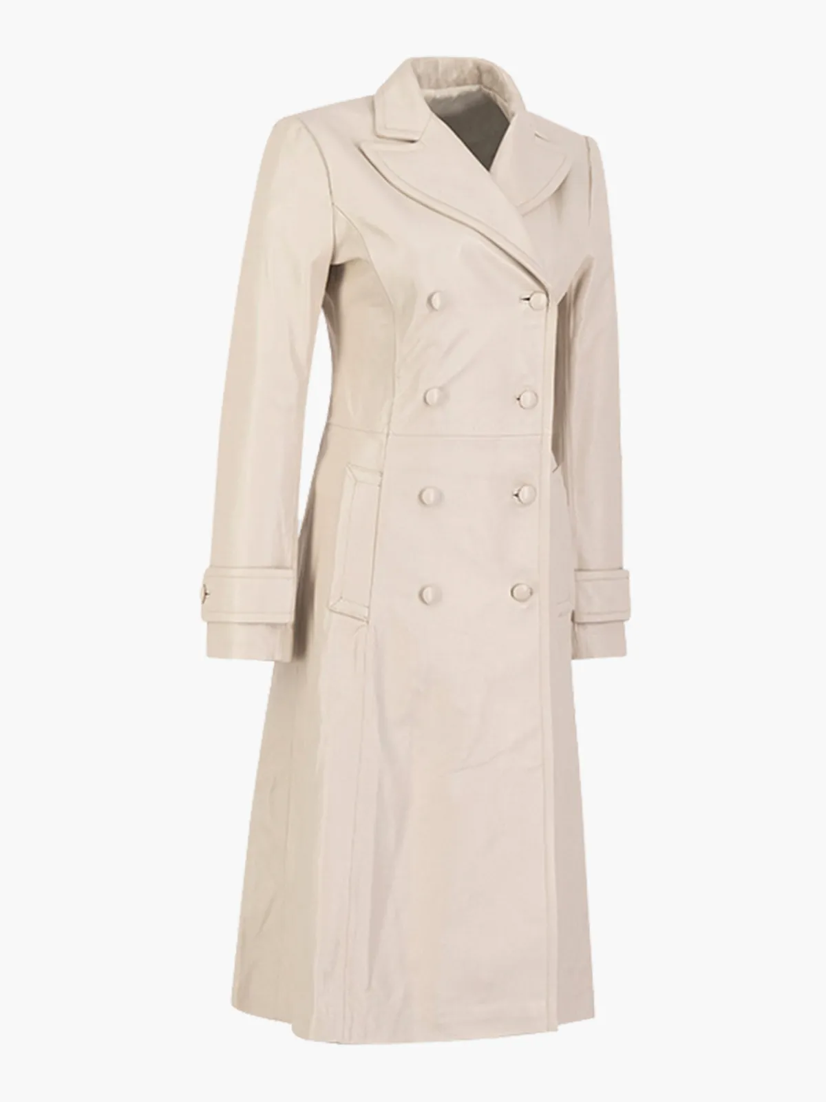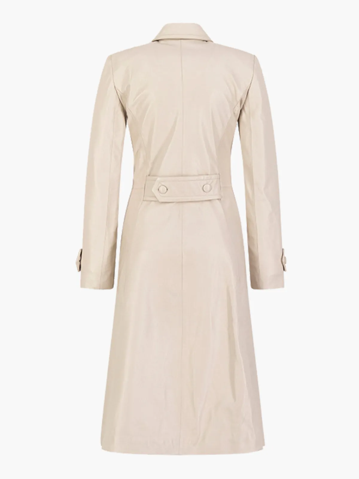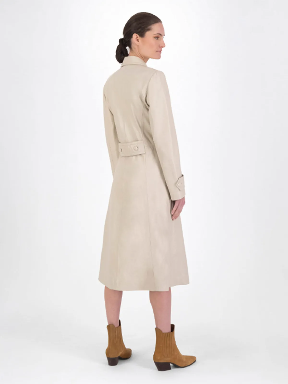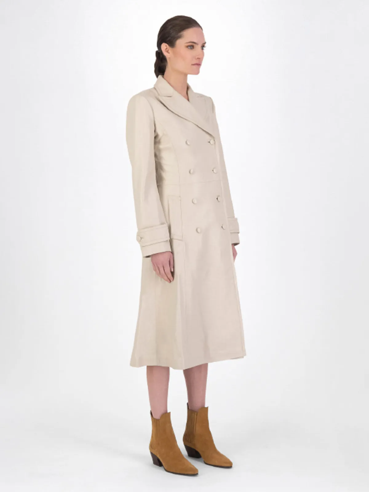 Our DanCassab Nova Coat in Beige features double breasted construction with long sleeves, front buttons, and wide lapels in a knee length silhouette. Handcrafted by artisans in Mexico.