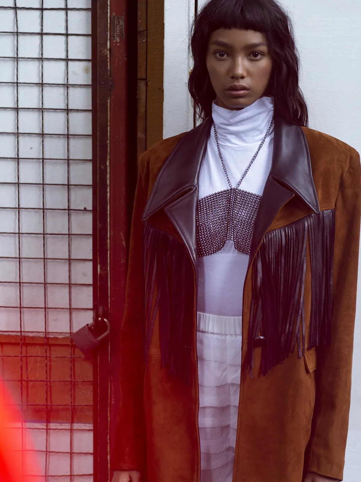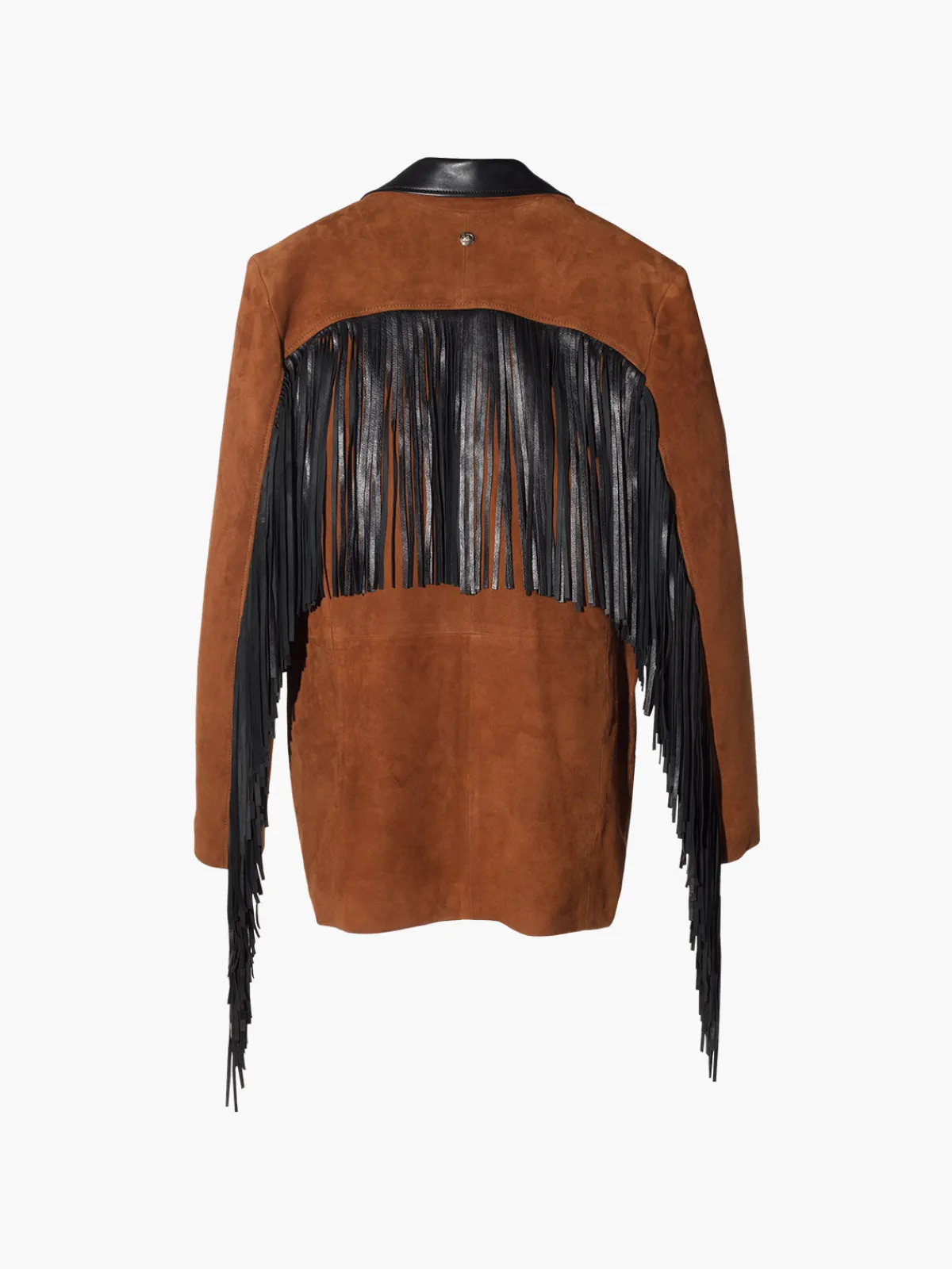 Our DanCassab Patsy Jacket features long sleeves, a button closure, a contrast collar, and fringe trim. Detailed with side pockets and long fringe layers that stretch across the back and down each sleeve. Handcrafted by master artisans in Mexico.