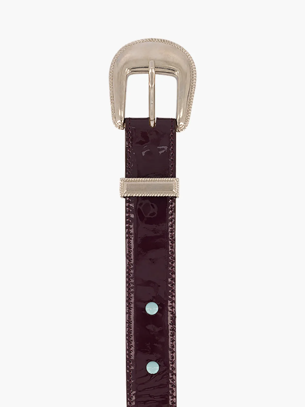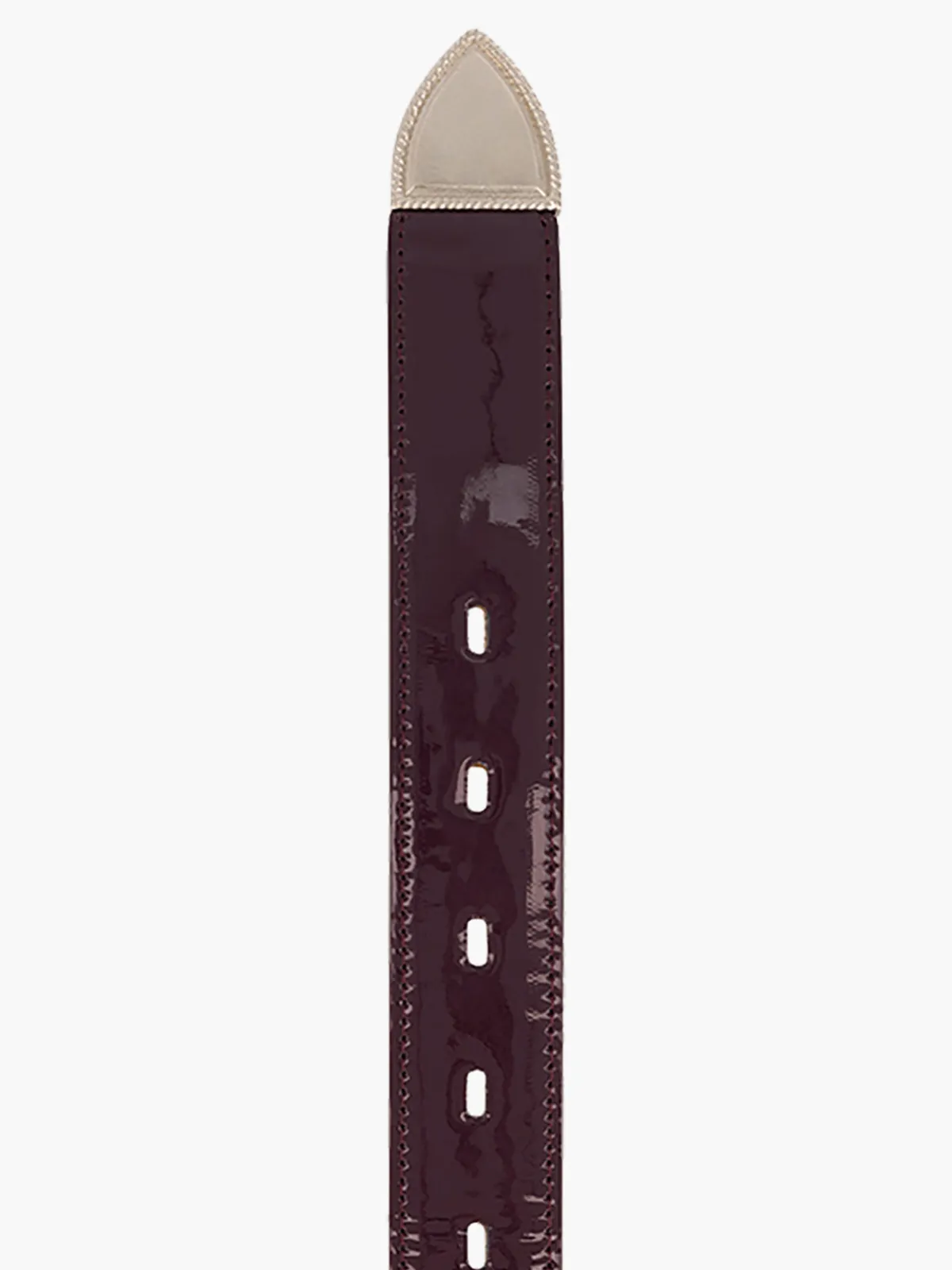 Our DanCassab Ray Belt in Burgundy Blue features a slim design with an adjustable buckle closure and blue stud accents. Handcrafted by artisans in Mexico.
