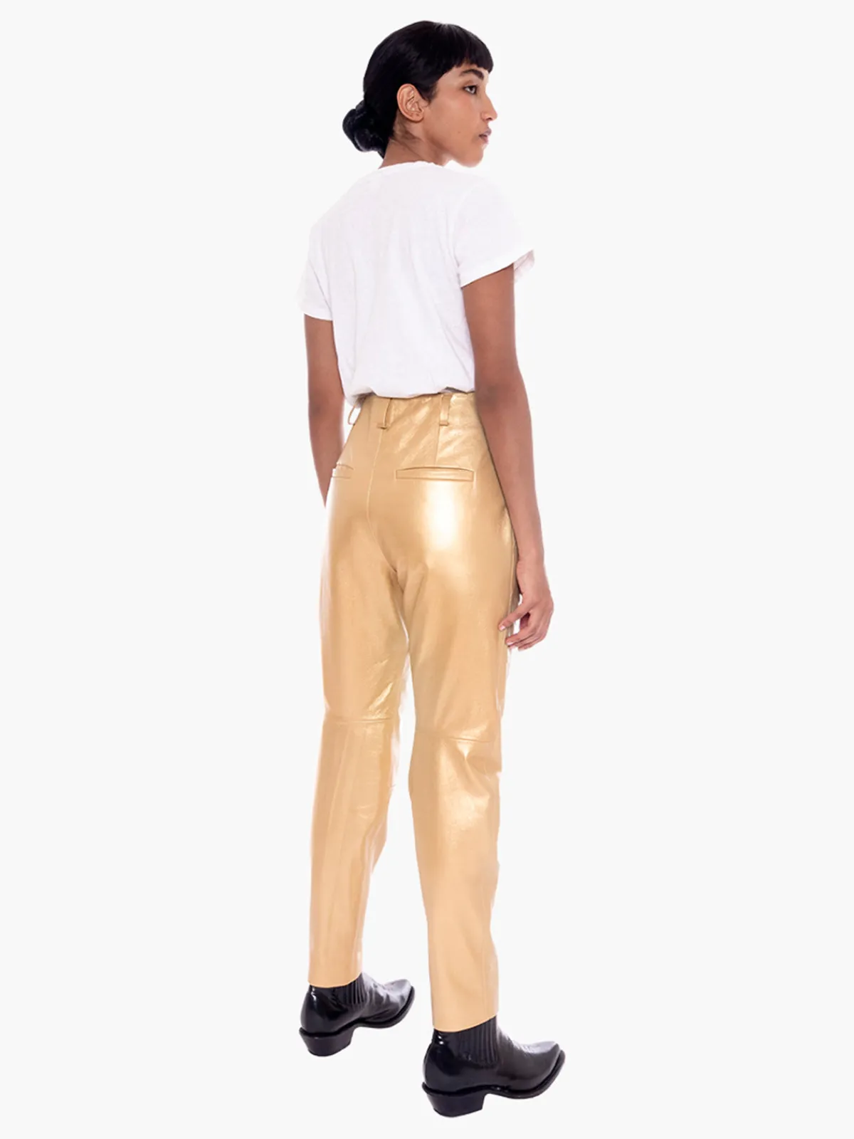Our DanCassab Verona Pants in Golden Pearl feature a straight leg silhouette with a high waist, slant front pockets, back besom pockets, and belt loops. Handcrafted by artisans in Mexico.
