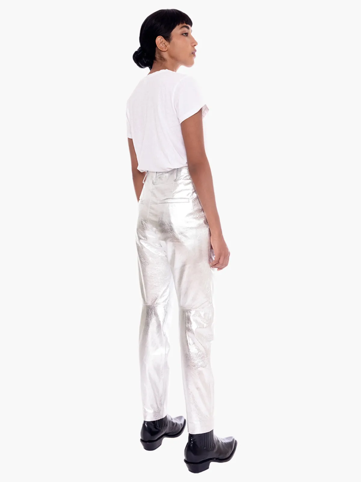 Our DanCassab Verona Pants in Silver feature a straight leg silhouette with a high waist, slant front pockets, back besom pockets, and belt loops. Handcrafted by artisans in Mexico.