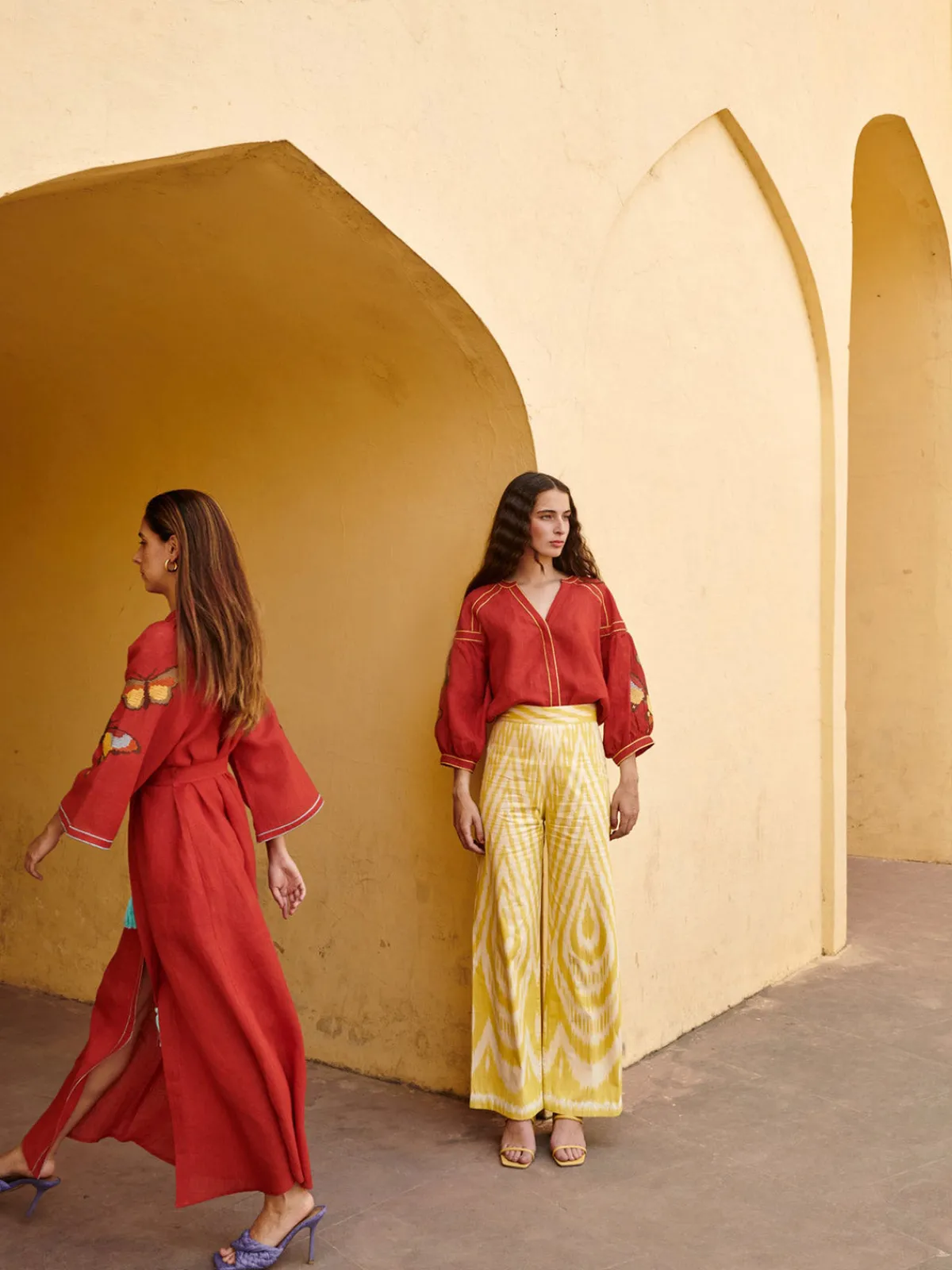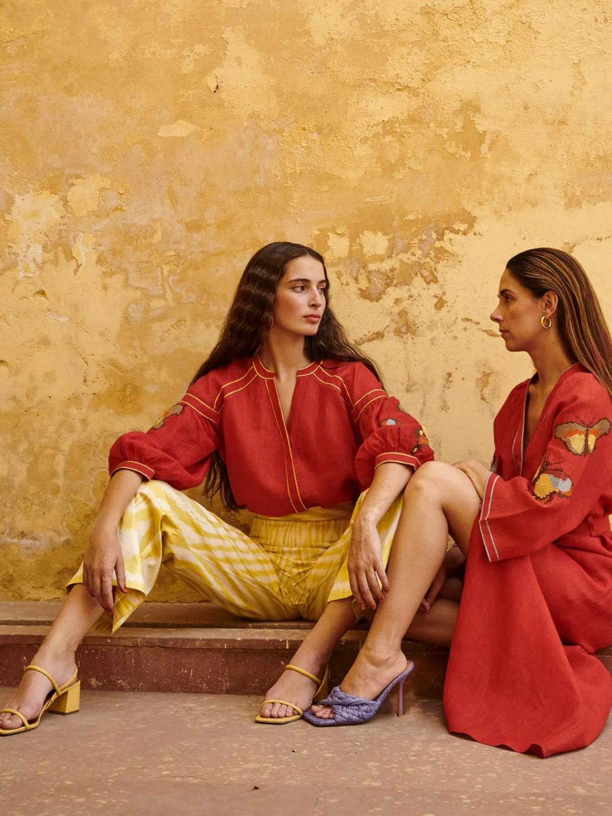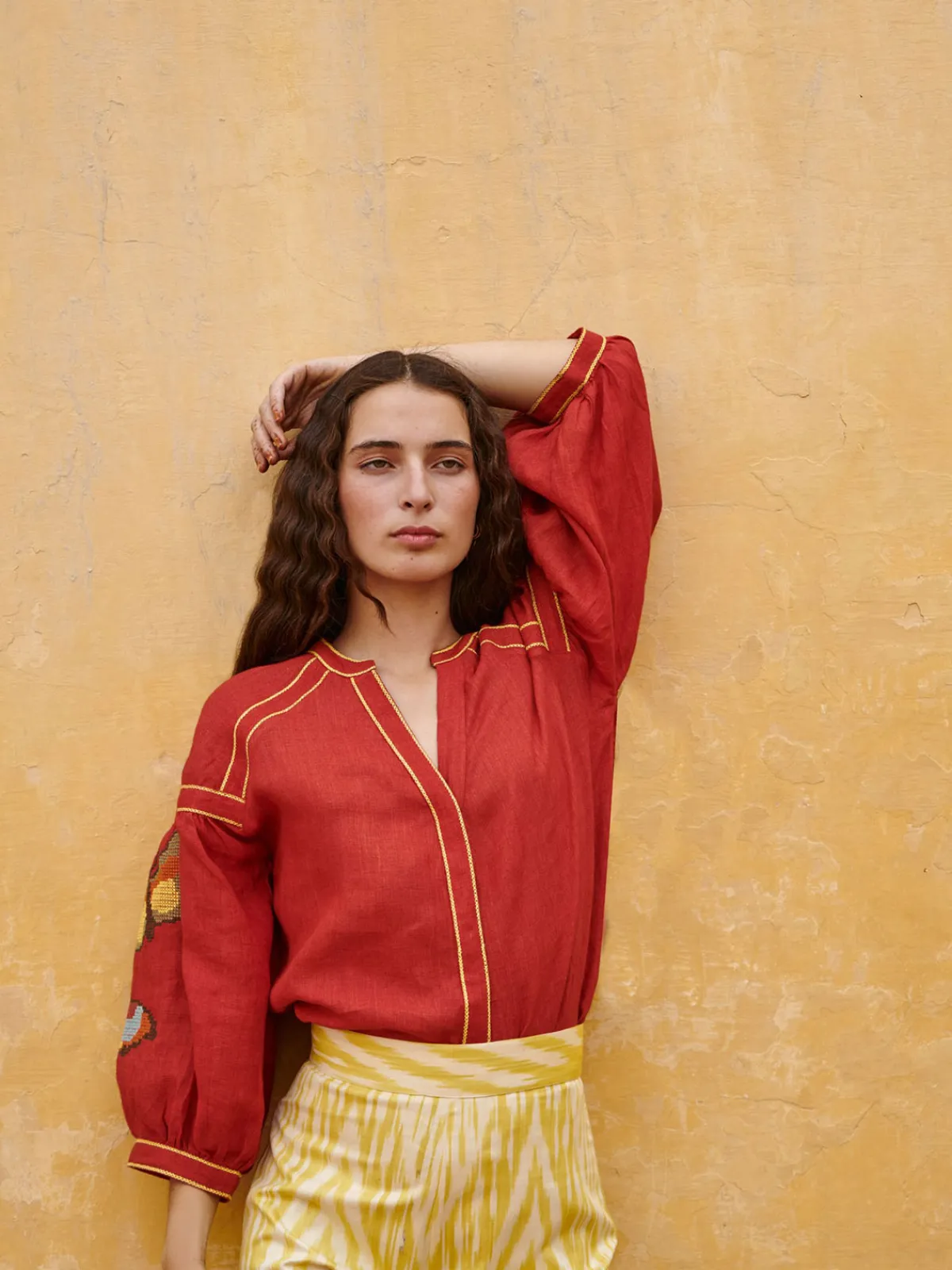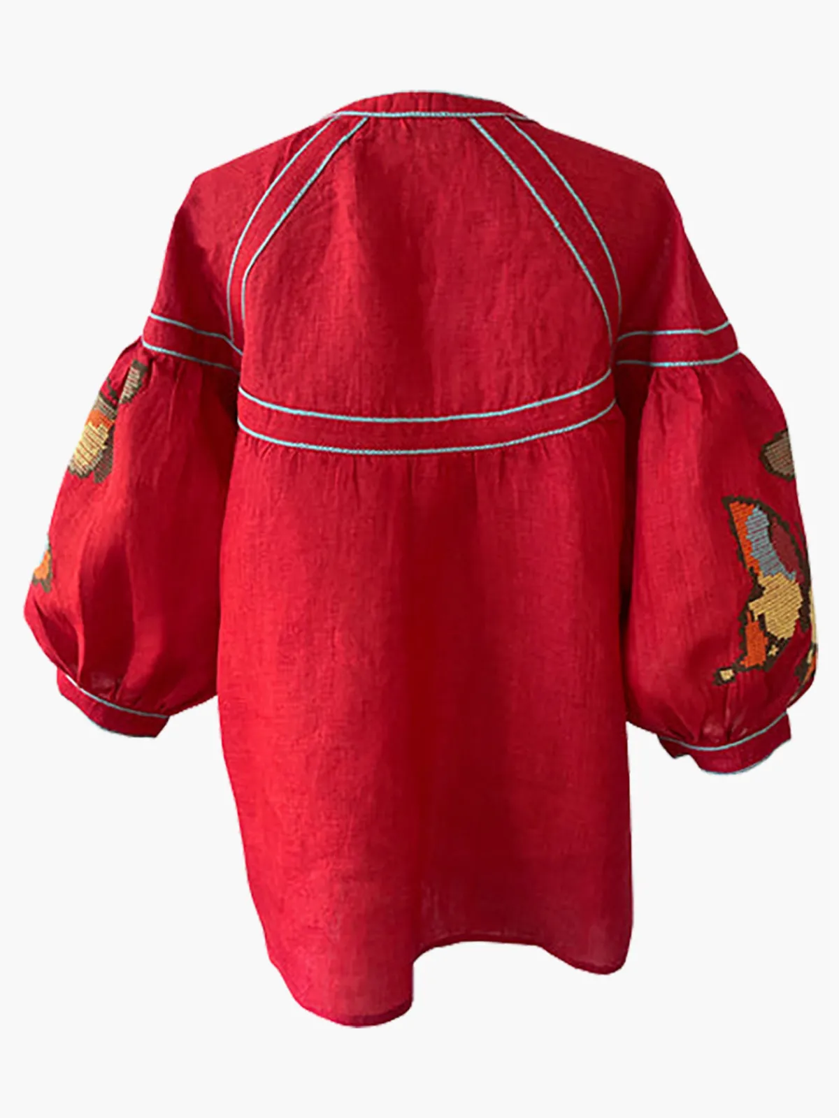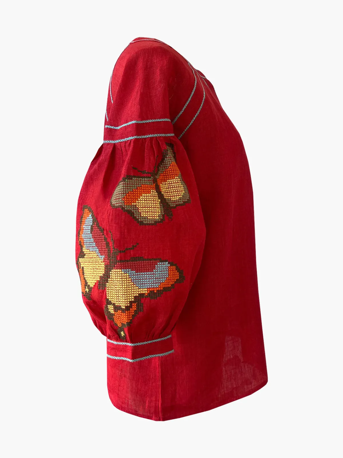 Our De CastroButterfly Blouse is effortless in a relaxed silhouette with puffed sleeves, a V-neckline, a button front placket, and embroidered accents. Handcrafted by artisans in India.