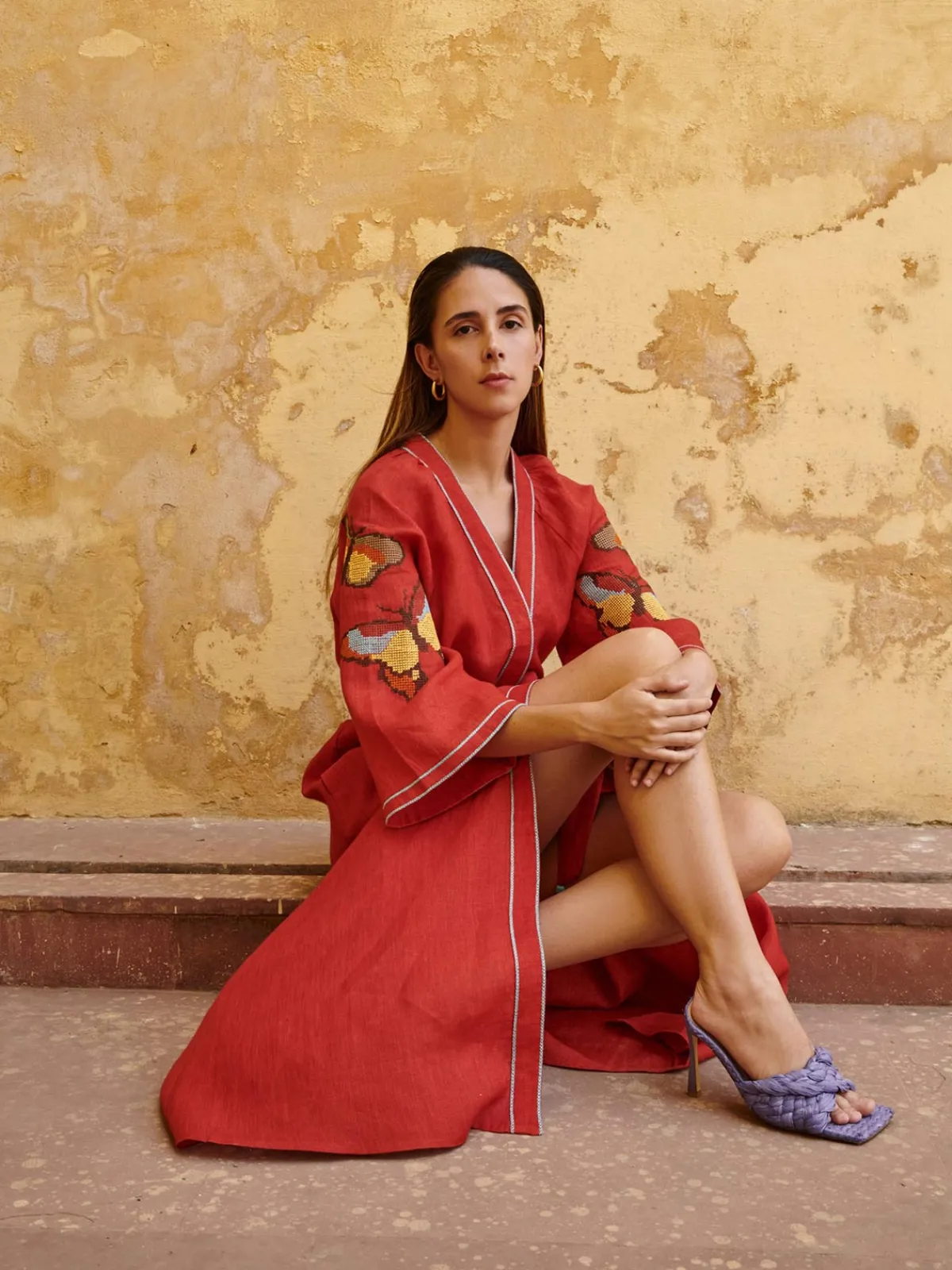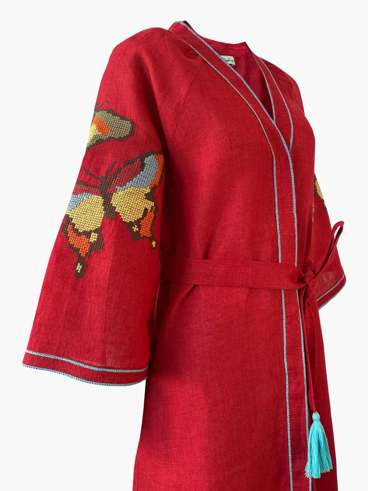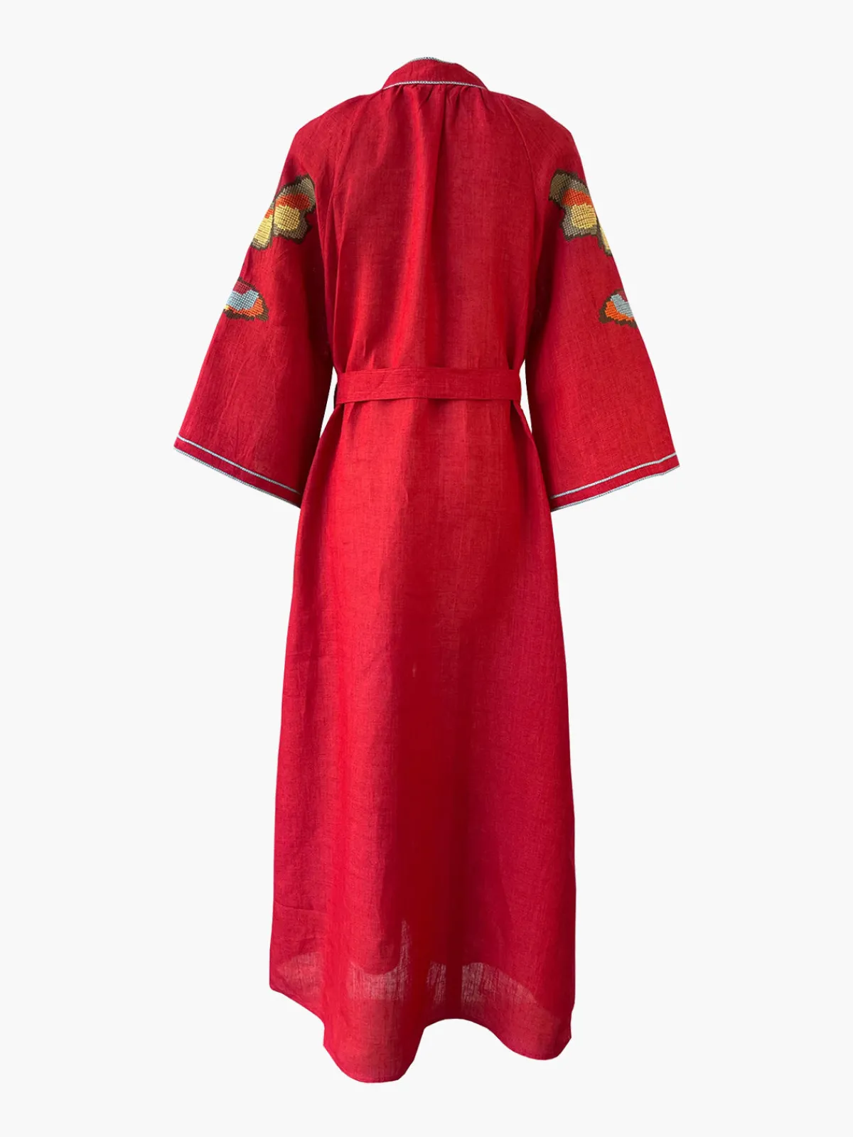 Our De Castro Butterfly Dress features a relaxed fit in a maxi length with wide sleeves, cross stitched embroidery, hidden front buttons, and a tassel belt that ties at the waist. Handcrafted by artisans in India.